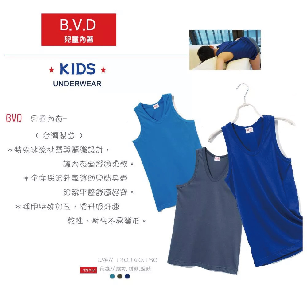 【BVD】兒童涼感速乾綿內衣JYC05背心(敏感肌膚款.台灣製)[BVD]兒童涼爽棉背(保證原廠/敏感幼嫩肌膚指定款/BVD大廠出品/台灣製造) *特殊冰涼棉材質與精工細膩剪裁-幼嫩肌觸低磨擦*直橫雙向編織設計,加分活潑行動力的舒適自在*全件採細針車縫,幼兒貼身更細緻平整舒適好穿。 *採用科技速乾棉材,提升吸汗速乾性,炎夏不悶汗.降低幼童感冒*人體3D剪裁不卡臀、不卡溝,伸展自如。*夏日不悶熱,寶貝必備。 BVD出品特色//吸水速乾、接觸涼感//*尺碼選擇:130碼.140碼150碼 130(適合身高115-135公分/胸圍53-59公分) 140(適合身高125-145公分/胸圍54-62公分) 150(適合身高135-150公分/胸圍54-62公分) *色碼選擇:深藍、淺藍、灰*成份材質:60%棉、34%聚酯纖維、6%彈性纖維*製造產地:台灣製