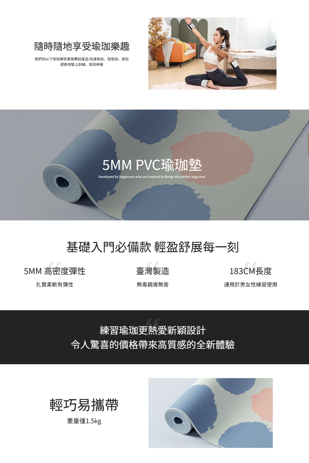 輕薄5mm厚度,可適用於團體課、旅行、或戶外攜帶便利