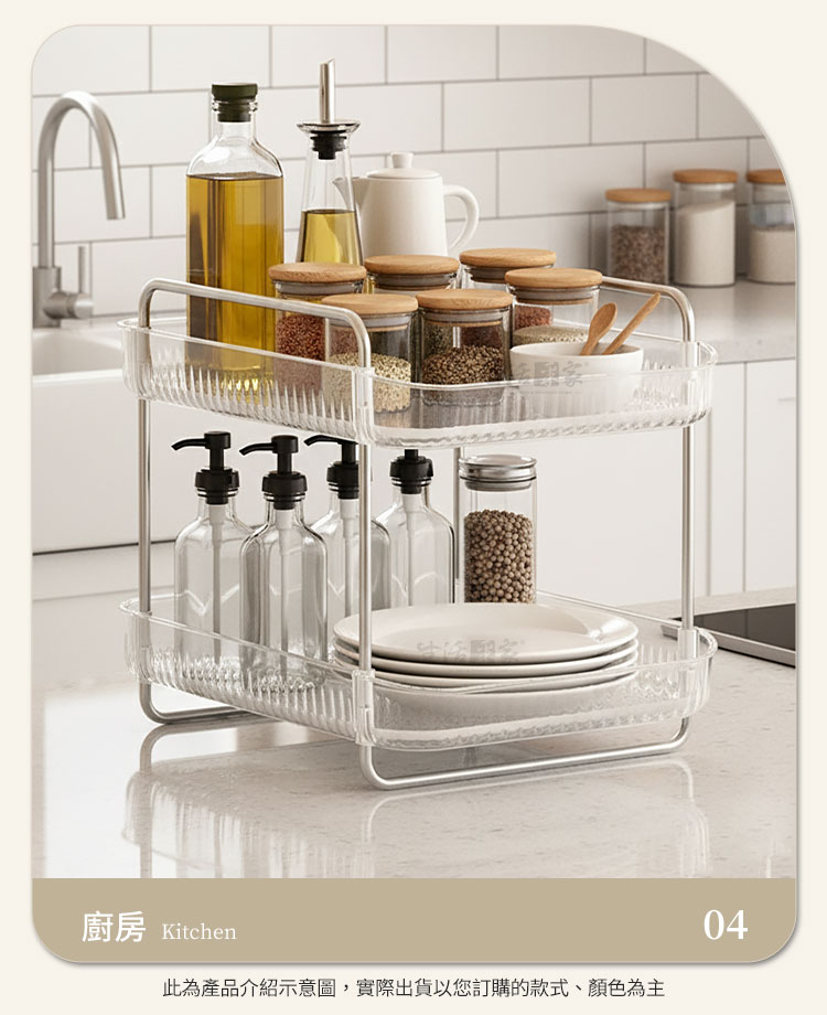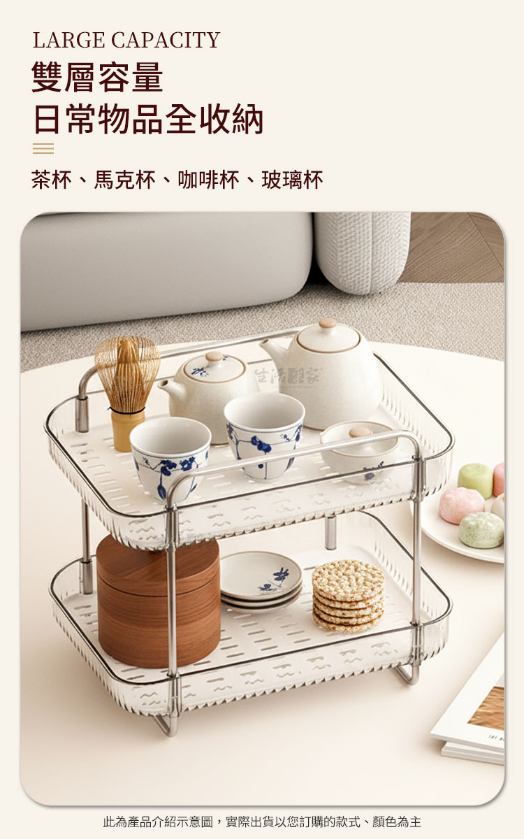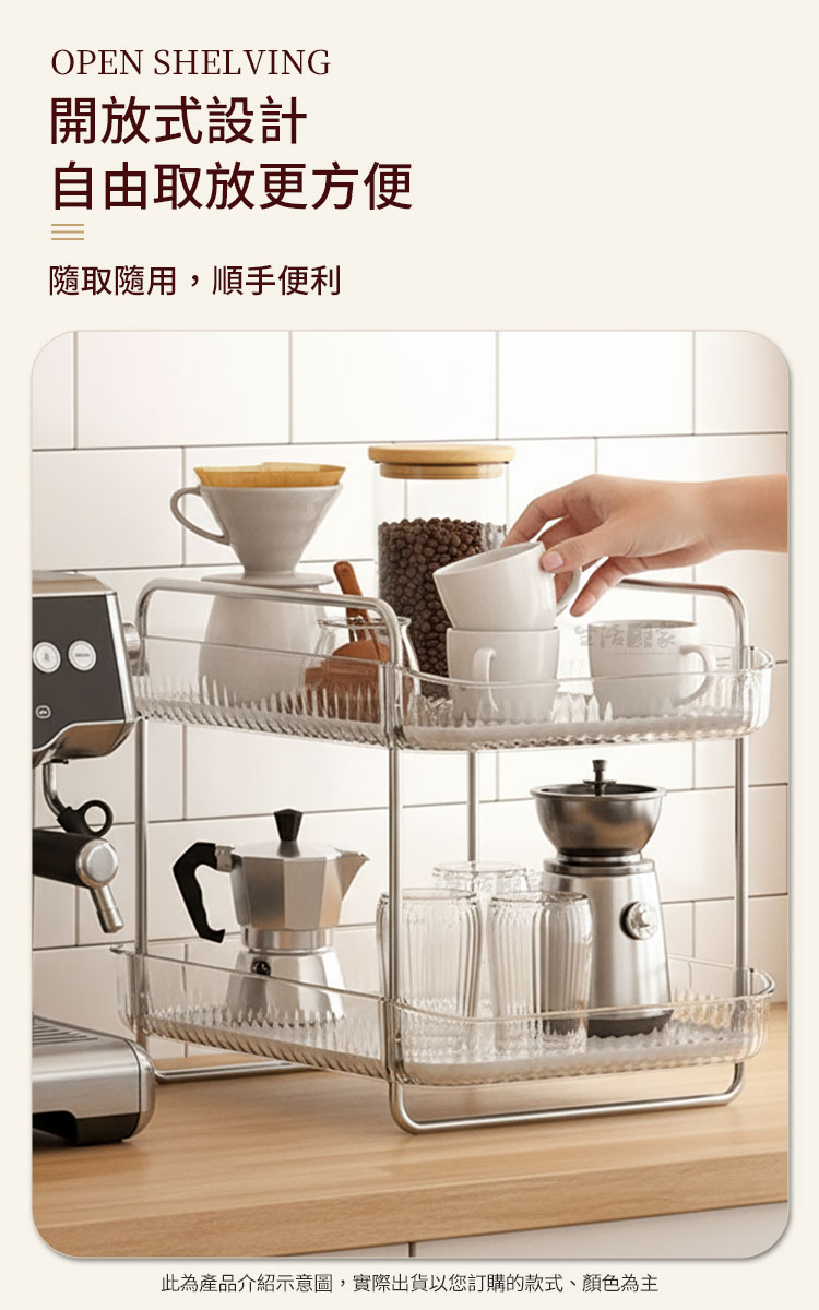 CaféDeck 雙層瀝水收納架|杯具器具的質感收納選擇是否常常因為杯子、咖啡器具、餐具散落而感到凌亂?☕CaféDeck 輕奢風格的雙層瀝水收納置物架,將「收納」與「美感」完美結合,不論是 咖啡角落、廚房、浴室或梳妝台,都能幫助您提升整潔度與空間效率。✅ 雙層容量:可同時收納茶杯、馬克杯、咖啡杯、玻璃杯,空間翻倍更省位。✅ 瀝水設計:底層可快速瀝水,避免積水滋生細菌,保持杯具乾爽。✅ 開放式架構:取放方便,日常使用不費力,讓收納變得更輕鬆。✅ 貼心小掛籃:更是讓小物品有了自己的家,再也不會找不到東西了!🏆🗂️✅ 加高間距:下層間距升級,瓶罐高物也能輕鬆放入。✅ 多功能用途:不僅能放器具杯具,浴室洗漱收納架、梳妝台化妝品架、廚房調味罐收納架也可以。✅ 質感設計:透明托盤搭配金屬框架,北歐風格簡約高級,實用與美觀兼具。💡 使用後你會發現👉生活整齊感提升:每個杯子、餐具都有固定位置,桌面瞬間乾淨。👉時間效率提升:早晨泡咖啡、準備飲品,器具一目了然,快速拿取。👉美感加分:讓收納不再只是功能,而是日常生活的一部分,提升居家氛圍。👉多場景靈活應用:無論是 廚房、浴室、客廳、梳妝台,皆能隨心擺放,打造您的專屬整理角落。✔️想要讓 咖啡器具更整潔、杯具更乾爽,這款 CaféDeck 雙層瀝水收納架 是您不容錯過的選擇!現在就入手,讓生活空間從凌亂走向質感 ✨。#收納好物 #雙層置物架 #咖啡角佈置 #杯具收納 #居家質感生活📣 FAQ (常見問答)Q1:這款收納架可以放多少個杯子?A1:依杯型大小不同,平均可放 6-10 個杯子,還能搭配收納餐具或瓶罐。Q2:適合用在浴室或化妝台嗎?A2:是的,具備瀝水功能與大容量設計,也非常適合收納洗漱用品與化妝品。Q3:收納架容易生鏽嗎?A3:架體採用防鏽材質設計,正常使用下耐用度高,不易生鏽。Q4:清潔方便嗎?A4:可拆卸托盤,輕鬆清洗,避免髒污堆積。Q5:需要組裝嗎?A5:簡單安裝即可完成,無需工具,快速上手。注意事項:1.請勿重摔或高處掉落,以免商品受損。2.請勿接近高溫或勿近火源處,以免商品受損。3.商品情境圖片僅供參考,實際出貨不含週邊道具及配件。4.購買前請先量測使用區域尺寸,確定無誤再購買以免尺寸不合,敬請謹慎選購。5.本商品需自行組裝,收到商品後請確實組裝,無誤後再將東西放入使用!
