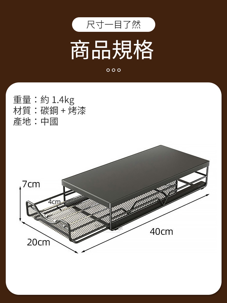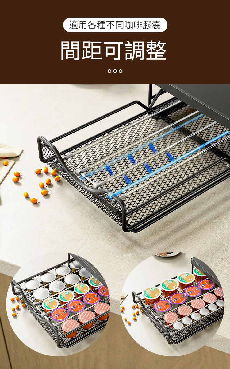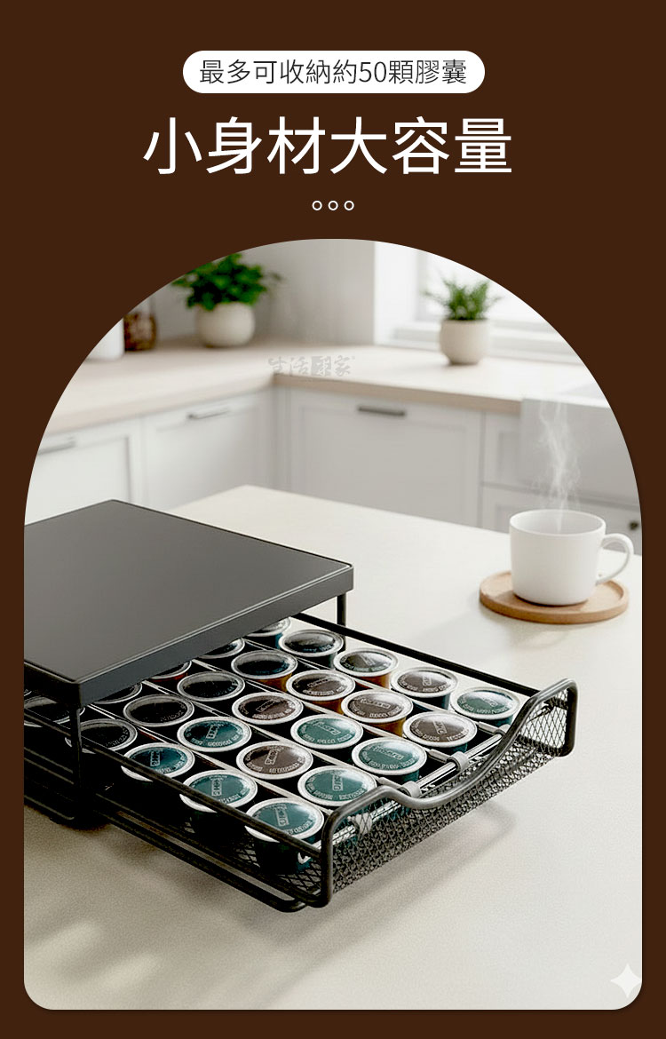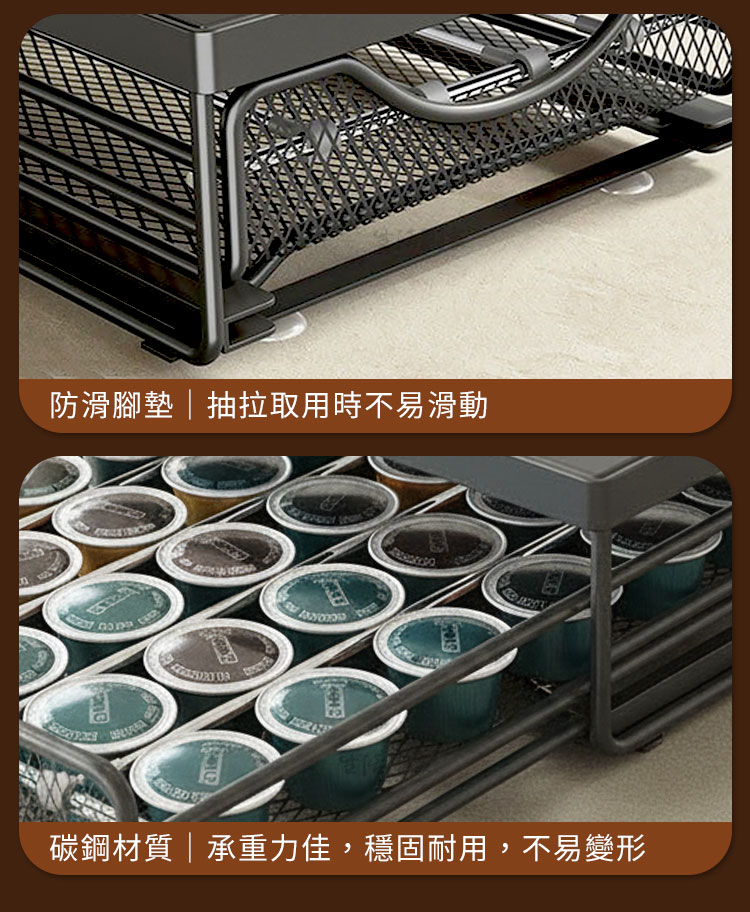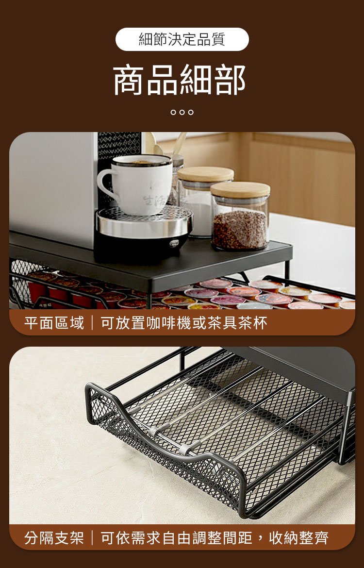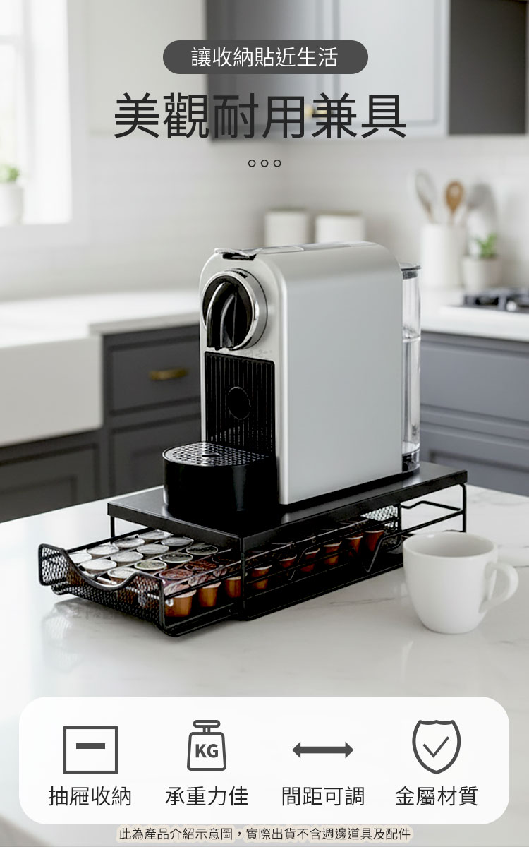 CaféDeck 咖啡膠囊收納抽屜架讓你的每日咖啡時光,更有條理、更具儀式感。在家沖泡一杯咖啡,不只是享受香氣的片刻,更是整理思緒的時光。CaféDeck 將這份「生活的秩序感」帶進你的咖啡角,一體式金屬收納設計,讓咖啡機與膠囊完美整合,既美觀又節省空間。✅ 大容量設計:抽屜式層架最多可收納約 50 顆咖啡膠囊,分類清晰,一眼取用。✅ 加厚金屬材質:採用碳鋼烤漆結構,穩固耐重,長時間使用不變形。✅ 滑順抽屜軌道:滑軌順暢不卡頓,取放膠囊更輕鬆。✅ 間距可調設計:內部可調支架,適用各式不同尺寸膠囊(Nespresso、星巴克等皆可)。✅ 防滑腳墊設計:抽屜拉取時穩定不移位,使用更安心。🌿 使用後你會發現~你的咖啡角變得更整潔、桌面更有質感。早晨泡咖啡時,再也不用翻找膠囊,一拉就取。午後靜謐時光,CaféDeck 為你留住那份慢生活的美好。它不只是咖啡收納,更是一種生活美學的延伸。👉 如果你也是喜歡喝咖啡、追求生活質感的你,這款「CaféDeck 咖啡膠囊收納架」將成為你每日最實用的小角落夥伴。立即收藏,打造屬於你的理想咖啡角!☕#咖啡收納方法 #CaféDeck #咖啡角佈置 #咖啡控必備 #質感生活📣 FAQ (常見問答)Q1:可以放哪些品牌的咖啡膠囊?A1:本架適用市售主流品牌(如 Nespresso、星巴克、illy 等),內部間距可調整。Q2:可承重多少?放咖啡機會不會晃?A2:採加厚碳鋼材質,承重約10公斤,放置家用咖啡機穩固不搖晃。Q3:抽屜會卡嗎?好拉嗎?A3:抽屜滑軌經特殊設計,滑順不卡頓,輕鬆拉取不費力。Q4:需要自行組裝嗎?A4:出貨為整體結構,無需組裝,開箱即可使用。Q5:可以放進櫃子或抽屜裡使用嗎?A5:可以!尺寸約 40×20×7cm,輕巧可放入廚櫃或檯面空間內。注意事項:1.本產品不含咖啡機與膠囊,僅販售收納架本體。2.請放置於平穩檯面上,避免傾斜導致滑動。3.清潔時以乾布或微濕布擦拭,請勿使用腐蝕性清潔劑。4.使用時避免重壓或撞擊,以維持結構穩定。5.本產品為金屬烤漆製,請避免長期接觸水氣或油污。商品規格:1.尺寸:約寬20*深40*高7cm2.材質:碳鋼+烤漆3.重量:約1.4kg/組4.產地:中國5.顏色:黑色6.收納:咖啡用品、咖啡膠囊、茶包、刀叉匙筷等7.適用:廚房、櫥櫃、吧檯、辦公室、茶水間等※商品為人工丈量略有誤差,請以實品為準。※網頁圖片因拍攝關係或螢幕設定不同而會與實際商品略有色差,請以實際收到商品為準。