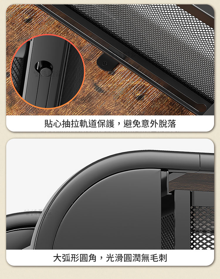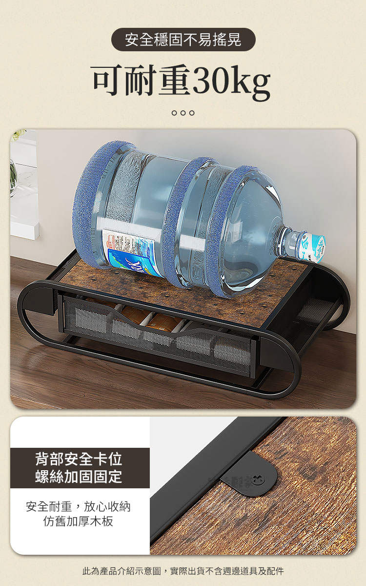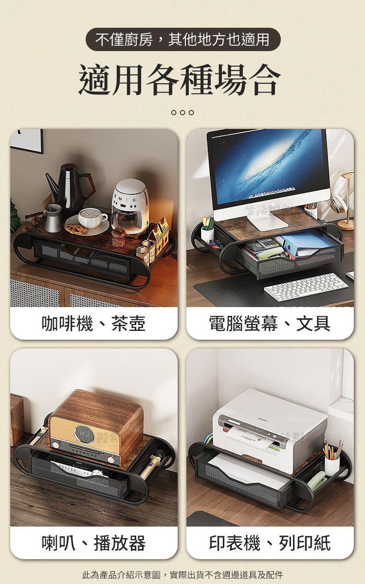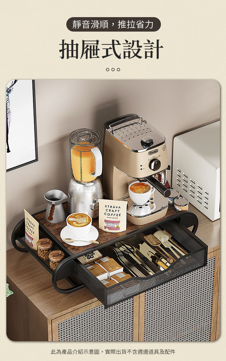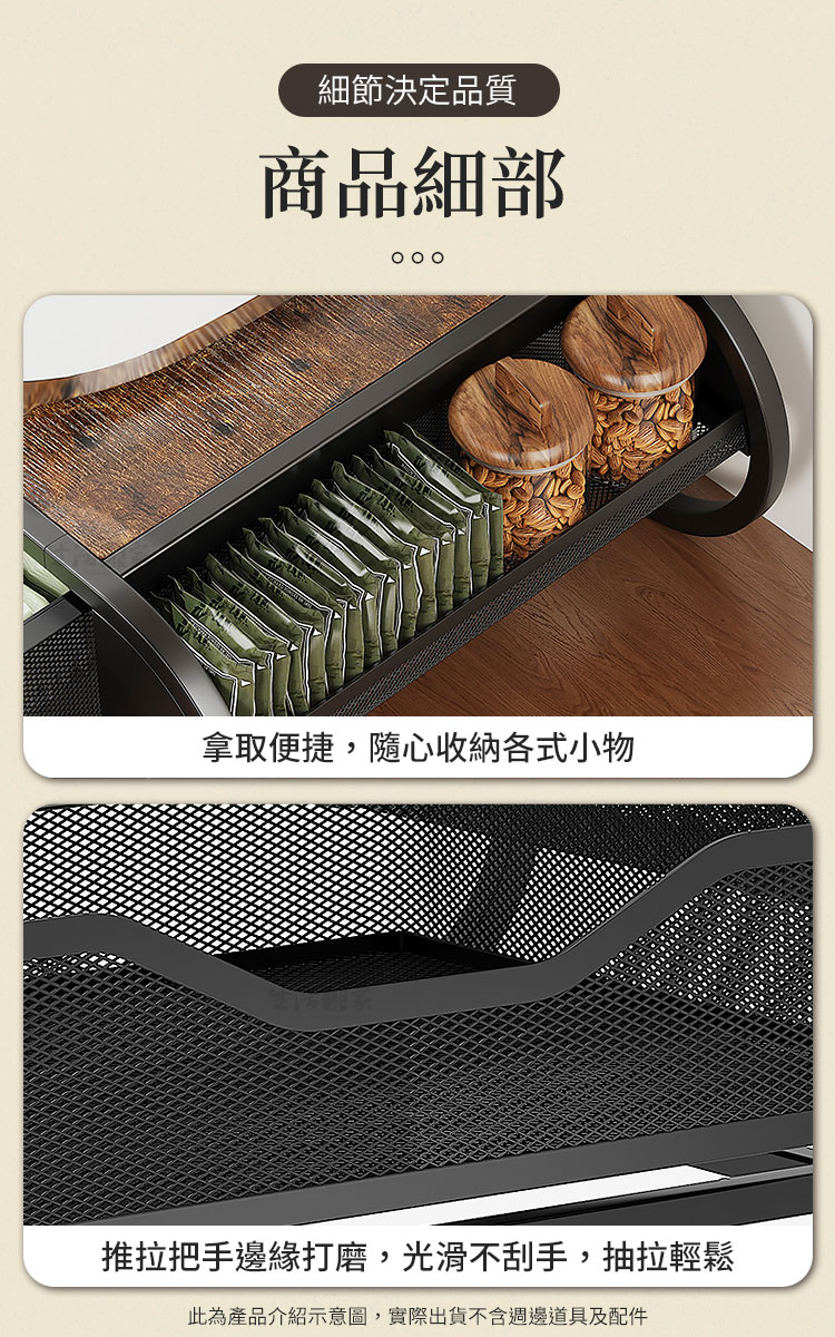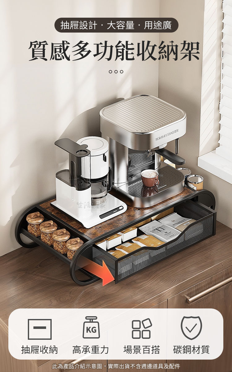 CaféDeck 咖啡茶包抽屜置物架 鐵木質感款|大容量整齊收納+穩固承重+免組裝設計想要讓咖啡角落更整潔、更有質感嗎?☕CaféDeck 鐵木款抽屜置物架,結合鐵藝框架與木紋檯面,不僅能承重咖啡機、烤麵包機,更能輕鬆收納咖啡膠囊、茶包、糖包,讓您的居家或辦公空間瞬間變得乾淨俐落。👉 抽屜式設計|分類整齊不凌亂大容量抽屜可放置咖啡膠囊、茶包、小零食,推拉順暢,收納一目了然。👉 鐵木結合|穩固承重不晃動碳鋼材質+仿舊木紋檯面,可承重高達 30kg,小家電擺放穩固安全。👉 多場景應用|廚房、辦公、咖啡角落皆宜不僅能作為咖啡茶具收納架,也可擺放印表機、文具、音響等,靈活多用。👉 質感設計|簡約百搭美學鐵木搭配黑色曲線框架,提升空間氛圍,打造質感生活角落。🌈 使用後你會發現~✔ 桌面不再雜亂,咖啡角落秒變質感小天地✔ 泡咖啡、泡茶時,茶包糖包伸手即取,更高效率✔ 提升空間利用率,廚房、辦公室都能享受整齊清爽✔ 兼具 收納+承重+美感,一架多用,物超所值如果您正在煩惱咖啡茶具總是散落在桌面上,或者小家電沒有合適的收納空間,那麼 CaféDeck 鐵木款抽屜收納架 正是您需要的答案!✨立即入手,讓您的生活空間更整潔、更有質感。#咖啡角落收納 #茶包抽屜置物架 #鐵木收納架 #桌面整理神器 #CaféDeck📣 FAQ (常見問答)Q1:請問收納架可以承重多少?A1:此款可承重高達 30kg,咖啡機、烤麵包機等小家電都能穩固擺放。Q2:抽屜可以放多少咖啡膠囊或茶包?A2:抽屜為大容量設計,可放置 50~70 個膠囊或茶包,分類整齊好取用。Q3:需要自行組裝嗎?A3:是的,需要自行組裝,內附說明書及零件,組裝不困難哦。Q4:除了咖啡茶具,還能收納什麼?A4:可用於收納文具、零食、印表機列印紙、餐具等,多用途應用。Q5:材質會不會容易生鏽?A5:採用碳鋼烤漆工藝,耐用防潮,正常使用環境下不易生鏽。注意事項:1.請避免長時間放置於潮濕環境,以延長使用壽命。2.承重雖達 30kg,但建議均勻受力,避免單點過重。3.請勿使用尖銳物品刮磨表面,以免影響美觀與防護層。4.商品示意圖僅供參考,出貨不含咖啡機、茶具等配件。5.建議定期清潔,以保持檯面與抽屜整潔衛生。6.商品內附組裝說明書,請組裝無誤後再使用。7.鐵木為天然木材,每片紋路會都會不同,無法指定紋路。