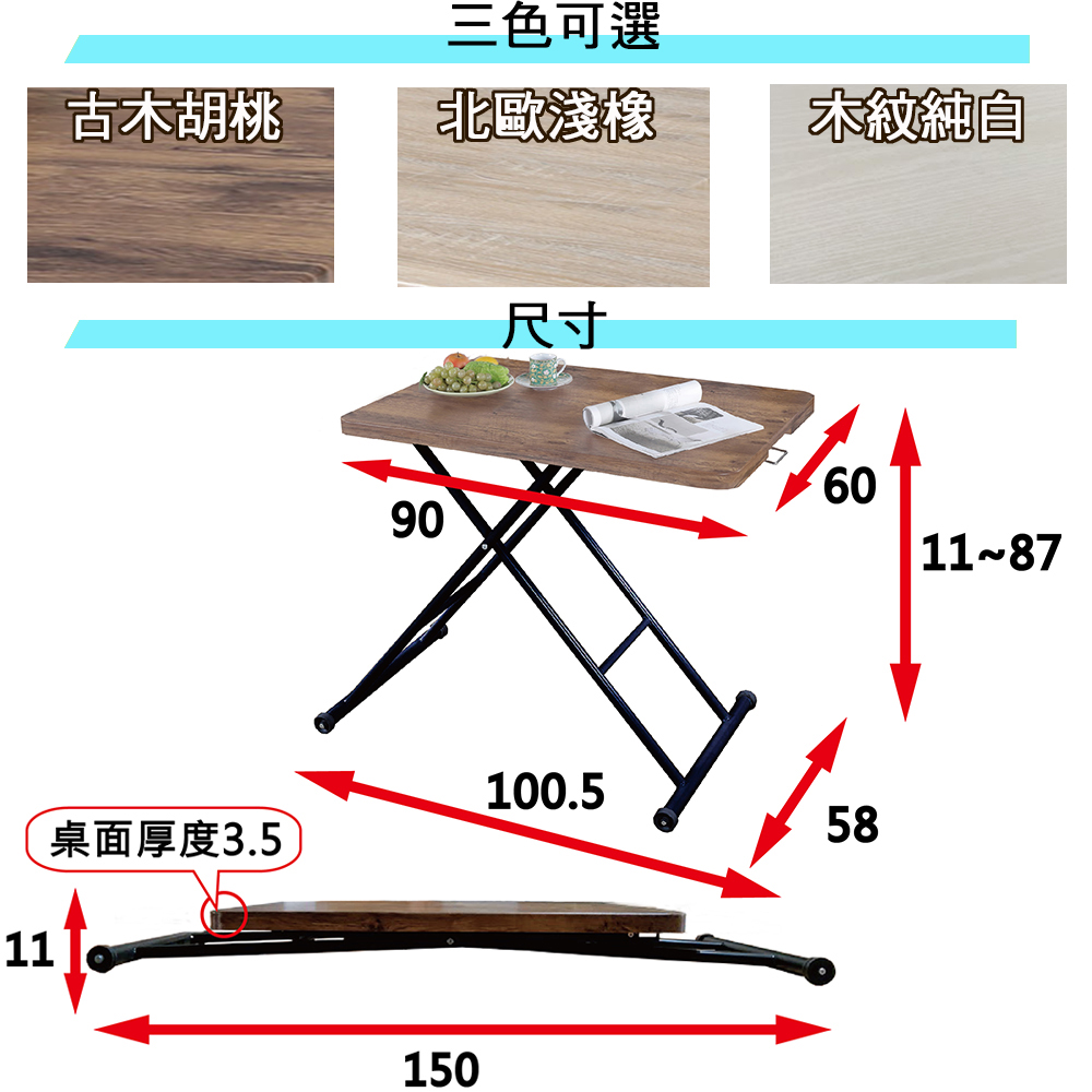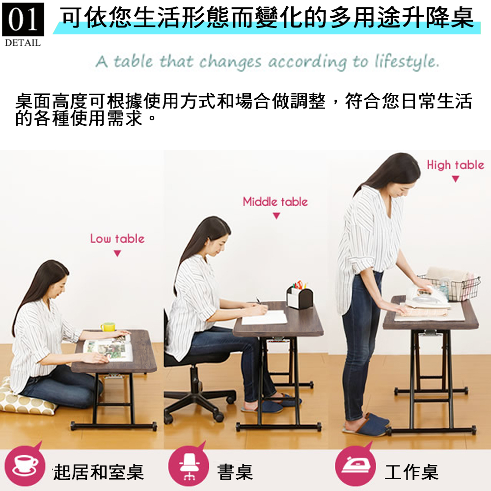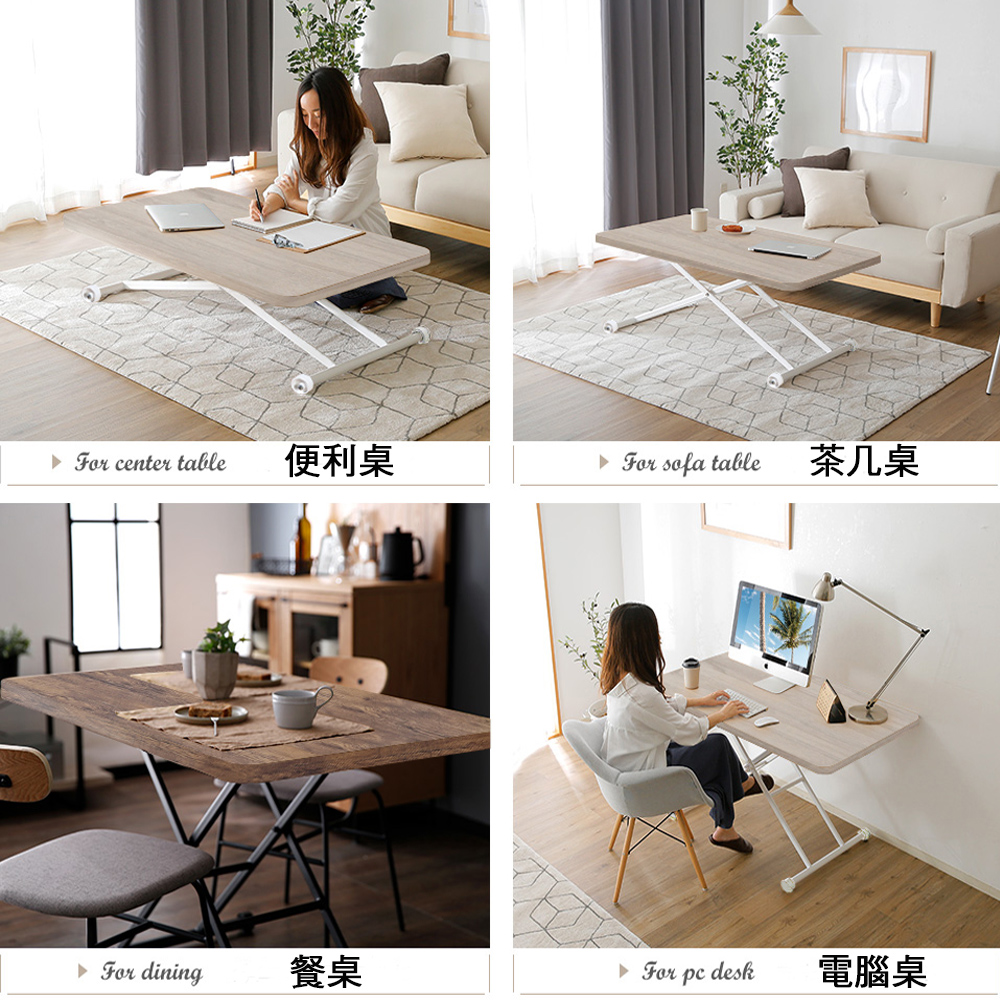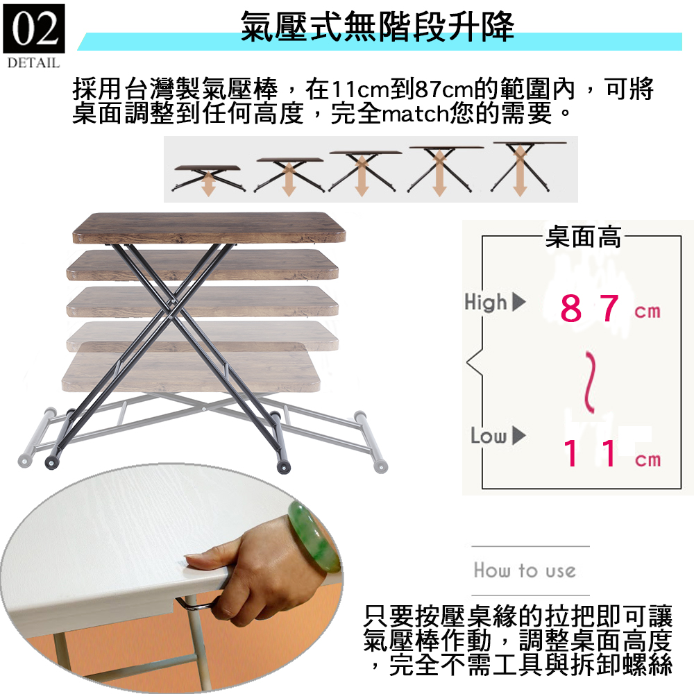 ★全程台灣製造外銷日本同步販售實用氣壓式升降桌,人氣首選!★可依您的生活形態而改變使用狀態的《C&B》中崎氣壓式萬用無段升降桌,採用台灣生產的安全升降式氣壓棒,只要one touch一個動作,將位於桌緣的拉把往上扳並施以足夠重力於桌面,即可讓桌面的高度可以從11cm到87cm之間在任意的高度沒有階段限制的升降,不需要工具也不必拆卸螺絲,完全符合您在任何高度的使用需求,客廳茶几桌、和室桌、起居桌、餐桌、工作桌、書桌、站立桌都很適合。90x60cm恰恰剛好的桌面,適用於各種場合,即使當做兩人世界的餐桌或客廳桌也很洽當,不惜成本使用邊緣加厚至35mm的桌面,單從外觀看在質感上就已經與一般15或18mm桌面有很大區別,四隅都是圓角使用上更為安全,桌面的表面加工使用熱壓成型的浮雕木紋,防刮耐磨防濕,三個顏色都不只能看得見木紋也能摸的到木紋哦。整體支架則採用堅固的鐵管,外表粉體烤漆處理,交叉式的結構穩固耐用耐重佳,氣壓棒為最新型改良式的液態氣壓能緩昇緩降更加安定,單邊腳部有滑輪的貼心設計,無論調整高度或要移動商品時都能輕輕鬆鬆。當桌面調整到最低時,高度只有11cm,便於您不使用時將商品收納到床下或牆角等隙縫處。■商品規格尺寸 : 整體約(寬)100.5~150x(深)60x(高)10~84cm 桌面尺寸90x60cm主要材質 : 鐵管、MDF真空成形板表面浮雕木紋產地 : 台灣■注意事項1.本商品附詳細組裝說明書,需DIY自行組裝。2.DIY商品經組裝後恕不接受退貨,請先確認商品是否符合要求。3.本商品僅配送至送貨地址一樓,無協助配送上樓,若協調司機願意配送上樓可能會有樓層費。4.商品圖檔顏色因電腦螢幕設定差異會略有不同,請以收到的實際商品顏色為準。5.若需退貨,請保持商品及包裝之完整性,無法回復原出貨之完整包裝恕不接受退換貨。6.送達地點有否限制:限本島,外島須外加運費。我們將事先與消費者聯繫報價,議定外島運費後,訂單始成立。7.本島偏遠地區接單說明:物流業者定義之本島偏遠地區接單須另加聯運費。我們將事先與消費者聯繫報價,議定聯運費後,訂單始成立。8.鑑賞期限制說明:溫馨提醒,鑑賞期非試用期, 敬請確認商品無瑕庛問題並確認購買後再使用。9.收到貨品時,要將外箱保留至鑑賞期結束,不要讓貨運公司將外箱帶走,換貨時換貨商品必須是全新狀態(不得有刮傷),並有完整的包裝,包含外紙箱、配件紙箱、保麗龍、保護袋、贈品等所有附隨文件或資料之完整性。10.偏遠地區概略表:以下地區為物流公司定義之偏遠地區,若有增刪以物流公司公告為準。(1).新竹:尖石鄉、五峰鄉 (2).苗栗:泰安鄉 (3).台中:梨山、谷關、環山、和平鄉 (4).南投:鹿谷鄉、仁愛鄉 (5).雲林:古坑鄉 (6).嘉義:阿里山鄉、梅山鄉、嘉義農場 (7).高雄:內門鄉、杉林鄉、甲仙鄉、六龜鄉、甲仙鄉(小林村)、六龜鄉(寶來村) (8).屏東:霧台鄉、春日鄉、泰武鄉、三地門鄉 (9).宜蘭:大同鄉、南澳鄉 (10).花蓮:秀林鄉、池上鄉、海端鄉 (11).台東:長濱鄉、東河鄉(北源村)、台東地區(牧場&監獄)