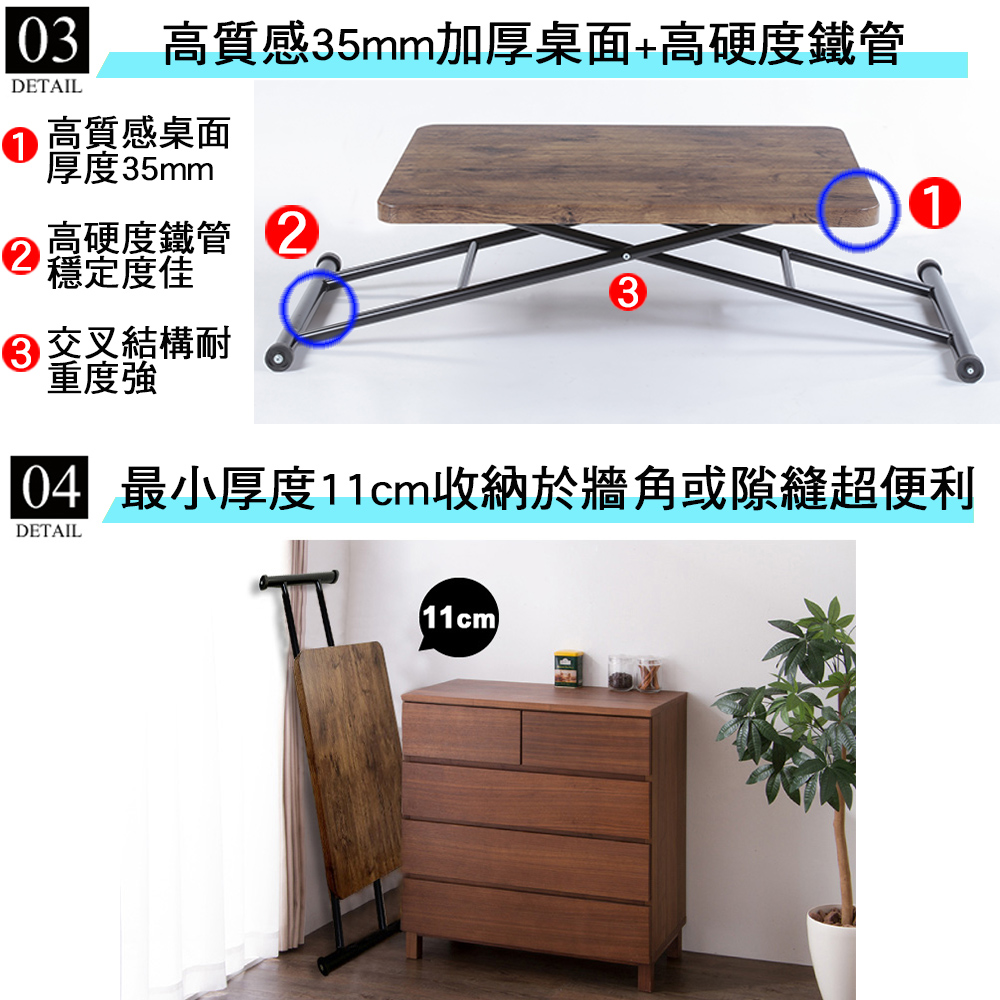 ★全程台灣製造外銷日本同步販售實用氣壓式升降桌,人氣首選!★可依您的生活形態而改變使用狀態的《C&B》中崎氣壓式萬用無段升降桌,採用台灣生產的安全升降式氣壓棒,只要one touch一個動作,將位於桌緣的拉把往上扳並施以足夠重力於桌面,即可讓桌面的高度可以從11cm到87cm之間在任意的高度沒有階段限制的升降,不需要工具也不必拆卸螺絲,完全符合您在任何高度的使用需求,客廳茶几桌、和室桌、起居桌、餐桌、工作桌、書桌、站立桌都很適合。90x60cm恰恰剛好的桌面,適用於各種場合,即使當做兩人世界的餐桌或客廳桌也很洽當,不惜成本使用邊緣加厚至35mm的桌面,單從外觀看在質感上就已經與一般15或18mm桌面有很大區別,四隅都是圓角使用上更為安全,桌面的表面加工使用熱壓成型的浮雕木紋,防刮耐磨防濕,三個顏色都不只能看得見木紋也能摸的到木紋哦。整體支架則採用堅固的鐵管,外表粉體烤漆處理,交叉式的結構穩固耐用耐重佳,氣壓棒為最新型改良式的液態氣壓能緩昇緩降更加安定,單邊腳部有滑輪的貼心設計,無論調整高度或要移動商品時都能輕輕鬆鬆。當桌面調整到最低時,高度只有11cm,便於您不使用時將商品收納到床下或牆角等隙縫處。■商品規格尺寸 : 整體約(寬)100.5~150x(深)60x(高)10~84cm 桌面尺寸90x60cm主要材質 : 鐵管、MDF真空成形板表面浮雕木紋產地 : 台灣■注意事項1.本商品附詳細組裝說明書,需DIY自行組裝。2.DIY商品經組裝後恕不接受退貨,請先確認商品是否符合要求。3.本商品僅配送至送貨地址一樓,無協助配送上樓,若協調司機願意配送上樓可能會有樓層費。4.商品圖檔顏色因電腦螢幕設定差異會略有不同,請以收到的實際商品顏色為準。5.若需退貨,請保持商品及包裝之完整性,無法回復原出貨之完整包裝恕不接受退換貨。6.送達地點有否限制:限本島,外島須外加運費。我們將事先與消費者聯繫報價,議定外島運費後,訂單始成立。7.本島偏遠地區接單說明:物流業者定義之本島偏遠地區接單須另加聯運費。我們將事先與消費者聯繫報價,議定聯運費後,訂單始成立。8.鑑賞期限制說明:溫馨提醒,鑑賞期非試用期, 敬請確認商品無瑕庛問題並確認購買後再使用。9.收到貨品時,要將外箱保留至鑑賞期結束,不要讓貨運公司將外箱帶走,換貨時換貨商品必須是全新狀態(不得有刮傷),並有完整的包裝,包含外紙箱、配件紙箱、保麗龍、保護袋、贈品等所有附隨文件或資料之完整性。10.偏遠地區概略表:以下地區為物流公司定義之偏遠地區,若有增刪以物流公司公告為準。(1).新竹:尖石鄉、五峰鄉 (2).苗栗:泰安鄉 (3).台中:梨山、谷關、環山、和平鄉 (4).南投:鹿谷鄉、仁愛鄉 (5).雲林:古坑鄉 (6).嘉義:阿里山鄉、梅山鄉、嘉義農場 (7).高雄:內門鄉、杉林鄉、甲仙鄉、六龜鄉、甲仙鄉(小林村)、六龜鄉(寶來村) (8).屏東:霧台鄉、春日鄉、泰武鄉、三地門鄉 (9).宜蘭:大同鄉、南澳鄉 (10).花蓮:秀林鄉、池上鄉、海端鄉 (11).台東:長濱鄉、東河鄉(北源村)、台東地區(牧場&監獄)