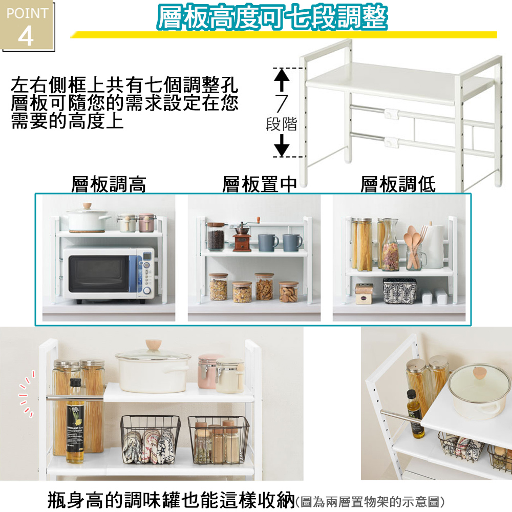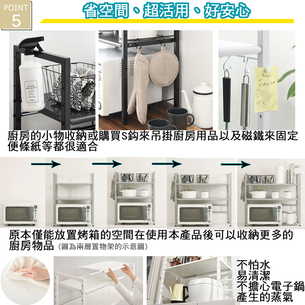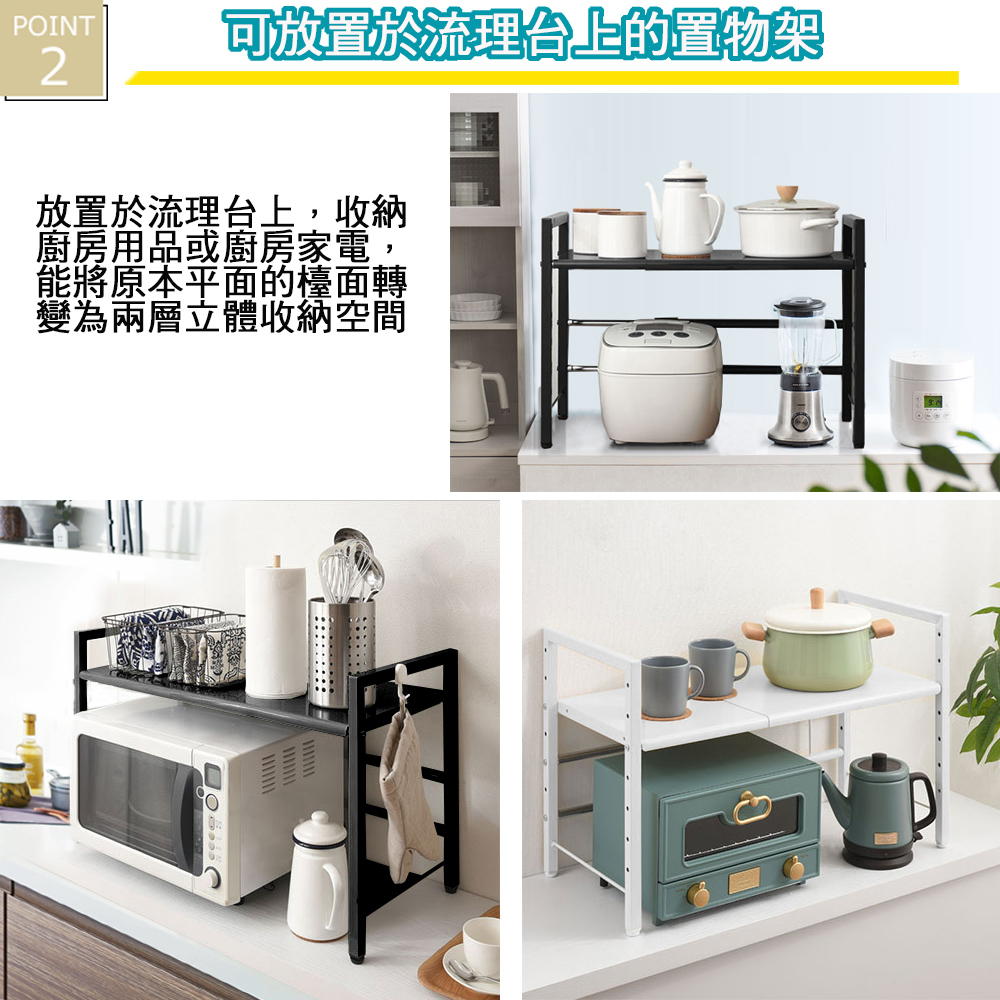 ★台灣生產日本熱銷!超級好用單層伸縮收納層架,可創造兩層收納的立體空間!★水波爐、氣炸桌、生機調理機、麵包機......一直推陳出新的廚房家電用品看起來都很好用,想入手卻怕無處收納嗎? 藍芽設配、3C用品圍繞在您的桌面,但總覺得書桌太小空間有限?那麼您一定需要這個《C&B》元森桌上流理台上伸縮單層置物架,它既不會佔去您太多的空間,又能讓您的流理檯面或桌面多了延伸空間,讓平面頓時變成立體的兩層空間,所有的東西,依使用率、體積,分別放置,一目了然、取用方便,節省空間,再也不怕空間不夠或找不到東西的窘境了!《C&B》元森桌上流理台上伸縮單層置物架,是一組具有一個層板的伸縮置物收納架,總寬度可從45公分~73公分之間伸縮、可依您的需要、桌面或檯面的大小來調整使用,層板的高度則有7段的高度可以選擇,可依您放置的物品大小來調整層板高度,宛如量身訂做一樣適合您的各種使用需求。台灣生產外銷日本好品質,結構穩固耐用,粉體塗裝耐刮耐鏽又防潑水,當調整寬度時鐵管上壓有警告線避免您調整到過寬而垮下,底部調整腳墊設計因可微調高度也能避免放置處的檯面或地面不平,加上輕鬆按壓即可固定住的調整旋鈕,調整寬度不費力,日式貼心與安心家具的設計發揮到極致。■商品規格尺寸 : 約(W)45~73*(D)32.7*(H)44.5cm耐重 : 層板約10KG、角管約5KG、圓管約1KG主要材質 : 鐵板、鐵管重量 : 約4KG產地 : 台灣■注意事項1.本商品附詳細組裝說明書,需DIY自行組裝。2.DIY商品經組裝後恕不接受退貨,請先確認商品是否符合要求。3.商品圖檔顏色因電腦螢幕設定差異會略有不同,請以收到的實際商品顏色為準。4.若需退貨,請保持商品及包裝之完整性,無法回復原出貨之完整包裝恕不接受退換貨。5.送達地點有否限制:限本島,外島須外加運費。我們將事先與消費者聯繫報價,議定外島運費後,訂單始成立。6.本島偏遠地區接單說明:物流業者定義之本島偏遠地區接單須另加聯運費。我們將事先與消費者聯繫報價,議定聯運費後,訂單始成立。7.鑑賞期限制說明:溫馨提醒,鑑賞期非試用期, 敬請確認商品無瑕庛問題並確認購買後再使用。8.收到貨品時,要將外箱保留至鑑賞期結束,不要讓貨運公司將外箱帶走,換貨時換貨商品必須是全新狀態(不得有刮傷),並有完整的包裝,包含外紙箱、配件紙箱、保麗龍、保護袋、贈品等所有附隨文件或資料之完整性。9.偏遠地區概略表:以下地區為物流公司定義之偏遠地區概略(實際以貨運公司定義為準)。(1).新竹:尖石鄉、五峰鄉 (2).苗栗:泰安鄉 (3).台中:梨山、谷關、環山、和平鄉 (4).南投:鹿谷鄉、信義鄉、仁愛鄉 (5).雲林:古坑鄉 (6).嘉義:阿里山鄉、梅山鄉、嘉義農場 (7).高雄:內門鄉、杉林鄉、甲仙鄉、六龜鄉、甲仙鄉(小林村)、六龜鄉(寶來村) (8).屏東:霧台鄉、春日鄉、泰武鄉、三地門鄉 (9).宜蘭:大同鄉、南澳鄉 (10).花蓮:秀林鄉、池上鄉、海端鄉 (11).台東:長濱鄉、東河鄉(北源村)、台東地區(牧場&監獄)