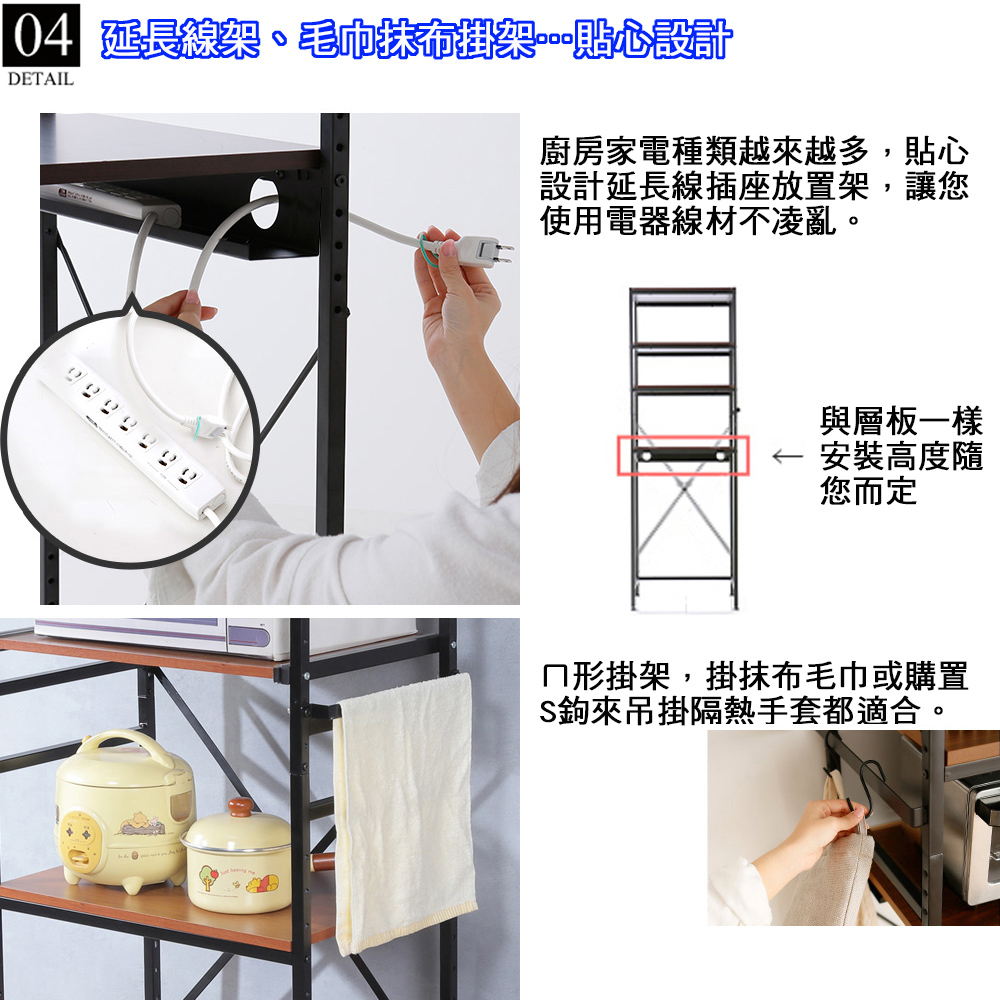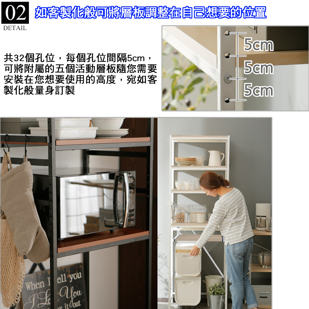環保意識席捲全球,強調機能與外型的日本消費者,都開始回歸最基本的採購需求,設計新穎、簡單實用又兼具質感的商品目前在日本大行其道,《Justice》系列商品就是這波宅經濟的代表商品。《C&B》Justice依得多用途廚房衛浴收納置物架,是日本最新流行的復古『鐵』+『木』的組合商品,黑色或白色烤漆的鐵管與木材紋路的木板,整體營造出工業復古風格,高質感有格調,100%台灣生產,採用符合日本市場要求的板材,表面使用防刮耐潑水的加硬美耐板處理,鐵管則是高質感的粉體塗裝烤漆,無論是層板的用料或鐵管的厚度與規格皆是外銷商品的要求,質感佳耐用性強。可依自己本身需要調整是本商品的設計重點,側框從上到下共有32個孔位可供安裝層板,您可自行決定將四個層板與一個拉板安裝在任一個您想安裝的高度,完全符合您自身的使用需求,客製化般的貼心猶如量身訂做。層板尺寸56x40cm適用於所有的廚房家電,因為層板可以調整在任何的高度,廚房的各種家電無論現在正夯的氣炸鍋還是烤箱與微波爐都可收納,有上蓋的炊飯鍋或熱水瓶更可放置於活動拉板上,除了活動板還有多達4片的移動層板,廚房所有物品都能完整收納,絕對是最稱職的廚房置物架,擺放於洗衣室或衛浴空間內也非常適當哦。此外,有ㄇ形掛架能吊掛抹布毛巾或隔熱手套,在層板下方也設計了一個延長線插座放置架,在廚房家電種類越來越多的今日,貼心設計讓您使用電器線材不凌亂。收納力:1. 置物層板x42. 活動拉板x13. ㄇ形掛架x1 4. 延長線插座放置架x1機能性:1. 所有層板皆可調整使用位置共32段可調整2. 底部調整腳墊,可微調高度防止地面不平設計性:1. 工業風格兩種異素材的搭配,造型優雅2. 流行的外表,放置於室內使用提升質感■商品規格尺寸 : 約(W)60~64(ㄇ形掛架)*(D)40~73(拉板拉出後)*(H)181CM主要材質 : 鐵管(粉體塗裝)、高密度塑合板(表面美耐或PVC皮處理)產地 : 台灣■注意事項1.本商品附詳細組裝說明書,需DIY自行組裝。2.DIY商品經組裝後恕不接受退貨,請先確認商品是否符合要求。3.本商品僅配送至送貨地址一樓,無協助配送上樓,若司機願意配送上樓可能會有樓層費。4.商品圖檔顏色因電腦螢幕設定差異會略有不同,請以收到的實際商品顏色為準。5.若需退貨,請保持商品及包裝之完整性,無法回復原出貨之完整包裝恕不接受退換貨。6.送達地點有否限制:限本島,外島須外加運費。我們將事先與消費者聯繫報價,議定外島運費後,訂單始成立。7.本島偏遠地區接單說明:物流業者定義之本島偏遠地區接單須另加聯運費。我們將事先與消費者聯繫報價,議定聯運費後,訂單始成立。8.鑑賞期限制說明:溫馨提醒,鑑賞期非試用期, 敬請確認商品無瑕庛問題並確認購買後再使用。9.收到貨品時,要將外箱保留至鑑賞期結束,不要讓貨運公司將外箱帶走,換貨時換貨商品必須是全新狀態(不得有刮傷),並有完整的包裝,包含外紙箱、配件紙箱、保麗龍、保護袋、贈品等所有附隨文件或資料之完整性。10.偏遠地區概略表:以下地區為物流公司定義之偏遠地區,若有增刪皆以物流公司的認定為準。(1).新竹:尖石鄉、五峰鄉 (2).苗栗:泰安鄉 (3).台中:梨山、谷關、環山、和平鄉 (4).南投:鹿谷鄉、仁愛鄉 (5).雲林:古坑鄉 (6).嘉義:阿里山鄉、梅山鄉、嘉義農場 (7).高雄:內門鄉、杉林鄉、甲仙鄉、六龜鄉、甲仙鄉(小林村)、六龜鄉(寶來村) (8).屏東:霧台鄉、春日鄉、泰武鄉、三地門鄉 (9).宜蘭:大同鄉、南澳鄉 (10).花蓮:秀林鄉、池上鄉、海端鄉 (11).台東:長濱鄉、東河鄉(北源村)、台東地區(牧場&監獄)