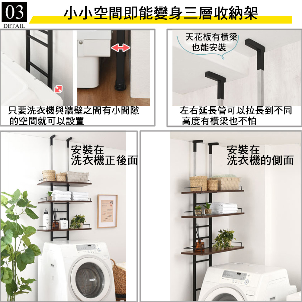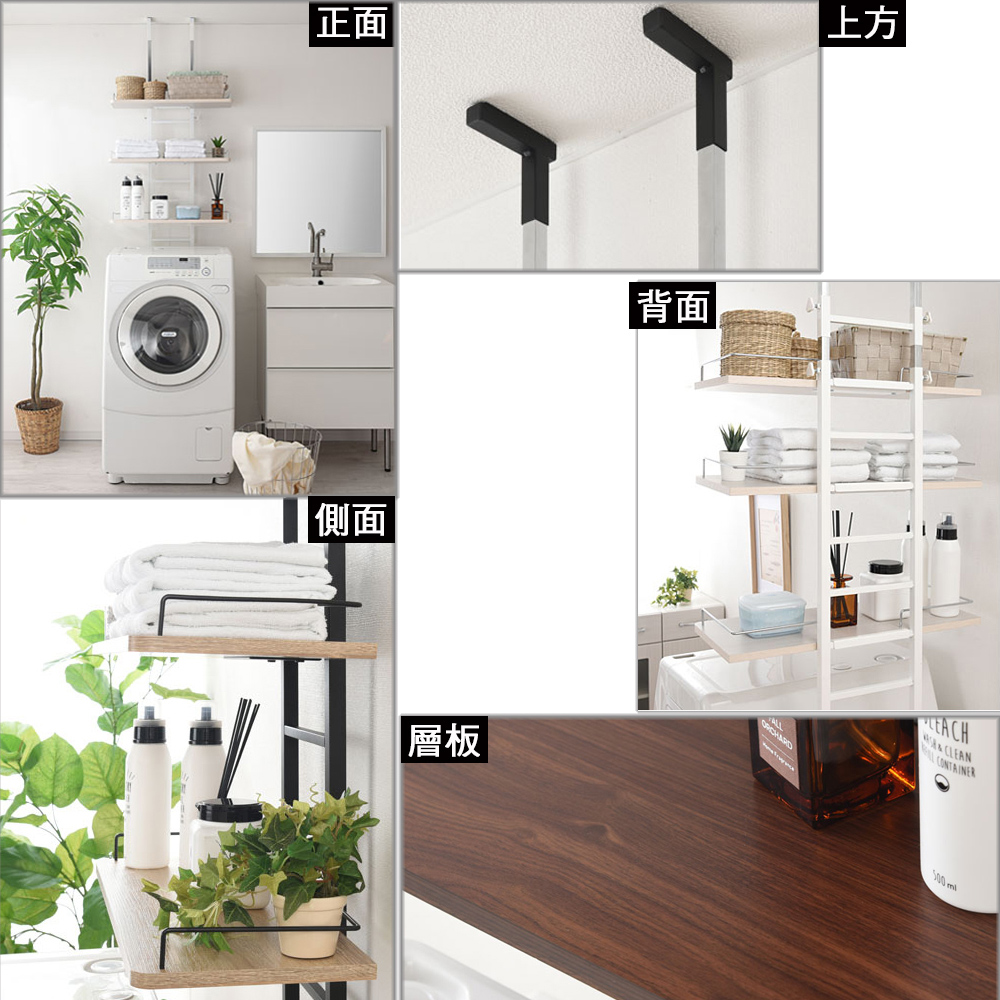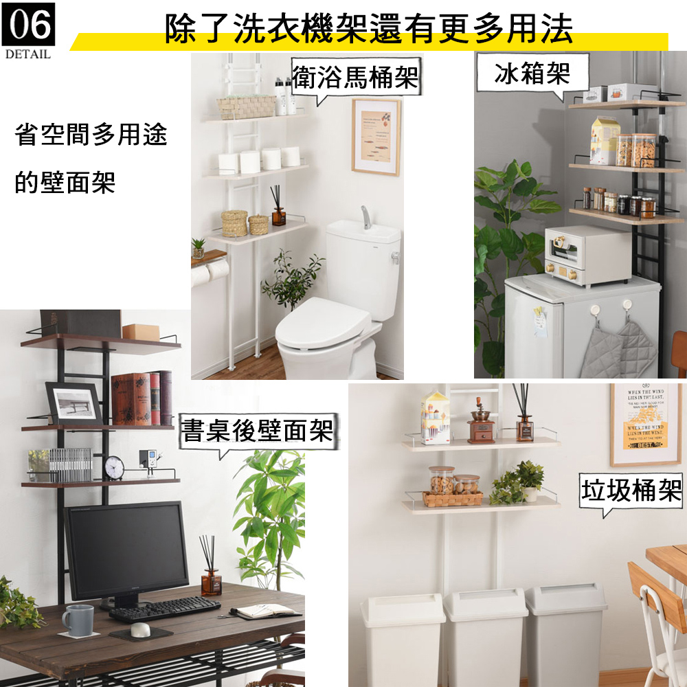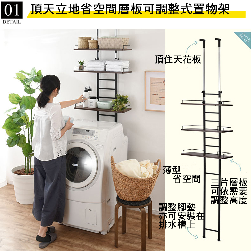 若總高度不足可購買加長管去更換喔,總高度約可到325CM,請洽詢廠商!《C&B》頂天立地壁面多用途衛浴洗衣機置物架,是日本針對現今居家空間的收納需求所設計出來的實用好物,並在日本購物網站的銷售排行榜常佔領前幾名的銷售佳績,『鐵』+『木』的組合,整體營造出工業風格,高質感有格調,100%台灣生產,採用符合日本市場要求的板材,防刮耐潑水易清理,鐵管則是高質感的粉體塗裝烤漆,無論是層板的用料或鐵管的厚度與規格皆是外銷商品的要求,質感佳耐用性強。頂天立地式壁面層架極省空間是本商品的設計重點,從天花板到地板穩穩支撐著,不須大興土木也不用於牆壁鑽孔破壞牆面,不必刻意選擇安裝場地,只要在洗衣機與牆壁之間留下比鐵管的寬度再多一點點的距離即可設置,讓您在洗衣機上方原本利用不到的空間多了三層的置物層架,層板高度可以調整,可以與不同樣式的洗衣機搭配使用。因為是壁面層架的概念,因此除了洗衣機架之外,也十分適合與冰箱、流理台、馬桶、書桌等搭配使用,充分利用上面本來無法使用的空間,人人都會是收納達人哦。收納力:1. 活動置物層板x32. 自己創造收納空間機能性:1. 層板高度可調整2. 底部調整腳墊,可微調高度防止地面不平,亦適用於日式排水槽3. 頂天立地安裝簡單,不用破壞牆面設計性:1. 工業風格兩種異素材的搭配,造型優雅2. 簡潔的外表,放置於室內或工作陽台都沒有違和感■商品規格尺寸 : 約(W)60 x (D)27.4 x (H)206~266cm (高度不足者可聯繫組裝說明書內的廠商資料購買60公分加長管,最高可增高至326cm以內)重量 : 約10KG主要材質 : 鐵管(粉體塗裝與電鍍)、塑合板(表面PVC防水處理)產地 : 台灣■注意事項1.本商品附詳細組裝說明書,需DIY自行組裝。2.DIY商品經組裝後恕不接受退貨,請先確認商品是否符合要求。3.商品圖檔顏色因電腦螢幕設定差異會略有不同,請以收到的實際商品顏色為準。4.若需退貨,請保持商品及包裝之完整性,無法回復原出貨之完整包裝恕不接受退換貨。5.送達地點有否限制:限本島,外島須外加運費。我們將事先與消費者聯繫報價,議定外島運費後,訂單始成立。6.本島偏遠地區接單說明:物流業者定義之本島偏遠地區接單須另加聯運費。我們將事先與消費者聯繫報價,議定聯運費後,訂單始成立。7.鑑賞期限制說明:溫馨提醒,鑑賞期非試用期, 敬請確認商品無瑕庛問題並確認購買後再使用。8.收到貨品時,要將外箱保留至鑑賞期結束,不要讓貨運公司將外箱帶走,換貨時換貨商品必須是全新狀態(不得有刮傷),並有完整的包裝,包含外紙箱、配件紙箱、保麗龍、保護袋、贈品等所有附隨文件或資料之完整性。9.偏遠地區概略表:以下地區為物流公司定義之偏遠地區,若有增刪皆以物流公司的認定為準。(1).新竹:尖石鄉、五峰鄉 (2).苗栗:泰安鄉 (3).台中:梨山、谷關、環山、和平鄉 (4).南投:鹿谷鄉、仁愛鄉 (5).雲林:古坑鄉 (6).嘉義:阿里山鄉、梅山鄉、嘉義農場 (7).高雄:內門鄉、杉林鄉、甲仙鄉、六龜鄉、甲仙鄉(小林村)、六龜鄉(寶來村) (8).屏東:霧台鄉、春日鄉、泰武鄉、三地門鄉 (9).宜蘭:大同鄉、南澳鄉 (10).花蓮:秀林鄉、池上鄉、海端鄉 (11).台東:長濱鄉、東河鄉(北源村)、台東地區(牧場&監獄)