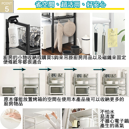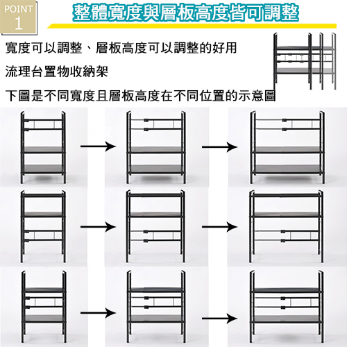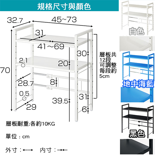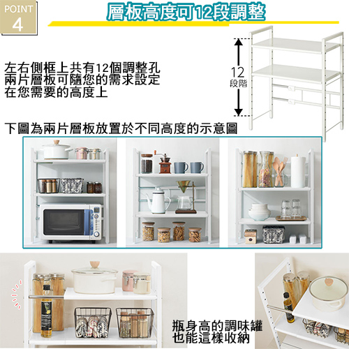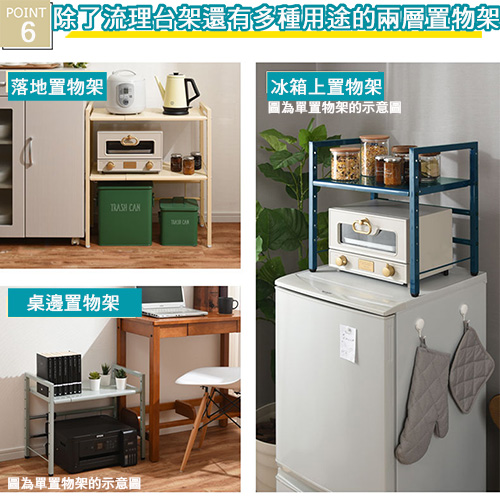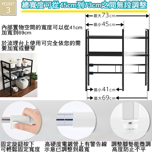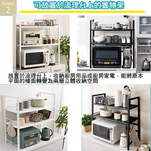 ★台灣生產日本熱銷!超級好用伸縮兩層收納層架,可創造出三層收納的立體空間!★水波爐、氣炸桌、生機調理機、麵包機......一直推陳出新的廚房家電用品看起來都很好用,想入手卻怕無處收納嗎? 藍芽設配、3C用品圍繞在您的桌面,但總覺得書桌太小空間有限?那麼您一定需要這個《C&B》元森桌上流理台上伸縮兩層置物架,它既不會佔去您太多的空間,又能讓您的流理檯面或桌面多了延伸空間,讓平面頓時變成立體的三層空間,所有的東西,依使用率、體積,分別放置,一目了然、取用方便,節省空間,再也不怕空間不夠或找不到東西的窘境了!《C&B》元森桌上流理台上伸縮兩層置物架,是一組具有兩個層板的伸縮置物收納架,總寬度可從45公分~73公分之間伸縮、可依您的需要、桌面或檯面的大小來調整使用,層板的高度則有12段的高度可以選擇,可依您放置的物品大小來調整層板高度,宛如量身訂做一樣適合您的各種使用需求。台灣生產外銷日本好品質,結構穩固耐用,粉體塗裝耐刮耐鏽又防潑水,當調整寬度時鐵管上壓有警告線避免您調整到過寬而垮下,底部調整腳墊設計因可微調高度也能避免放置處的檯面或地面不平,加上輕鬆按壓即可固定住的調整旋鈕,調整寬度不費力,日式貼心與安心家具的設計發揮到極致。■商品規格尺寸 : 約(W)45~73*(D)32.7*(H)70cm耐重 : 層板約10KG、角管約5KG、圓管約1KG主要材質 : 鐵板、鐵管重量 : 約6KG產地 : 台灣■注意事項1.本商品附詳細組裝說明書,需DIY自行組裝。2.DIY商品經組裝後恕不接受退貨,請先確認商品是否符合要求。3.商品圖檔顏色因電腦螢幕設定差異會略有不同,請以收到的實際商品顏色為準。4.若需退貨,請保持商品及包裝之完整性,無法回復原出貨之完整包裝恕不接受退換貨。5.送達地點有否限制:限本島,外島須外加運費。我們將事先與消費者聯繫報價,議定外島運費後,訂單始成立。6.本島偏遠地區接單說明:物流業者定義之本島偏遠地區接單須另加聯運費。我們將事先與消費者聯繫報價,議定聯運費後,訂單始成立。7.鑑賞期限制說明:溫馨提醒,鑑賞期非試用期, 敬請確認商品無瑕庛問題並確認購買後再使用。8.收到貨品時,要將外箱保留至鑑賞期結束,不要讓貨運公司將外箱帶走,換貨時換貨商品必須是全新狀態(不得有刮傷),並有完整的包裝,包含外紙箱、配件紙箱、保麗龍、保護袋、贈品等所有附隨文件或資料之完整性。9.偏遠地區概略表:以下地區為物流公司定義之偏遠地區概略(實際以貨運公司定義為準)。(1).新竹:尖石鄉、五峰鄉 (2).苗栗:泰安鄉 (3).台中:梨山、谷關、環山、和平鄉 (4).南投:鹿谷鄉、信義鄉、仁愛鄉 (5).雲林:古坑鄉 (6).嘉義:阿里山鄉、梅山鄉、嘉義農場 (7).高雄:內門鄉、杉林鄉、甲仙鄉、六龜鄉、甲仙鄉(小林村)、六龜鄉(寶來村) (8).屏東:霧台鄉、春日鄉、泰武鄉、三地門鄉 (9).宜蘭:大同鄉、南澳鄉 (10).花蓮:秀林鄉、池上鄉、海端鄉 (11).台東:長濱鄉、東河鄉(北源村)、台東地區(牧場&監獄)