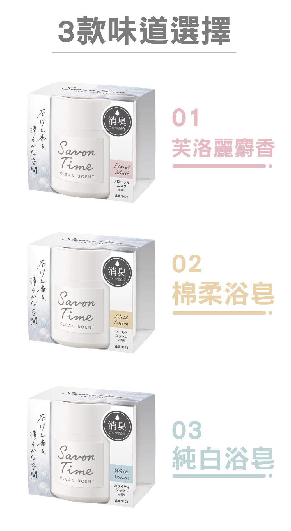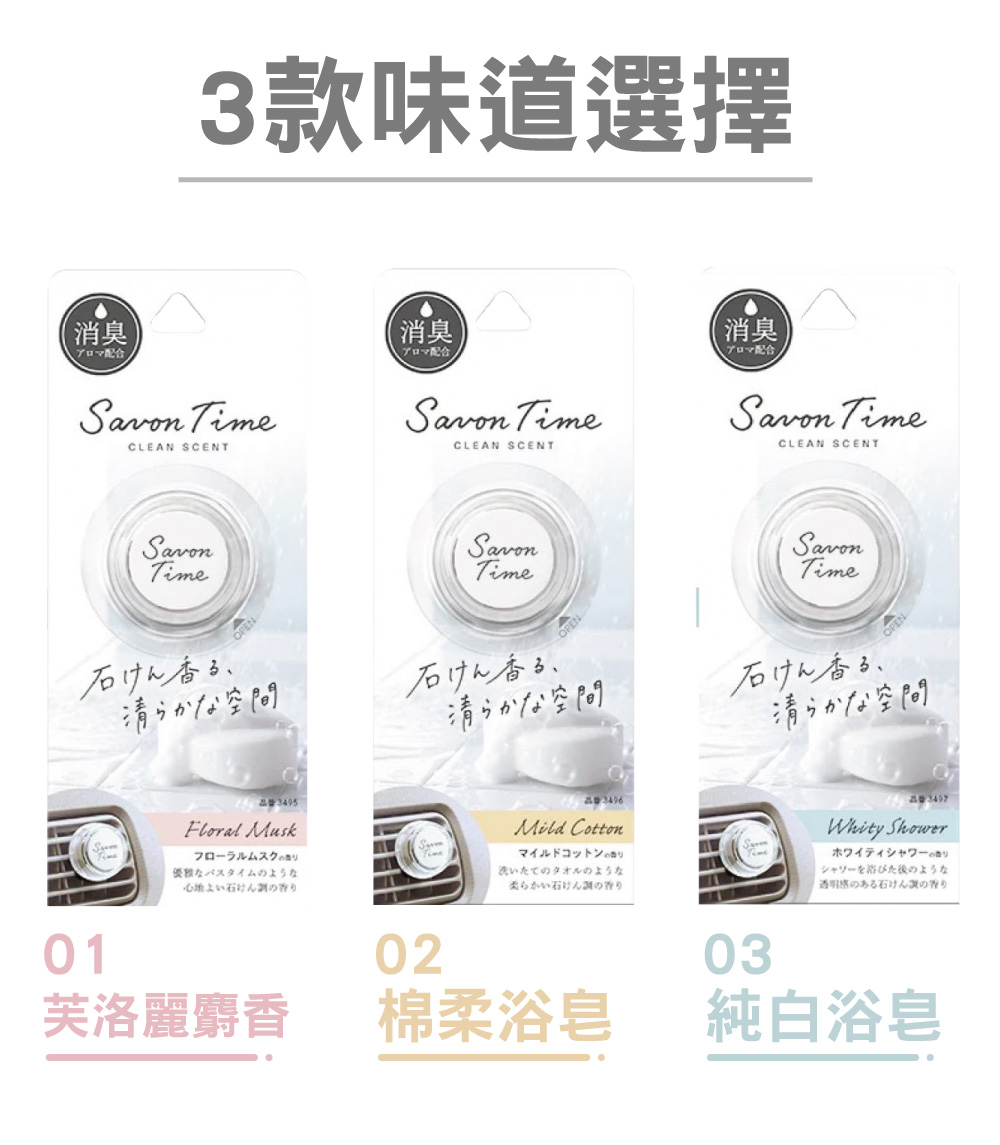 商品介紹‧ 純白簡約設計,創造車內簡潔的空間。‧ 固體式芳香劑,不擔心翻倒溢出。‧ 含有除臭香氣和植物除臭成分。‧ 車內、房間、廁所、客廳等車用、居家都適宜。‧ 輕巧瓶身,可放置杯架、門邊或車內任何空間。使用方式1.打開瓶蓋移除內面遮蓋,並重新栓回上蓋。2.選擇車內平坦處並用中性清潔劑擦拭乾淨。3.使用內附雙面膠固定瓶罐即可。3種氣味可供選擇‧ 芙洛麗麝香-令人愉悅的皂香,就像優雅的沐浴時光。‧ 棉柔浴皂-輕新柔軟的皂香,就像剛洗好的毛巾一樣。‧ 純白浴皂-清透柔和的皂香,就像剛沐浴完的清新感。規格說明‧ 品名:CARALL Savon Time 消臭芳香劑‧ 香味:芙洛麗麝香/棉柔浴皂/純白浴皂‧ 產地:日本製造‧ 容量:156g(含包裝)注意事項‧ 不可食用。‧ 請放置嬰幼兒不易拿取處。‧ 請遠離火源。‧ 放置陰涼處。