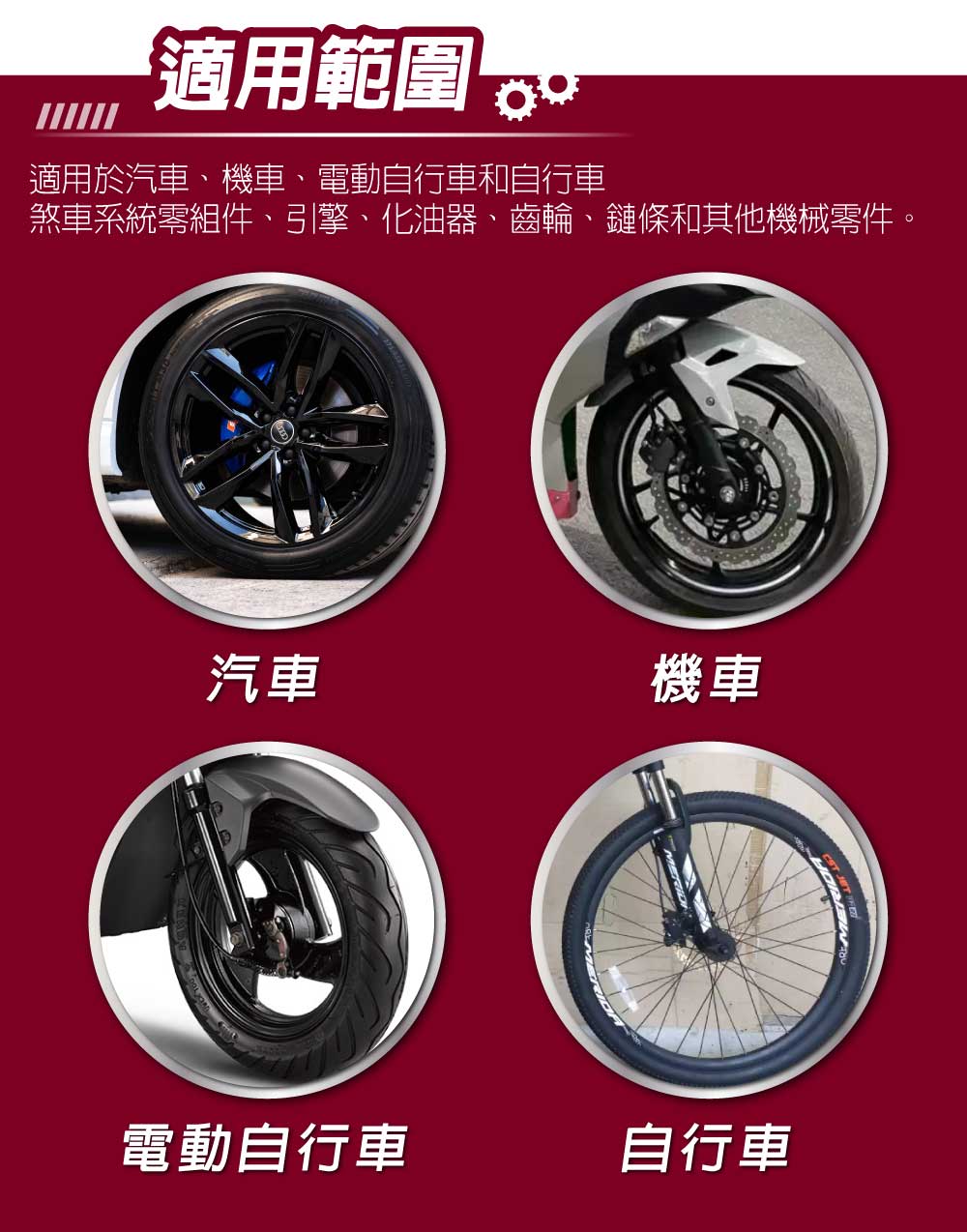 商品介紹‧設計用於清潔煞車系統粉塵、油污、油脂和其他污染物。‧具有快速乾燥、無氯和無腐蝕性的配方,可安全使用煞車系統零件。‧能夠溶解和去除頑固的污垢,使零件看起來和功能如同新的一樣。‧適用於煞車系統零組件、引擎、化油器、齒輪、鏈條和其他機械零件。‧煞車系統零組件:煞車碟盤、煞車鼓、煞車分泵、來令片與煞車蹄片等。使用方式※建議準備適合的容器,盛接噴灑時滴落的清潔劑及髒污。1.使用前確定煞車零件是冷卻狀態。2.大量噴灑到零件表面上,清除塵垢和油酯,並等乾燥。3.特別頑固的污垢,可多噴灑幾回並搭配刷子輔助清潔。4.最後再使用乾淨的布將表面擦乾即完成。規格說明‧品牌:Carlube凱路‧品名:Brake & Parts Cleaner煞車零件清潔劑‧容量:400ml/罐‧製造商:英國Tetrosyl公司注意事項‧使用於橡膠、塑膠部分與塗漆表面前,請先在不明顯處先測試是否相容。‧勿噴灑於發燙的零件上。‧本品屬於易燃品,請遠離熱源。‧反覆接觸情況下,可能造成皮膚乾裂。‧使用時確保良好通風環境。‧避免陽光照射或暴露於環境溫度高於50℃處。‧請勿刺穿或燃燒,用完後的空罐也如此。‧請避免讓孩童接觸,若不慎觸及眼睛請以大量清水沖洗並就醫檢查。