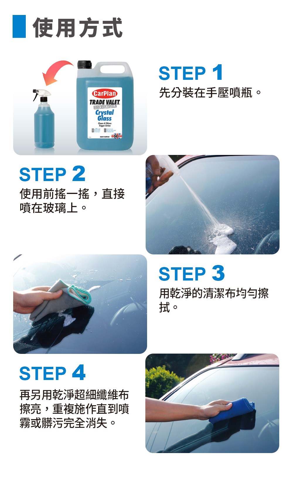 使用方法1.先分裝在手壓噴瓶。2.使用前搖一搖,直接噴在玻璃上。3.用乾淨的清潔布均勻擦拭。4.再另用乾淨超細纖維布擦亮,重複施作直到噴霧或髒污完全消失。