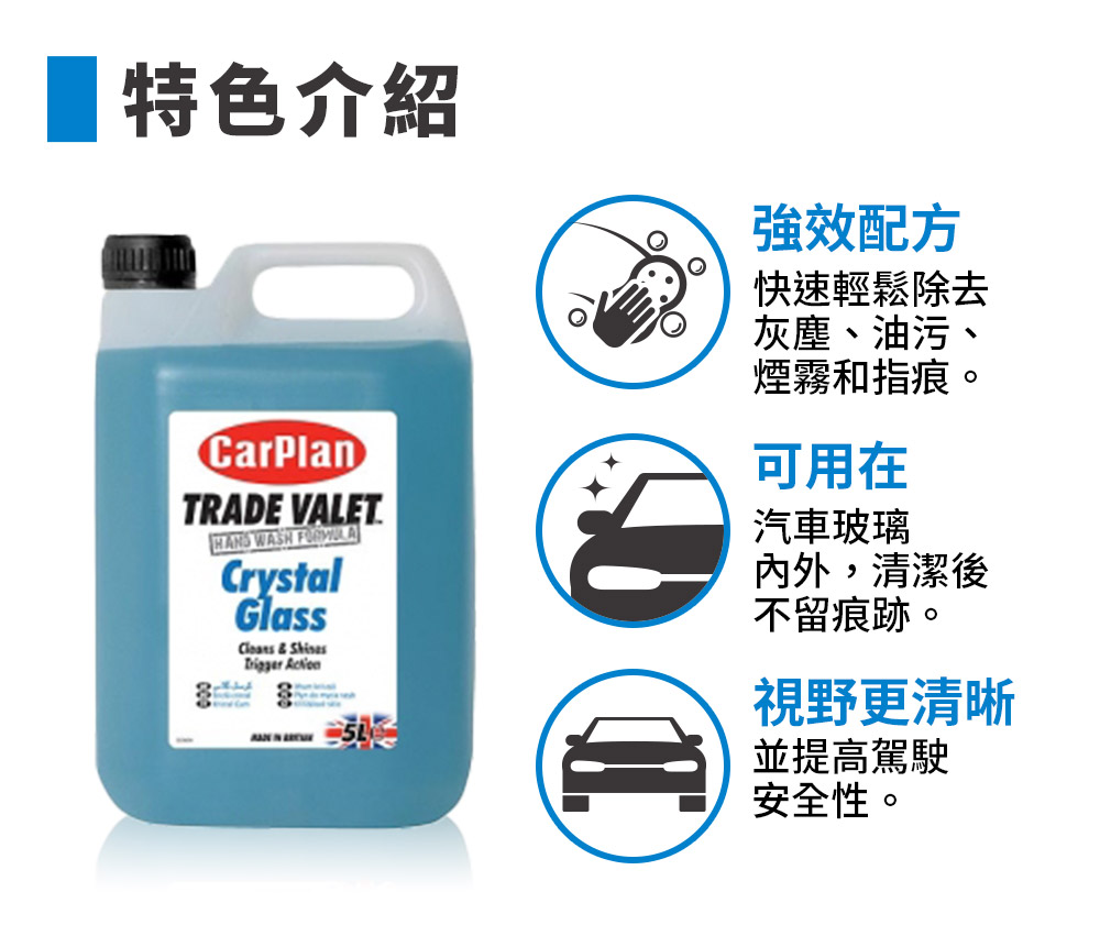 規格說明. 品牌:CarPlan卡派爾. 品名:TRADE VALET Crystal Glass Cleaner 玻璃清潔劑. 成分:IPA、ETHANOL、SODIUM HYDROXIDE. 包裝:5公升/桶. 產地:英國