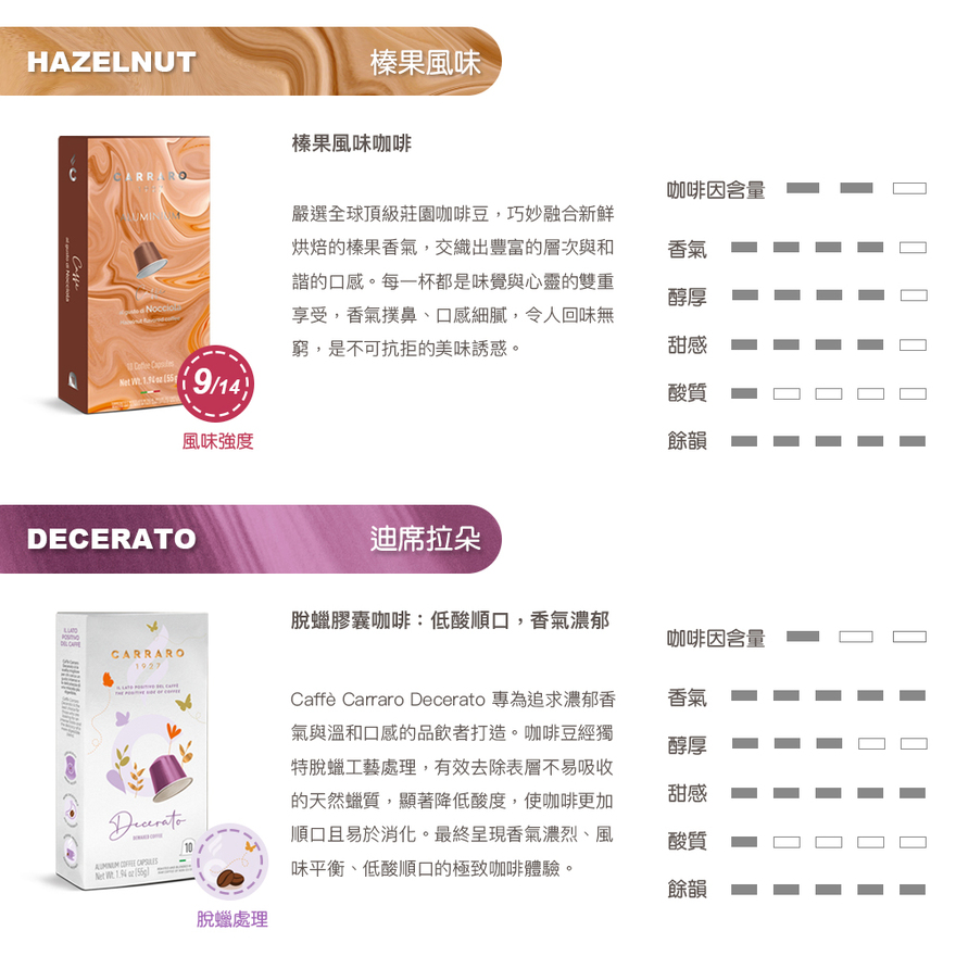 Caffè Carraro Decerato 專為追求濃郁香氣與溫和口感的品飲者打造。咖啡豆經獨特脫蠟工藝處理,有效去除表層不易吸收的天然蠟質,顯著降低酸度,使咖啡更加順口且易於消化。最終呈現香氣濃烈、風味平衡、低酸順口的極致咖啡體驗。