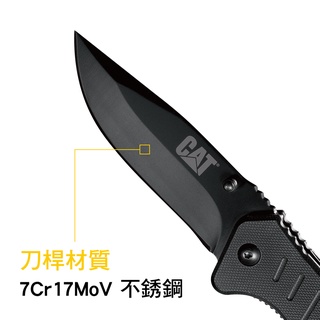 CAT八吋多功能折疊刀採用黑色G10材質手柄,不僅擁有與眾不同的極佳外觀,並且大幅提升使用時的舒適和便利性。 折疊刀為鋁合金材質手柄結合了耐用、輕便和時尚於一體,刀刃採用7Cr17mov合金鋼具有高硬度和超強韌性,材質兼具高硬度與超強韌性,使折疊刀極為鋒利而又耐用,可做為安全防身工具、登山露營折疊刀與戰術刀 。CAT八吋多功能折疊刀具有刀片安全鎖定裝置,此為CAT工具獨家專利設計,在使用時,刀刃固定不摺疊收回,大大的提高使用時的安全與便利性。另外刀桿上的螺柱提供使用者單手快速展開折疊刀。CAT八吋多功能折疊刀展開總長為20公分,8公分的刀桿和12公分手柄為折疊刀的完美比列,透過CAT工具輕量化設計,使重量只有5盎司,方便攜帶。另一方面,在刀柄上加上了安全帶切斷器以及經實驗室核可的窗戶擊破功能,可做為車上安全逃生工具使用。