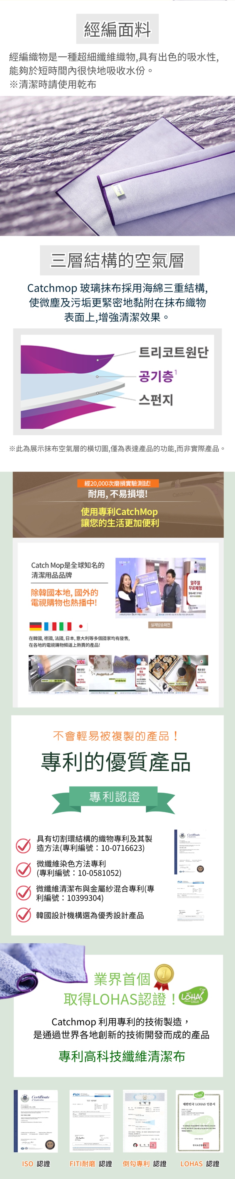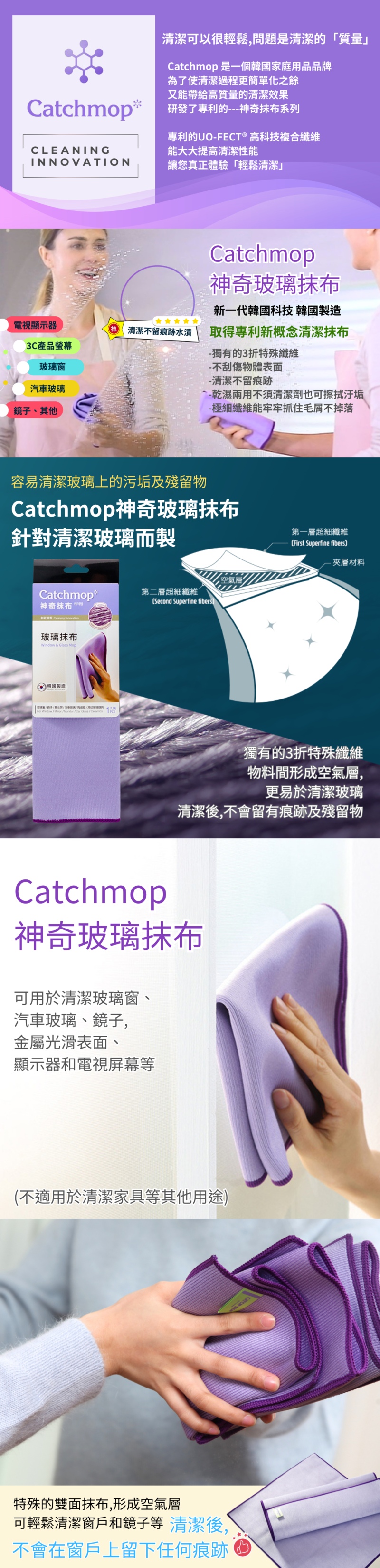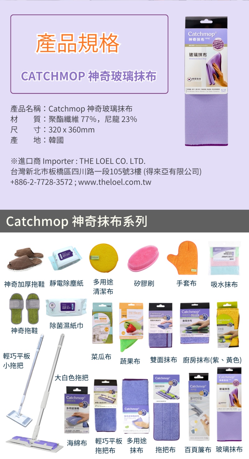 😍家居清潔神器, 韓國, 日本, 台灣, 美歐, 俄羅斯等地熱賣中😍韓國CatchMop倒勾專利神奇抹布 家居清潔必備!😍一試難忘, 心動不已1) 獨有3折特殊纖維設計, 更易於清潔玻璃, 清潔後不會留有痕跡及殘留物2) 適用於玻璃窗、汽車窗、鏡子、顯示器、電視屏幕等3) 特殊的兩層構造的特殊纖維, 物料間形成空氣層產品詳情:產品:CatchMop玻璃抹布品牌:CatchMop材質:聚酯纖維 77%,尼龍 23%尺寸:320 x 360mm產地:韓國注意:1.請用低於40°C的水清洗。2.不要用含氯漂白劑清洗,並單獨清洗。3.不要煮抹布,遠離火源。4.請在陰涼處晾乾,不要熨燙乾洗。 (脫水後, 將拖把布兩側稍微拉一下以防止收縮)。備注: 所有圖片及資料只供作參考,產品圖片及描述與實物或有區別,產品外觀及細節均以實物及代理商提供為準。資料如有更改,恕不另行通知