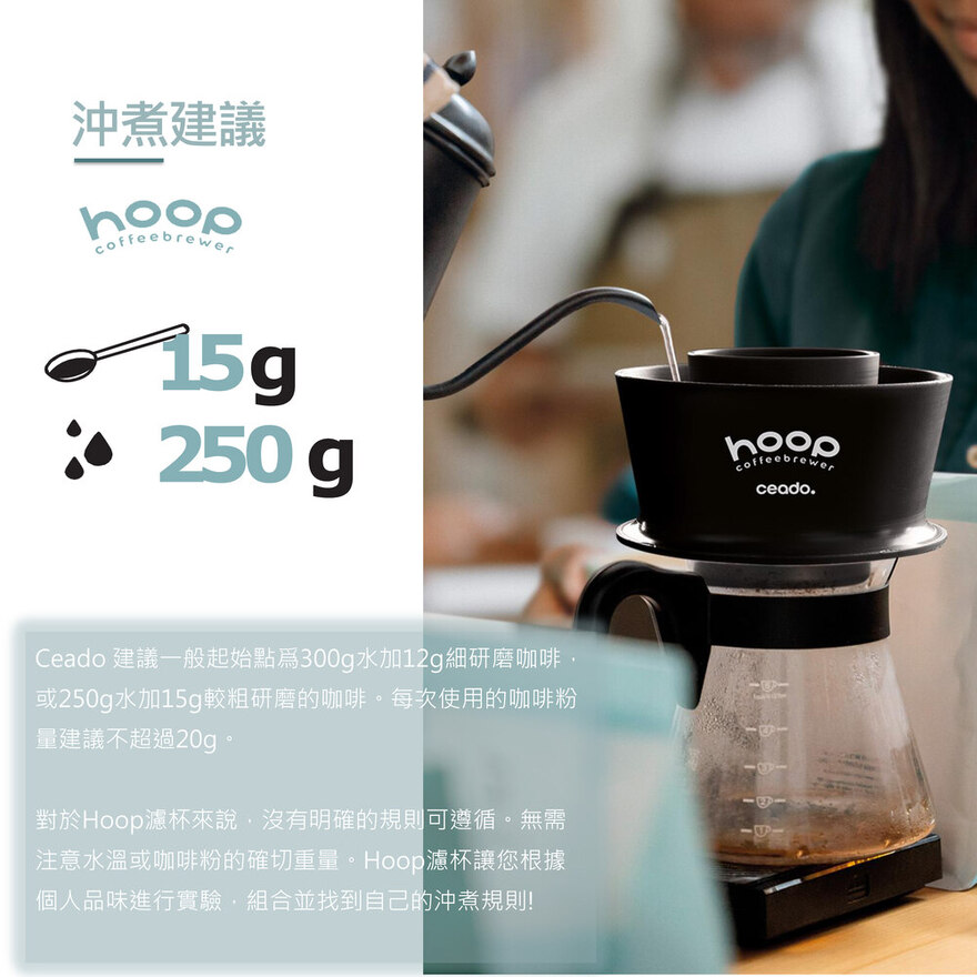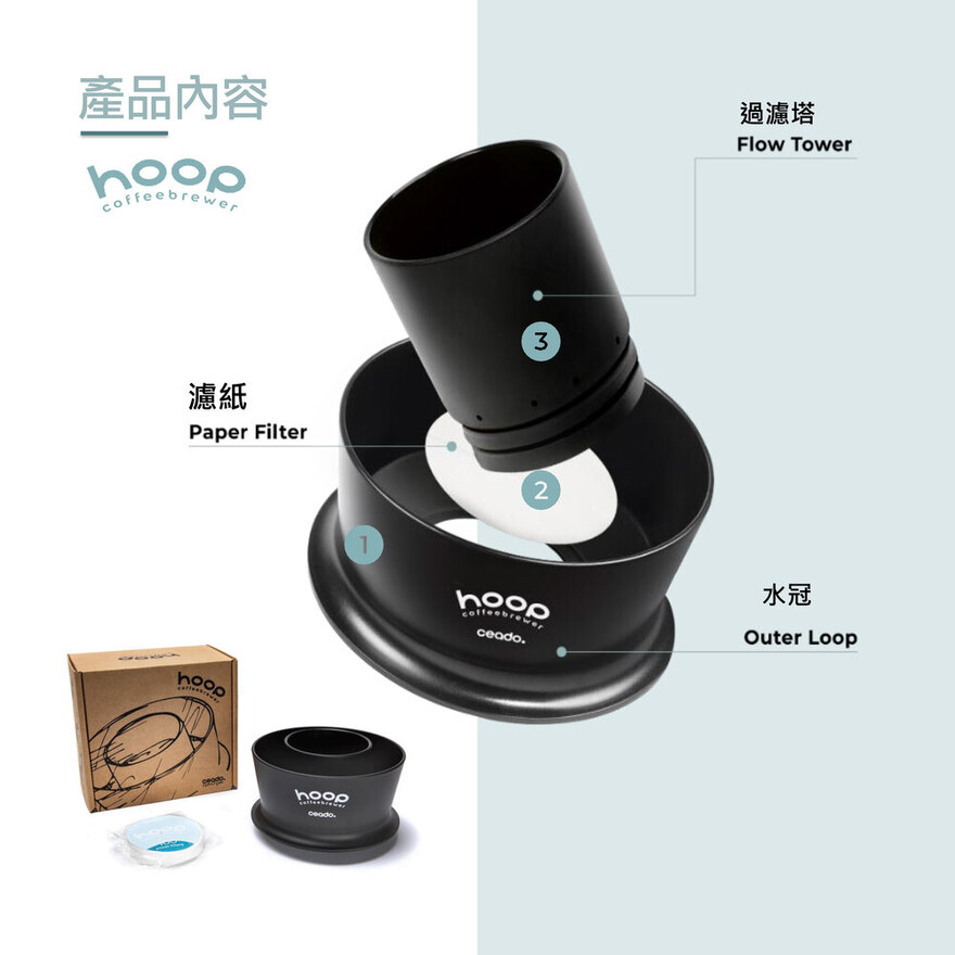 Hoop是義大利磨豆機品牌 Ceado 創造的一款創新型的濾杯。這款濾杯設計目的,便是希望人人都可輕鬆製作美味的咖啡,以徑向浸泡為概念,在指定位置分別放入咖啡粉與熱水,熱水會慢慢滲進咖啡粉並滴落於杯中,數分鐘後就能獲得一杯美味的咖啡 ; 雖然沖煮時間較長,卻不會有過萃的情況發生。也因此,一上市就榮獲了SCA2023最佳新産品獎。Ceado 希望Hoop可以成爲你咖啡生活的一部分,每個人都可以按照自己的方式探索咖啡世界。【商品特色】✔️ 易於清潔Hoop 的設計讓清潔更容易。萃取結束後, 只需將過濾塔從水冠上輕輕旋開,濾紙就會輕鬆彈出!所有 Hoop 元件均可輕鬆拆卸並可在清水下或進洗碗機清洗。✔️ 持久耐用選用食品級聚丙烯,熱塑性塑料射出成型BPA-Free 不含雙酚A : 保護健康與環境耐熱溫度 100˚C產品與包材100%可回收可進洗碗機清洗✔️ 使用簡單這是一款適合所有想要體驗高品質咖啡且無需特定手沖技巧的人,因爲你只需要熱水,磨好豆,再倒水即可。只需將注意力集中在尋找適合的咖啡豆上而不是在於你的沖煮技術。✔️ 均勻萃取開始沖泡時,Hoop外圈的水會通過內環底部的12個孔滲透,以一致的速度將柔和的水橫向注入咖啡粉層中,穩定均勻的萃取。不會因爲人爲的注水速度與高度帶來擾流影響。無需分段注水與特殊的手沖技巧,只需等待完成萃取即可。簡單易用,是一個非常穩定的沖泡工具。整個沖泡時間依咖啡焙度與研磨度大約會在4-8分鐘左右。雖然沖泡時間比較長,但得益於它浸泡式的萃取方式,在研磨度合宜的情況下幾乎不會有過萃的情況。【商品規格資訊】淨 重 : 165g毛 重 : 260g材 質 : 食品級聚丙烯耐熱溫度 : 100˚C産 地 : 義大利尺 寸 : 13.2 x 8.4 cm顔 色 : 黑色、透明、海藍色産 品內容 : 濾杯、100張配套圓形濾紙適 配濾紙 : 適配58mm-62mm圓形濾紙容 量 : 濾紙最大承重 20g 咖啡粉杯 口 : 可配直徑 7-10 cm可進洗碗機清洗台灣代理商 :誠品生活股份有限公司