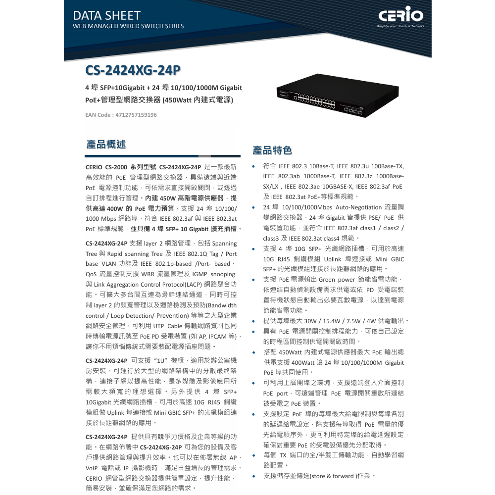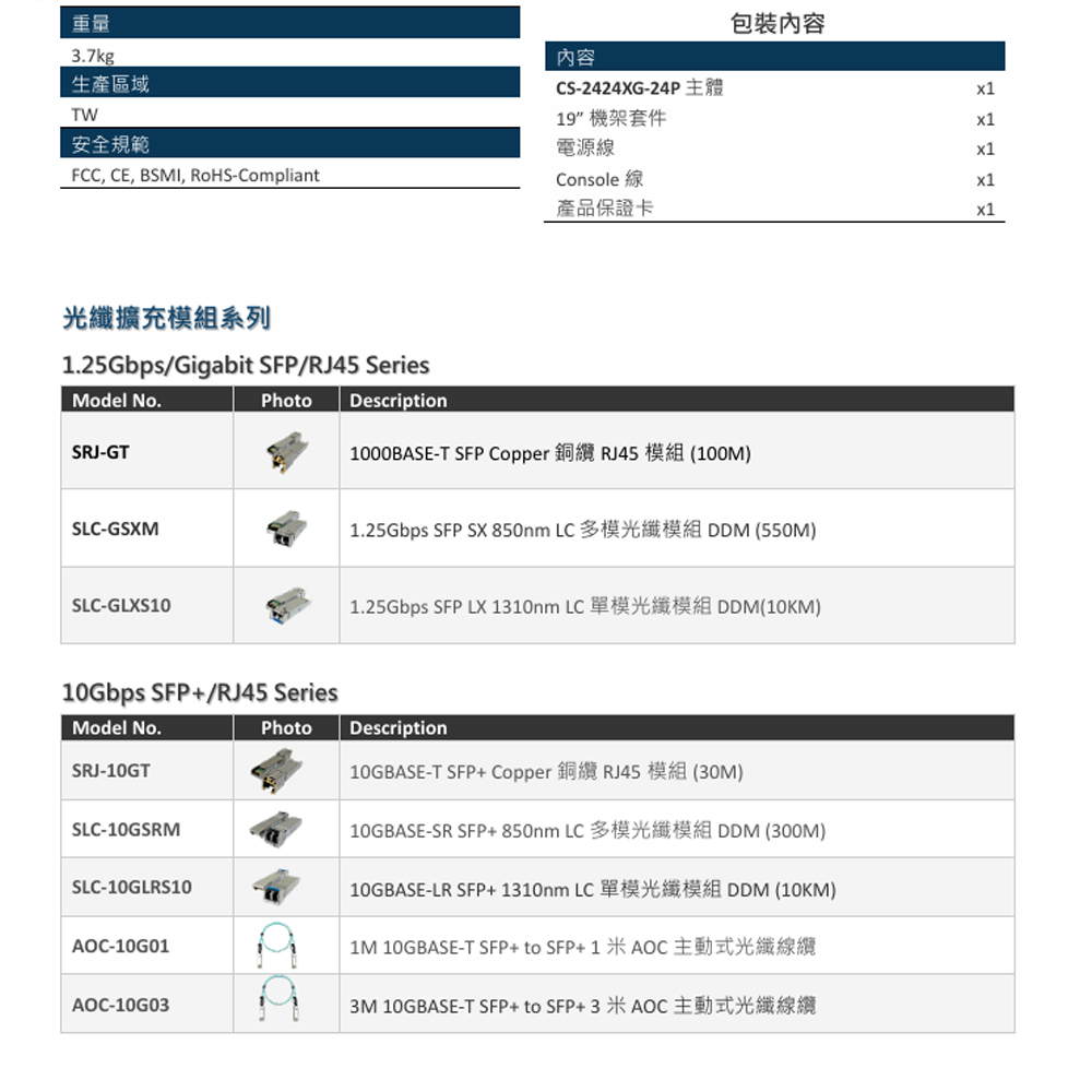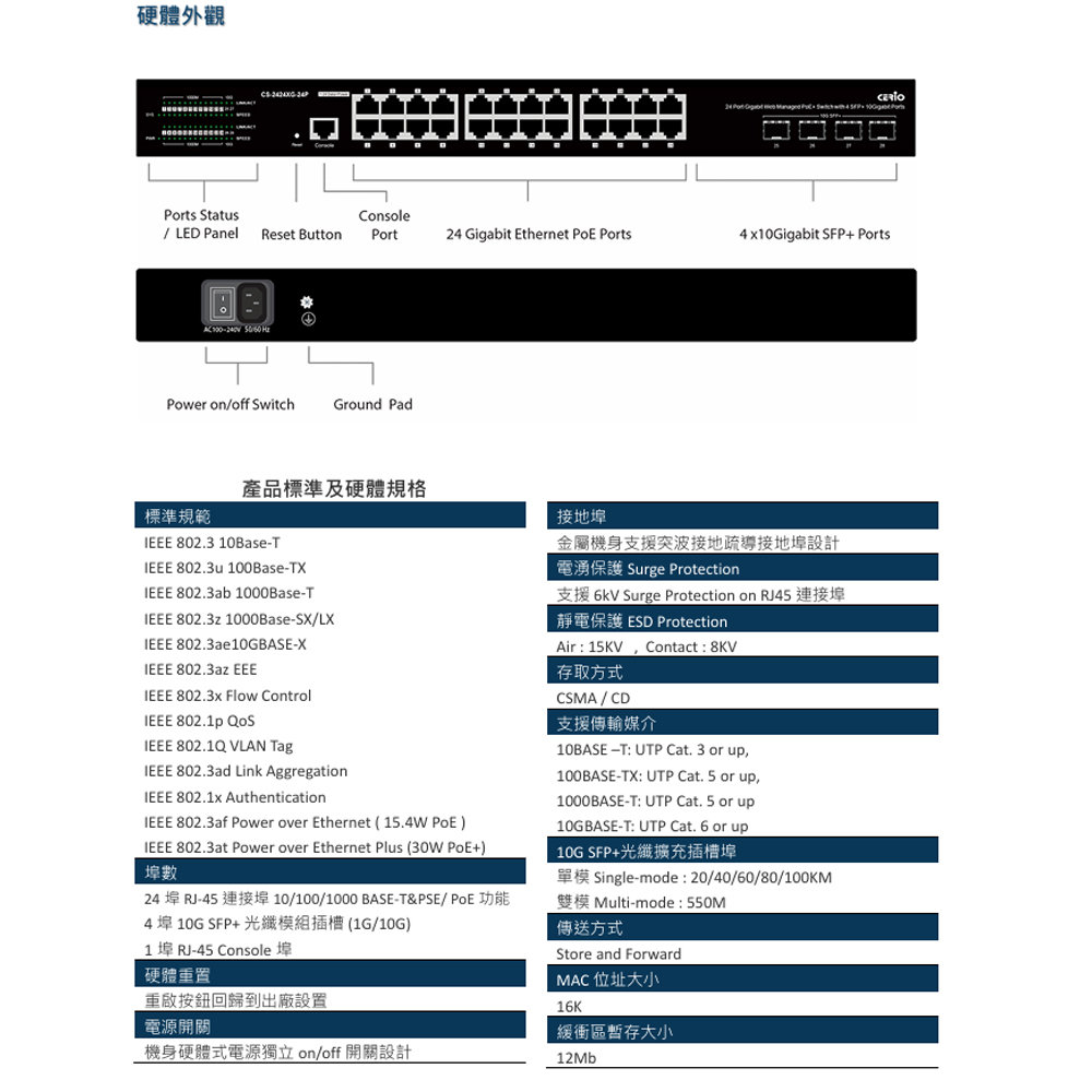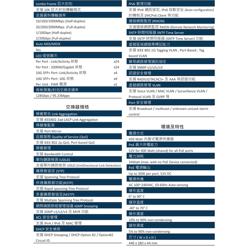 •符合 IEEE 802.3 10Base-T, IEEE 802.3u 100Base-TX, IEEE 802.3ab 1000Base-T, IEEE 802.3z 1000Base-SX/LX , IEEE 802.3ae 10GBASE-X, IEEE 802.3af PoE及 IEEE 802.3at PoE+等標準規範。