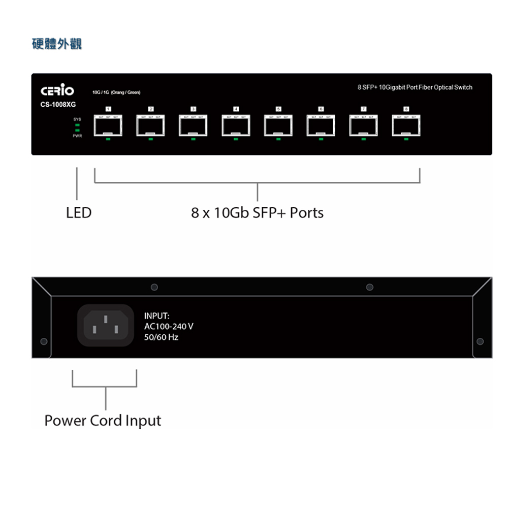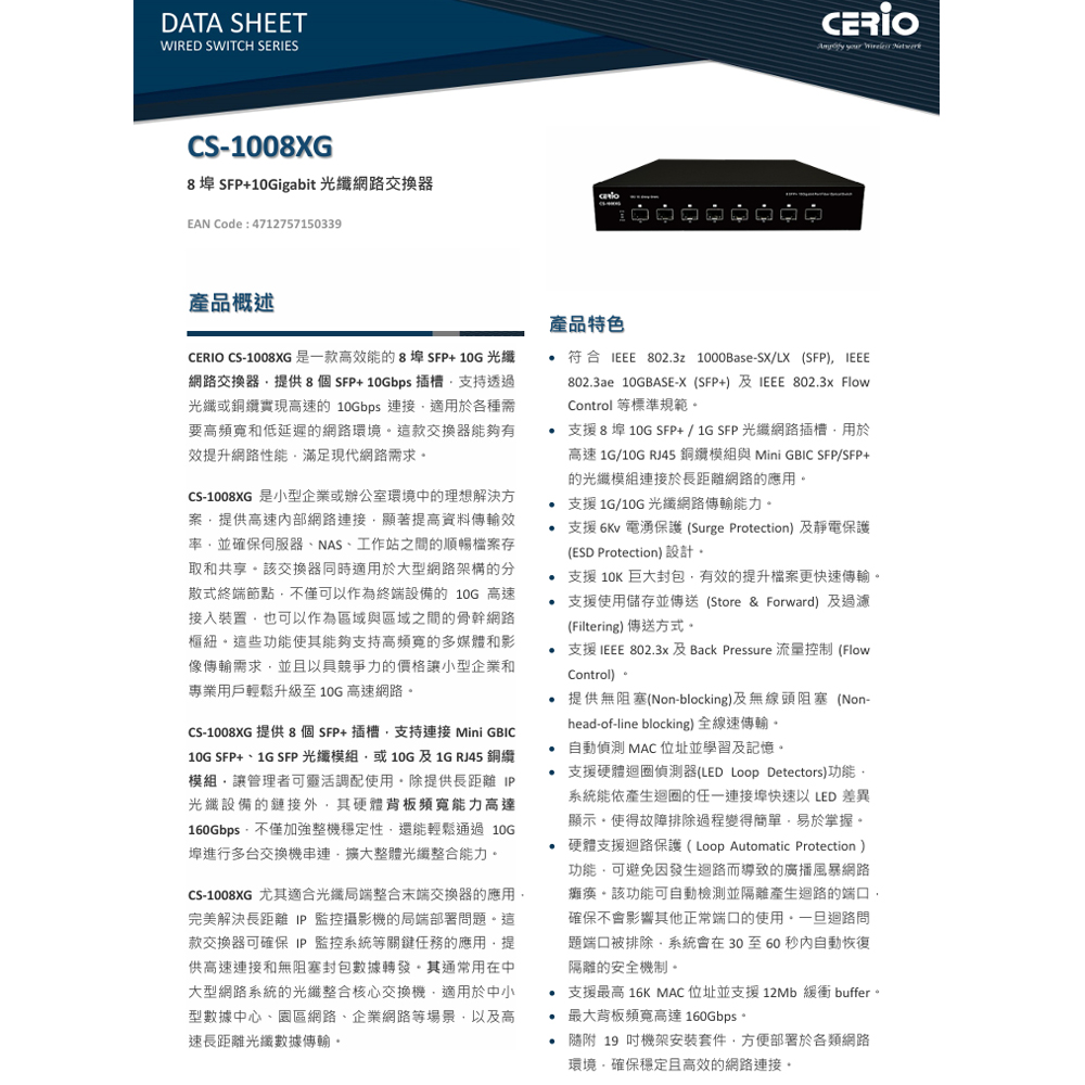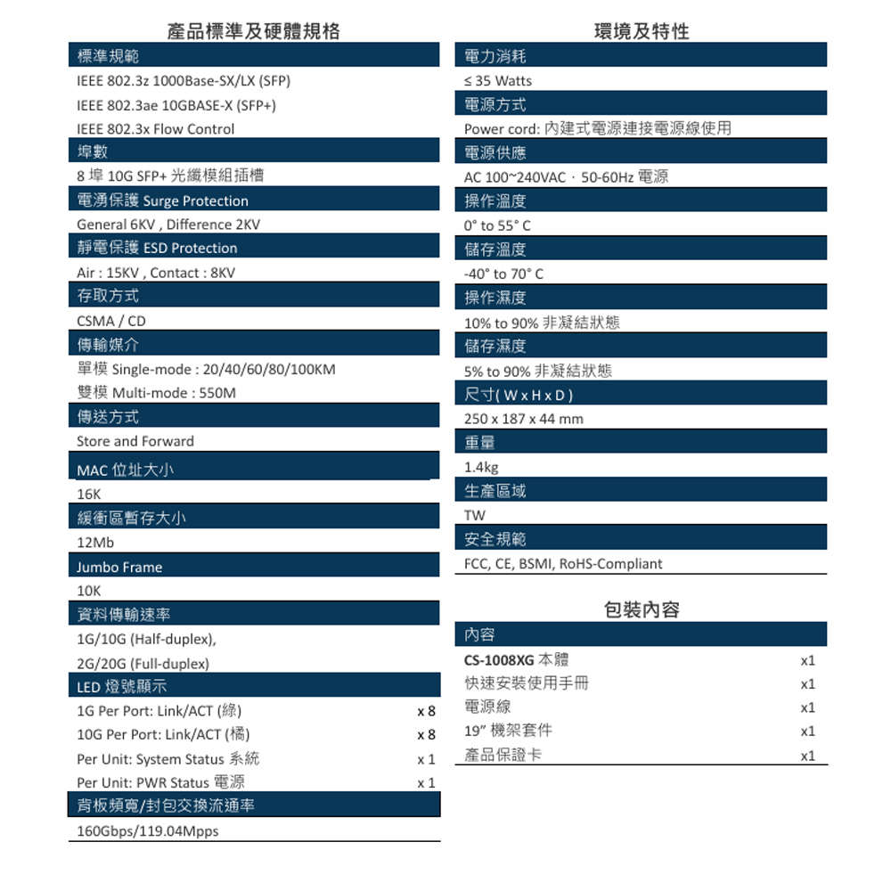 • 符 合 IEEE 802.3z 1000Base-SX/LX (SFP), IEEE802.3ae 10GBASE-X (SFP+) 及IEEE 802.3x FlowControl 等標準規範。