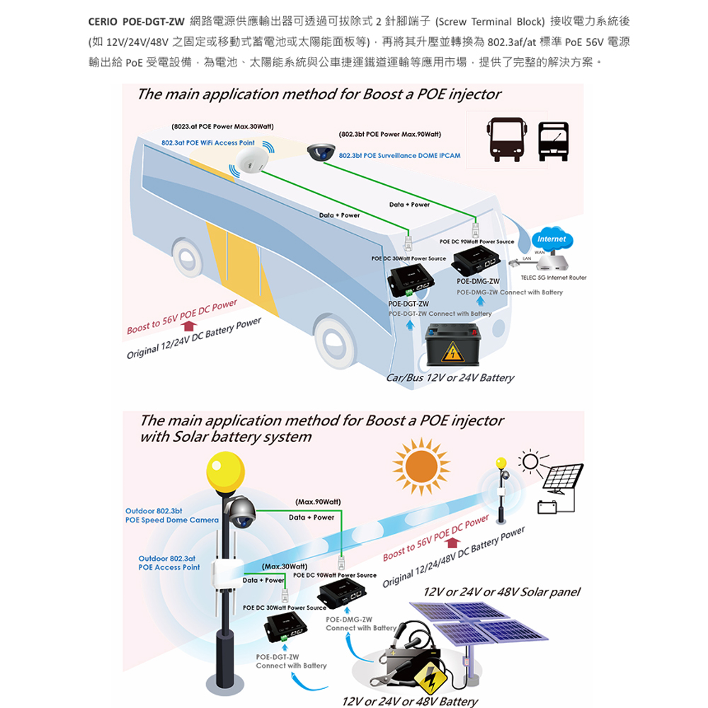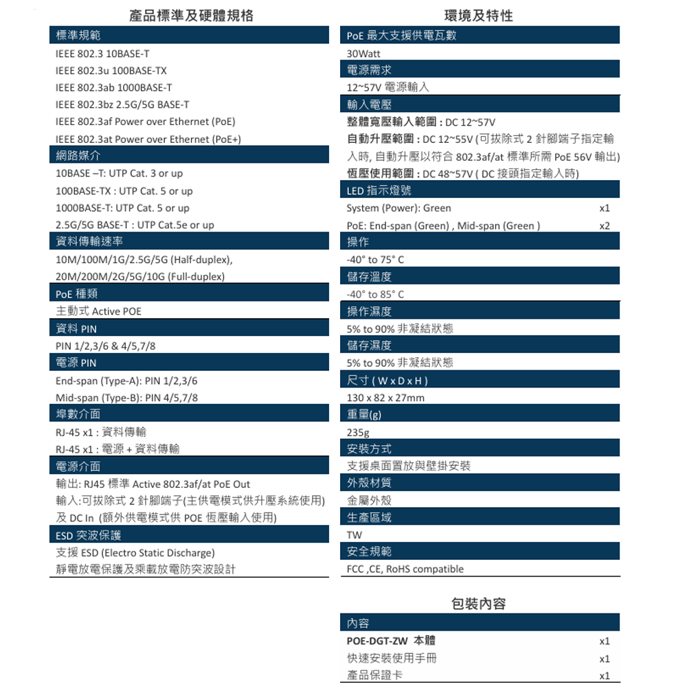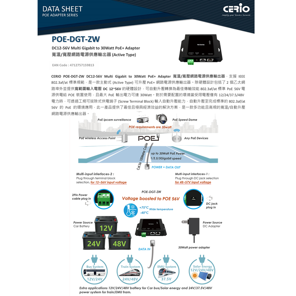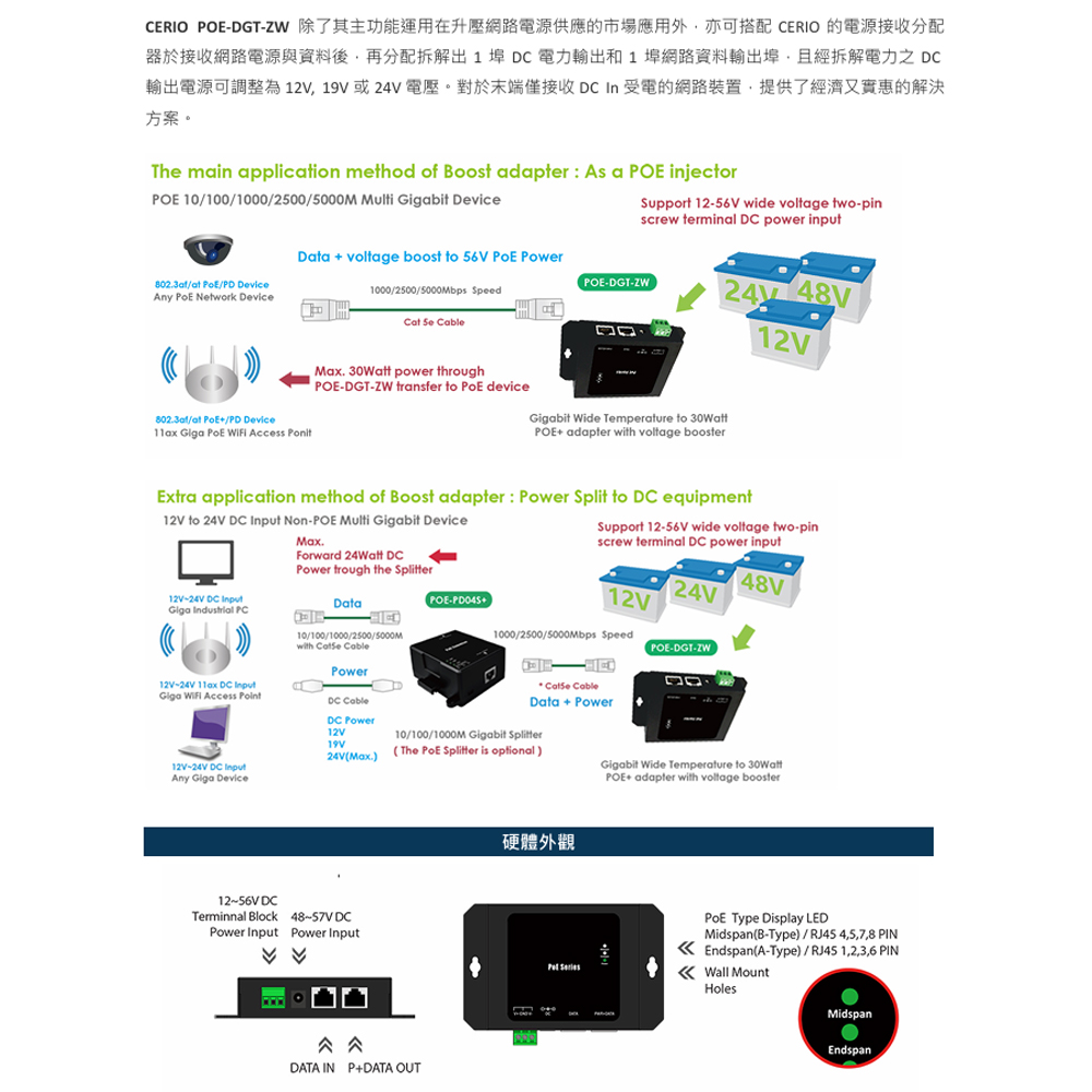 昌運監視器 CERIO 智鼎 POE-DGT-ZW Giga PoE+ 寬溫/寬壓網路電源供電器