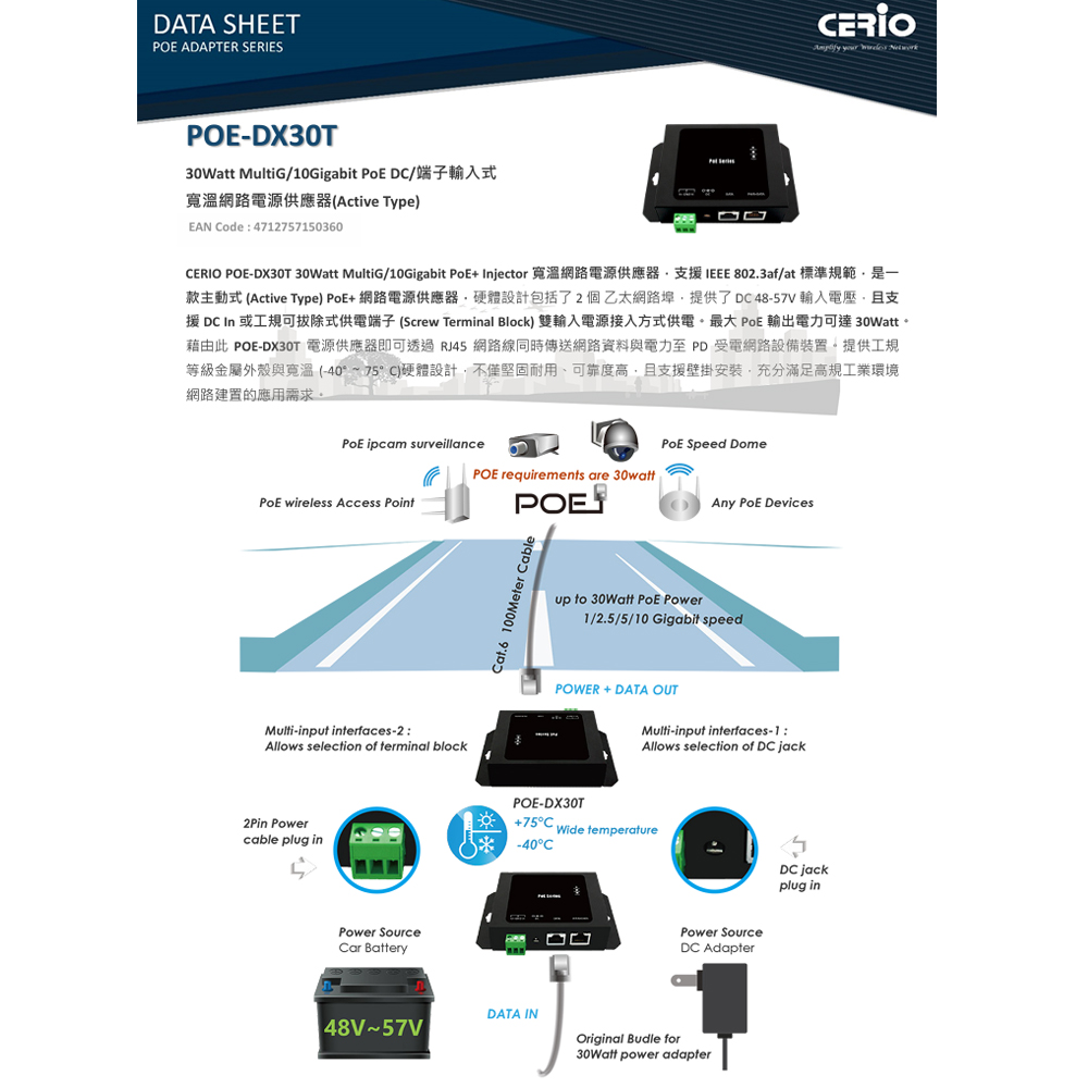 昌運監視器 CERIO 智鼎 POE-DX30T 30Watt DC/輸入式寬溫網路電源供應器 突波保護