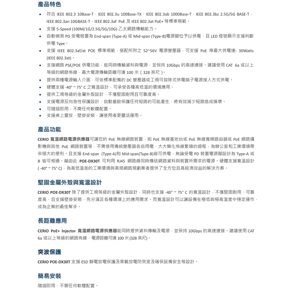 • 支援IEEE 802.3af/at POE 標準規範,搭配所附之52~56V電源變壓器,可支援PoE埠最大供電達: 30Watts (IEEE 802.3at)。