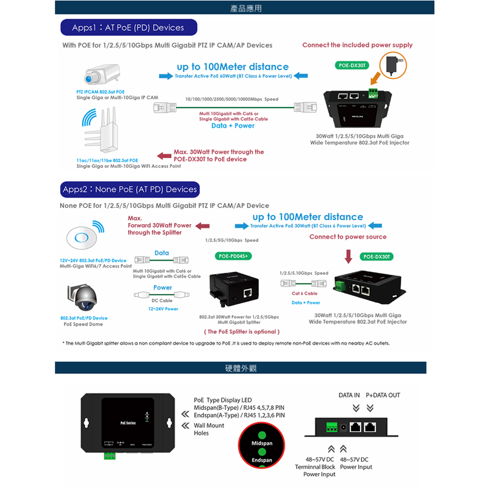 • 支援網路PSE/POE供電功能,能同時傳輸資料與電源,並保持10Gbps的高速連接。建議使用CAT 6a或以上等級的網路佈線,最大電源傳輸距離可達100米(328英尺)。