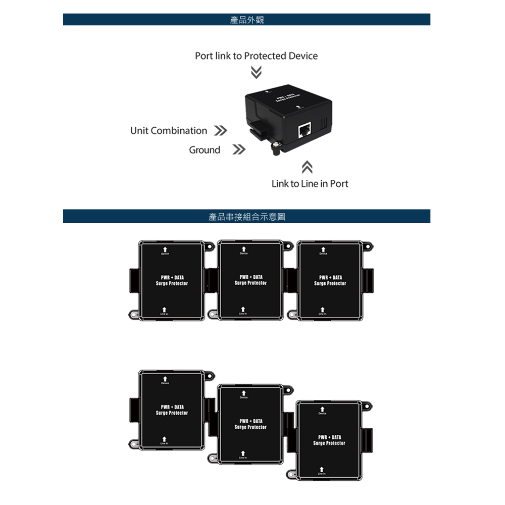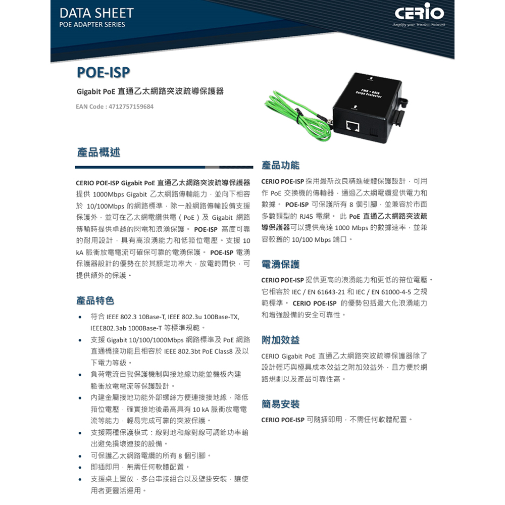 昌運監視器 CERIO 智鼎 POE-ISP 室內型 Gigabit PoE 直通乙太網路突波疏導保護器 10kA電流