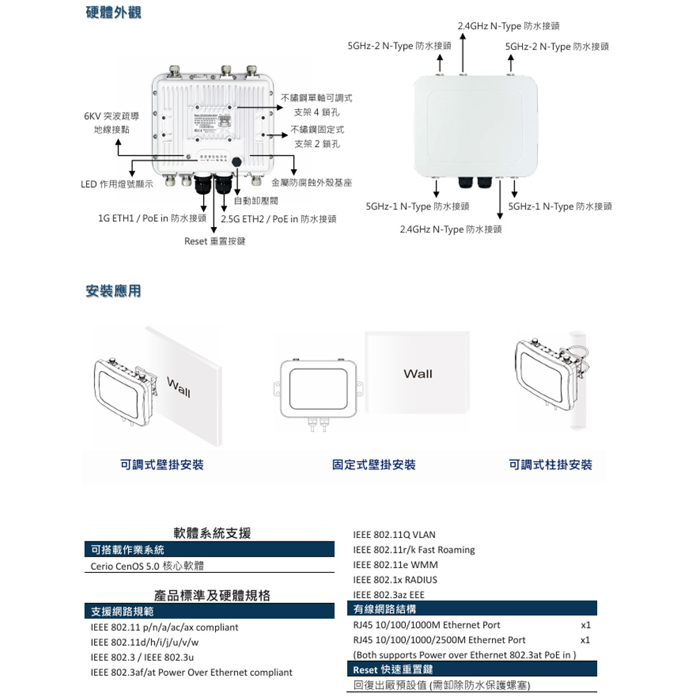 • 除支援Mesh AP骨幹中樞互連能力外,同時也支援多工的無線基地台AP站點供無線使用者WiFi存取使用。