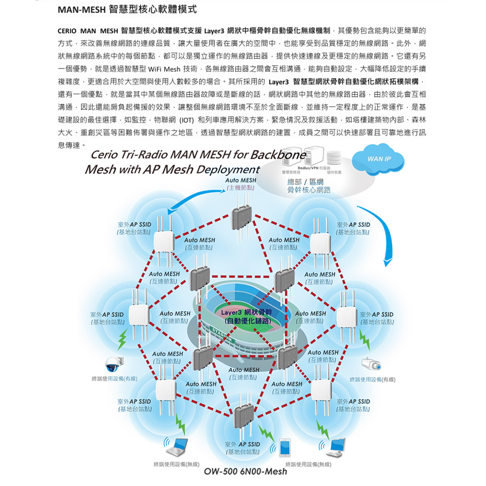 • 支援多節點智慧鏈路能力,各節點自動偵測,網路優化及網路自我修復功能,在任何地點始終確保網路連接