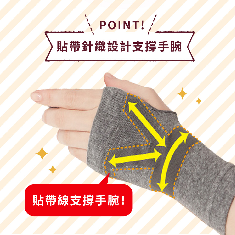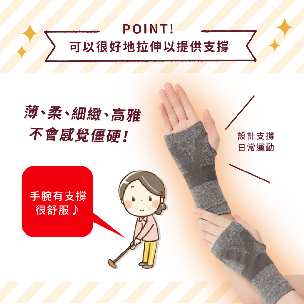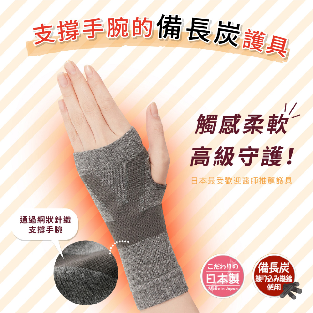 日本製【CERVIN】紅外線備長炭保暖護腕・切り替え編みのテーピングラインで手首をサポートします。・手のひらと手の甲の真ん中は、メッシュ編みになっているので通気性がよくムレにくいです。・伸縮性のよいニットタイプ。・薄手なのでごわつきにくく、しっかり伸びてサポートしてくれます。・日常動作をサポートするテーピング編み設計で手首が支えられて楽ちんです。・遠赤外線を放射するといわれる備長炭を練り込んだ繊維を使用しています。・夏場の冷房対策としても重宝します。*日本製造採用交流編織法和編織線支援技術。*超彈力伸縮,手掌中心和手背採用網針編織,透氣不悶熱,舒適不緊繃。*薄、柔、細緻、高雅,不會感覺僵硬,並且可以很好地拉伸以提供支撐。*纖維中具有紅外線備長炭,結構緻密,給予手腕周圍的溫暖支撐。*輕巧設計編織,日常活動輕鬆柔軟。*夏天的冷氣房也很實用。注意事項本品不具醫療效果。有下列情況者,使用前請先諮詢醫師:穿戴部位有傷口/搔癢/孕婦/高血壓/心臟/腎臟疾病/血循不佳/糖尿病/皮膚炎。合成纖維過敏者,請勿過度勒緊。使用中若有不適,請停止使用並諮詢醫師。請勿強力拉扯,避免損壞商品。如果佩戴時受到強烈摩擦,或者在被水或汗水弄濕時與其他物體摩擦,顏色可能會發生轉移。長時間暴露在陽光或熒光燈下可能會導致變色。請放置於嬰幼兒不易拿取處 。 請勿接近火源。使用效果因人而異。訂購時請先審慎確認及測量適用尺寸。材 質:尼龍、棉、其他顏 色:灰尺 寸:腕圍15-20 cm洗滌方式:手洗/水溫低於30°C/中性洗劑/勿漂白/勿烘乾/勿熨燙/陰涼處懸掛晾乾/勿專業乾洗/用毛巾壓去過多水分後陰乾產 地:日本製國際條碼:4985697259381
