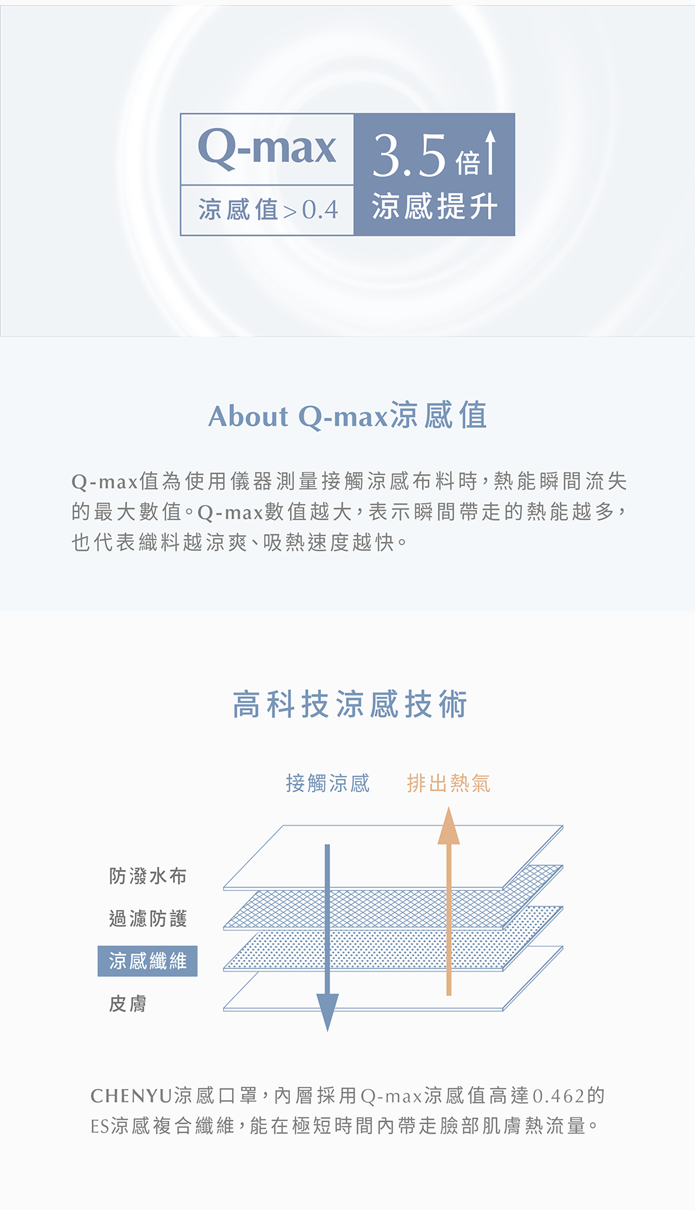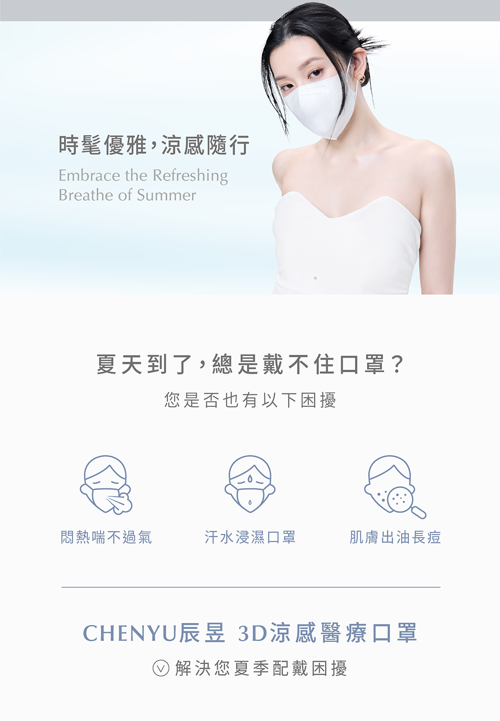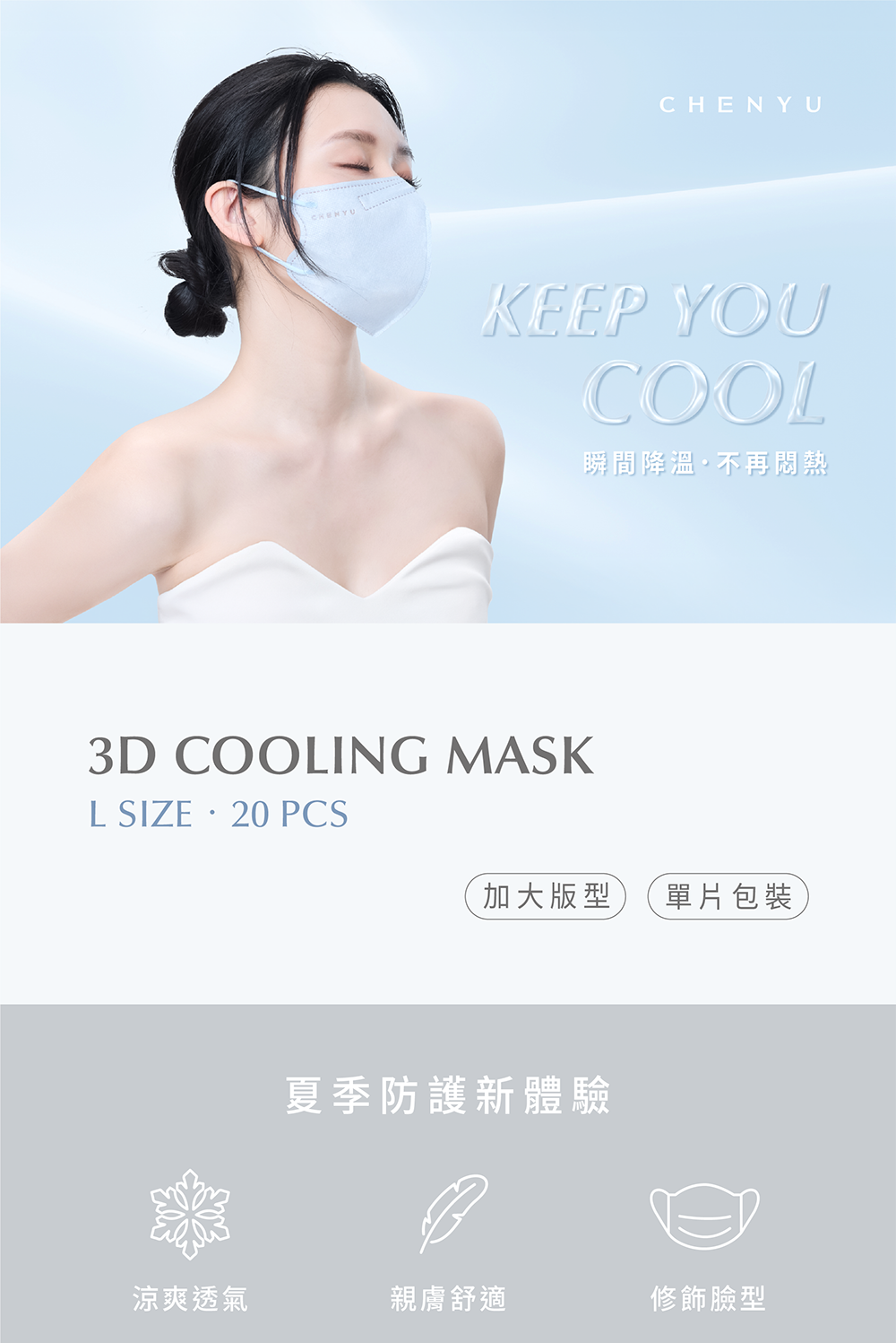 #一戴即涼 #顛覆絕對悶熱 #4倍涼感 #L SIZE #大眾版型#男女適用 #單片包裝尺寸:10.3*14.5 cm 男女通用-抗悶熱的防護新體驗|沁涼有感獨家ES科技涼感內層科學認證實測4倍涼感瞬間帶走口罩內部悶熱氣流|透氣親膚絕佳的透氣滑順面料解決悶熱及摩擦不適減少肌膚出油、致痘|完美防護BFE達99.8%20片獨立包裝,防塵衛生-【CHENYU辰昱 3D涼感醫療口罩 (20入)】▍產品資訊 / Information.品牌:CHENYU辰昱.醫療器材品名:“辰昱”立體醫療口罩(未滅菌).許可證字號或登錄字號:衛部醫器製壹字第009894號.許可證所有人或登錄者之名稱:宏廷富國有限公司.許可證所有人地址:嘉義縣民雄鄉秀林村林子尾67號.販賣業醫療器材商名稱:宏廷富國有限公司.販賣業醫療器材商地址:嘉義縣民雄鄉秀林村林子尾67號.販賣業醫療器材商許可證:嘉縣藥販字第MD6240011038號.製造業醫療器材商名稱∣宏廷富國有限公司 委託勤雄實業股份有限公司製造.製造業醫療器材商地址∣彰化縣埔鹽鄉新水村大新路37-12號.製造業醫療器材商電話∣04-8658658(勤雄).製造業醫療器材商許可證∣彰縣藥製字第6137160042號.製造產地:100%台灣 TAIWAN ‧ 含雙鋼印.製造日期∣2025/01 (實際日期依當次出貨批次為準,標示於紙盒).有效期限:5年.主要成分或材料∣內層‧內層ES涼感不織布、中層‧過濾防護熔噴布、外層‧防潑水不織布.Q-MAX涼感標準值 =0.462.口罩尺寸∣約10.3(寬)*14.5(長) cm(±0.5).度量/販售數量/販售規格∣盒裝一盒20入/單片包裝.儲存條件:請存放於陰涼乾燥處.有效期限∣5年.符合CNS 14774國家法規標準‧細菌過濾率(%)BFE≥95%‧壓差(mmH₂O/cm²)<5.0▍佩戴方法 / Wearing method1.拉開兩側耳帶,掛於雙耳2.將口罩上緣,沿著鼻子貼合3.輕輕調整全側至下巴,使口罩服貼▍注意事項 / Notice本產品適用一般民眾、病人與醫護人員穿戴,可阻擋微生物、體液及粒狀物質的傳遞本產品為一次性口罩,請勿重覆使用或清洗本產品不具防毒功能,請勿使用於有毒氣體環境當呼吸有異味時,請立即更換。具量測功能之產品,其定期校正服務之項目及據點資訊。▍藥商執照.藥商許可執照∣嘉縣藥販字第MD6240011038號.藥商公司名稱∣宏廷富國有限公司.藥商公司地址∣嘉義縣民雄鄉秀林村林子尾67號.藥商諮詢專線∣05-2220580(週一至週五上班日).線上服務時間∣週一至週五 9:00-18:00.消費者使用前應詳閱醫療器材說明書(請詳閱產品使用說明書或商品圖).購買前請查閱本官網購物須知▍注意事項&售後服務.購買前請詳閱購物須知.消費者使用前應詳閱醫療器材說明書1.商品操作方面及維修服務請聯繫客服。2.僅針對商品本身有七天內新品瑕疵更換之權益,並請提供開箱影片。