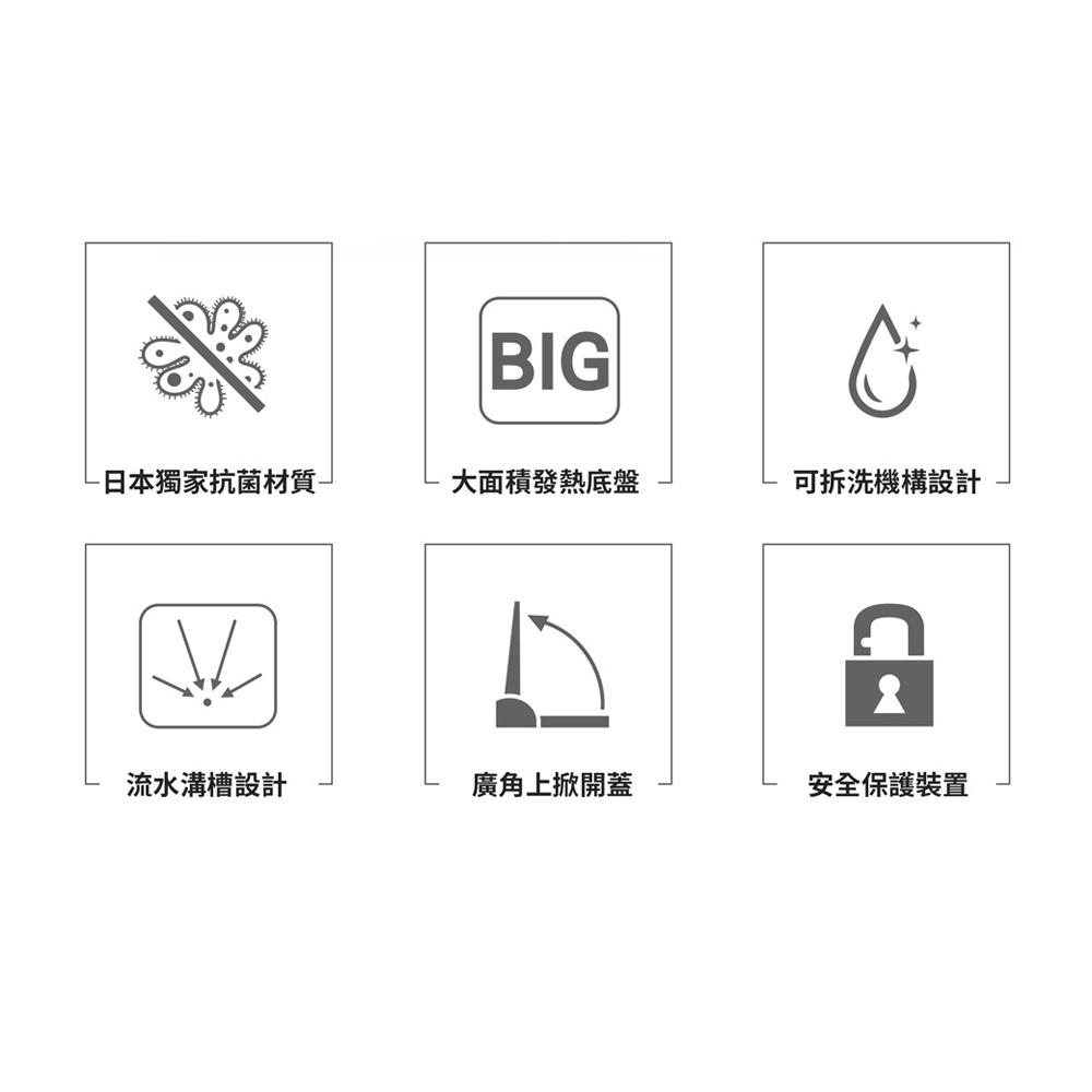 商品特色:日本獨家抗菌材質大面積發熱底盤可拆洗機構設計流水溝槽設計廣角上掀開蓋安全保護裝置輕量外型設計商品規格:型號:KD-06PH00額定電壓/頻率:110V~ 60Hz定時:120分鐘產品淨重:3.1公斤產品尺寸:長427x寬385x高437mm總額定消耗電功率:180W層架附件:筷架製造產地:中國保固:一年本商品資訊由網路及官網收集彙整而成,僅供參考,如有更新或異動不另外通知,正確商品資訊及規格以實機為準。鑑賞期非試用期,產品一經使用皆會影響您退貨權利。
