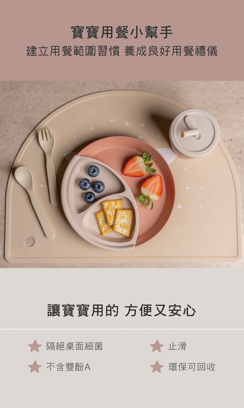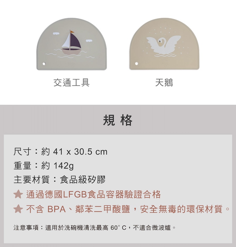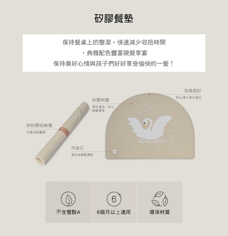 ✔通過德國LFGB食品容器驗證合格✔不含 BPA ✔矽膠材質防滑易清潔✔可捲起來不佔空間(附贈矽膠收納環),方便外出攜帶✔孩子吃飯時,可防止食物和液體灑到桌子或地面上,較乾淨衛生✔精緻時尚的圖案,輕鬆融入家中的擺飾✔適用於洗碗機,最高 60°。不適合微波爐尺寸:41 x 30.5 cm 重量:143g材質:矽膠