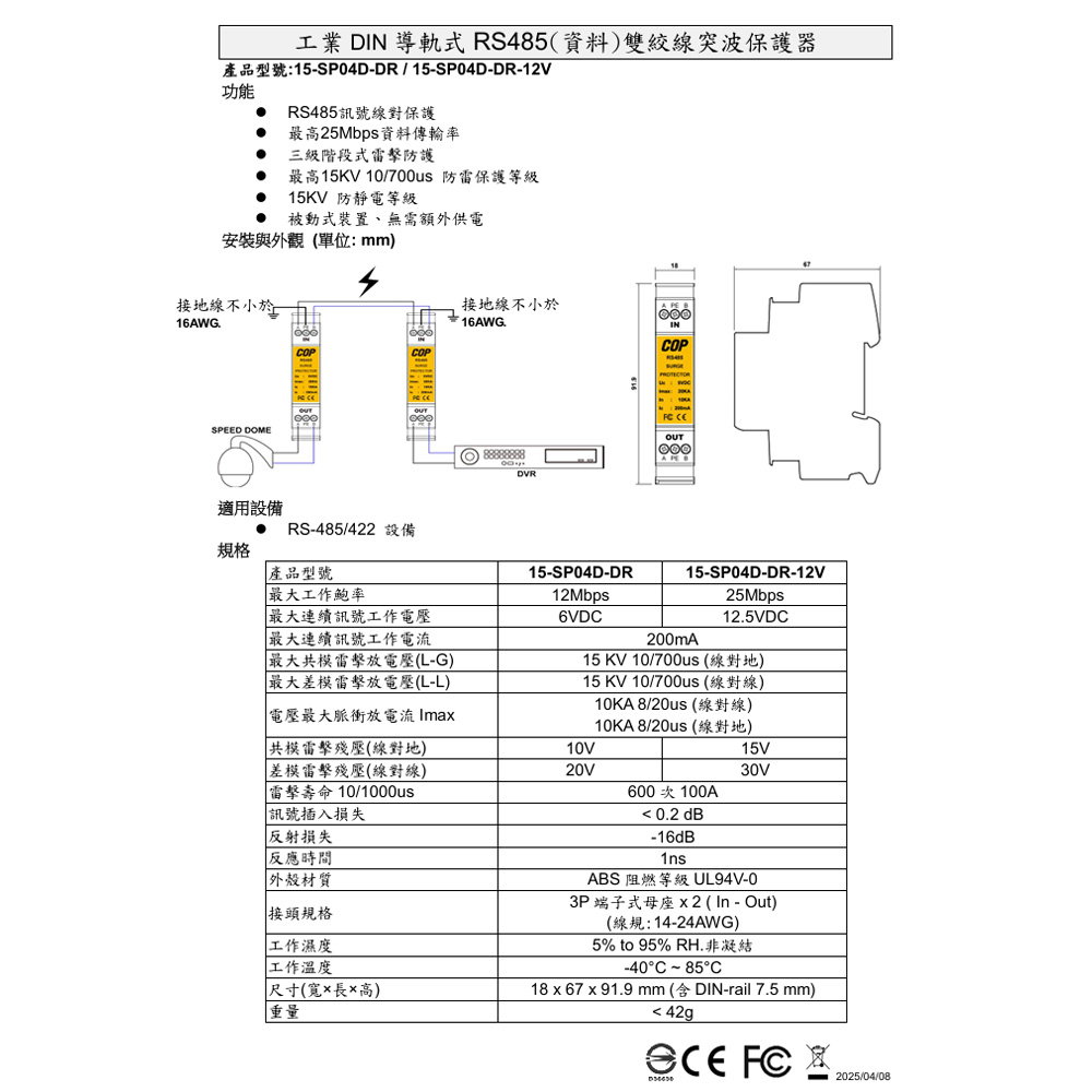 昌運監視器 工業DIN導軌式RS485(資料)雙絞線突波保護器