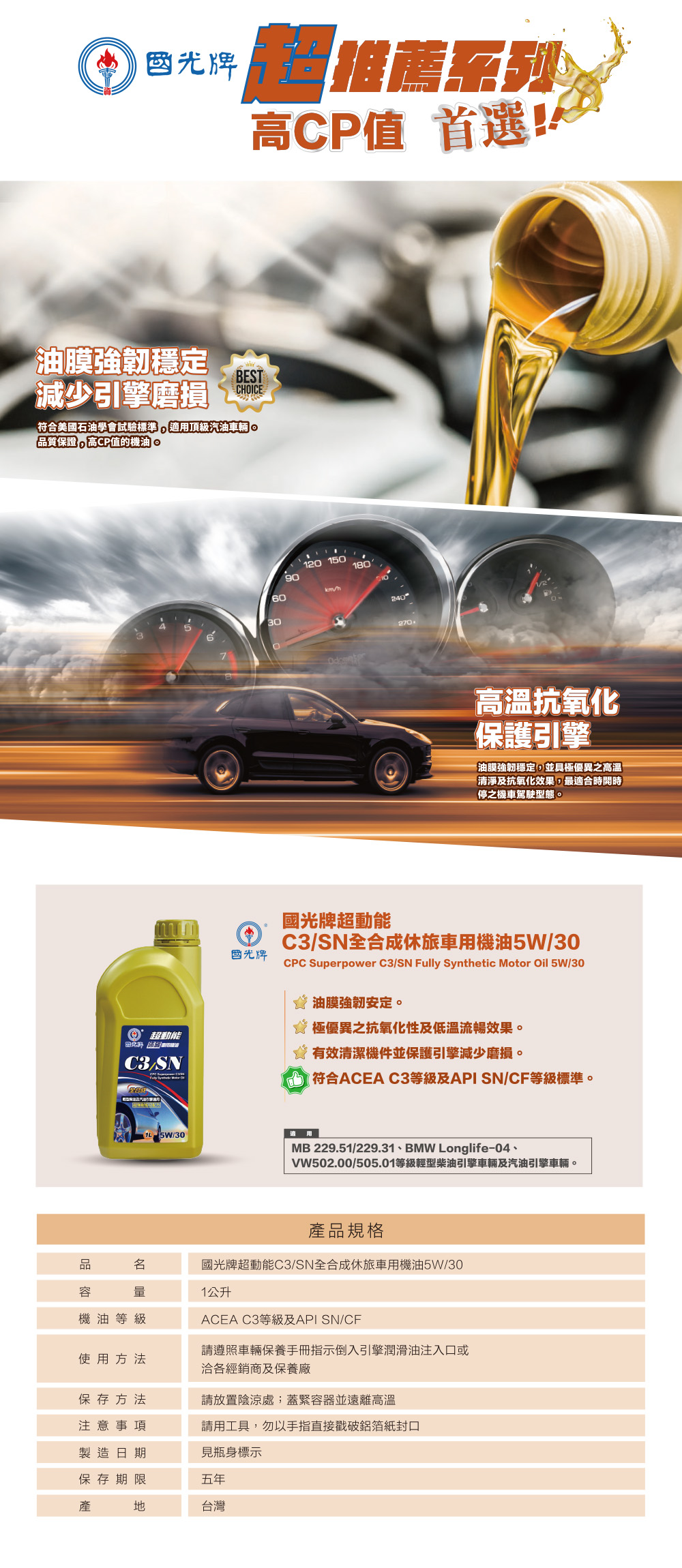 商品名稱:國光牌超動能C3/SN全合成休旅車用機油5W/30