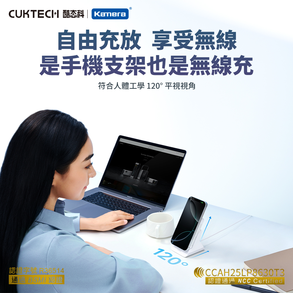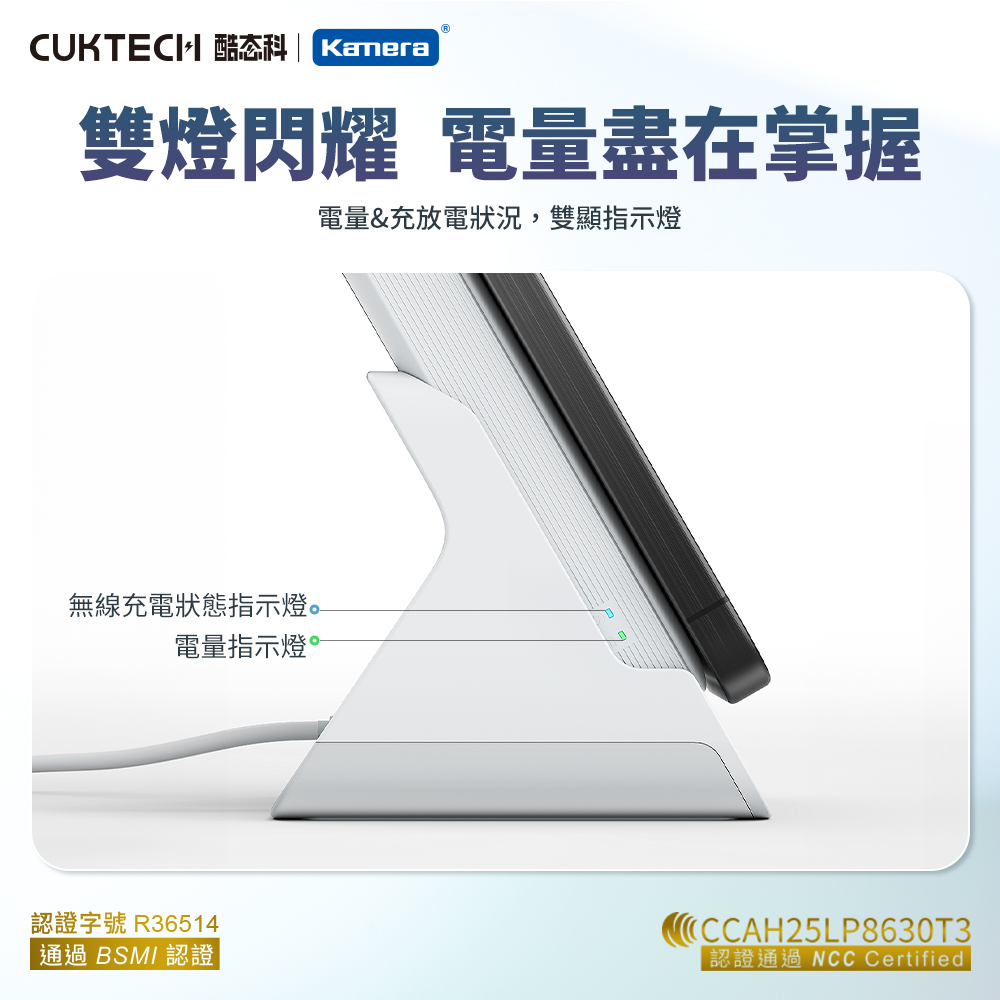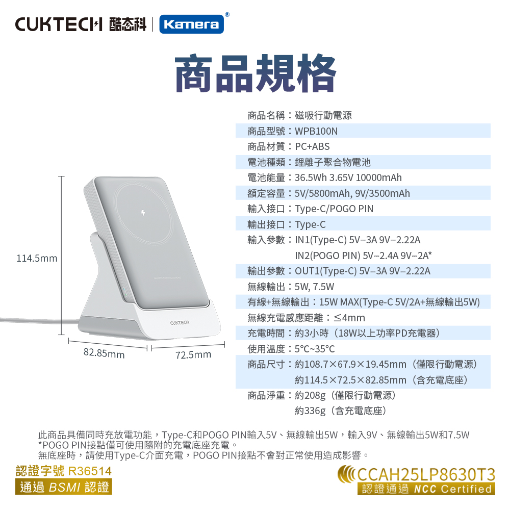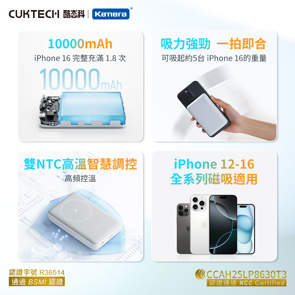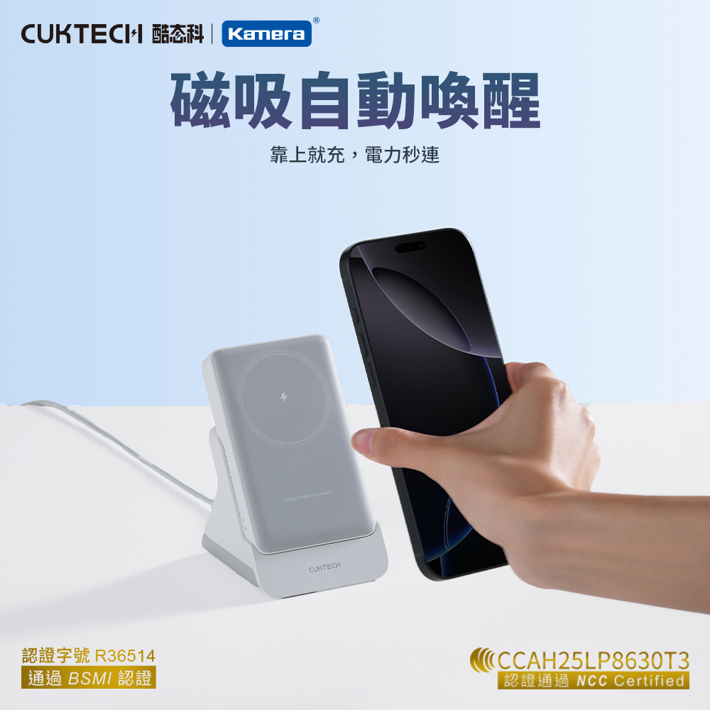 產品特點 ● 磁吸+15W 有線同時充電:支援磁吸無線充電與 15W 有線輸出同步進行,出門只需一顆行動電源,即可為兩部裝置同時供電,無論是手機、耳機或其他裝置,都能隨時補能不間斷。● 120°人體工學支架設計:支撐角度約 120 度,符合多數人觀看手機的自然視角。無論是直立視訊或桌面操作,都能穩定支撐,減少手持疲勞,提升使用舒適度。● Type‑C 20W MAX 雙向輸出/輸入:配備高速 Type‑C 接口,充電與自充電皆可達最高 20W,快速滿電,省下等待時間。● 三種使用方式(支架 + 磁吸 + Type‑C):一顆行動電源,滿足多場景需求,放在桌面當支架追劇、磁吸固定隨充隨用、有線 Type‑C 高功率輸出,靈活切換,隨時適應你的生活習慣。● 10000mAh 大容量設計:內建 10000mAh 鋰離子聚合物電池,為手機提供多次完整充電,長途旅行或日常高頻使用都能安心。