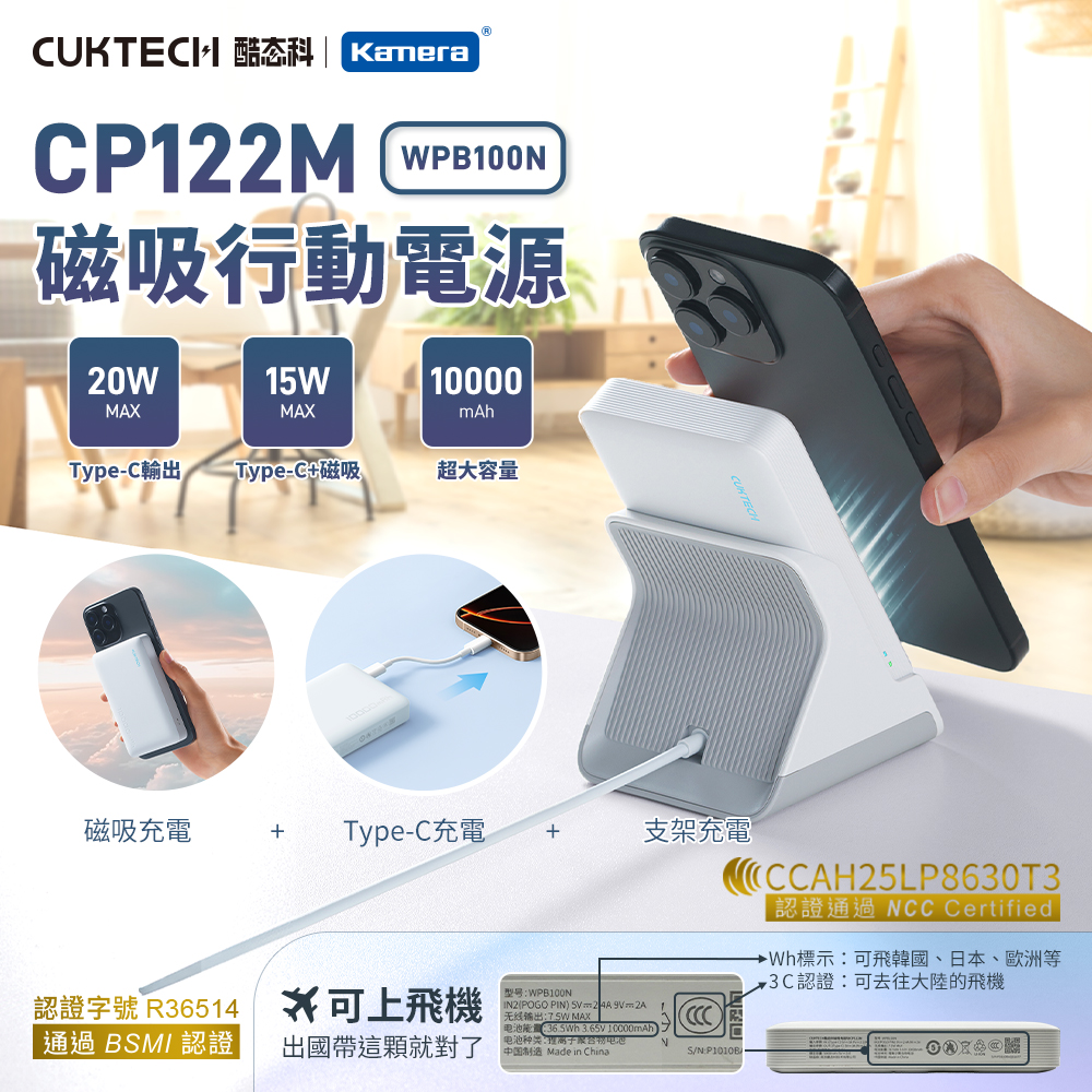 【Wh+CCC】CUKTECH 酷態科 CP122M 20W 磁吸行動電源帶支架款 10000mAh (WPB100N) - 灰色