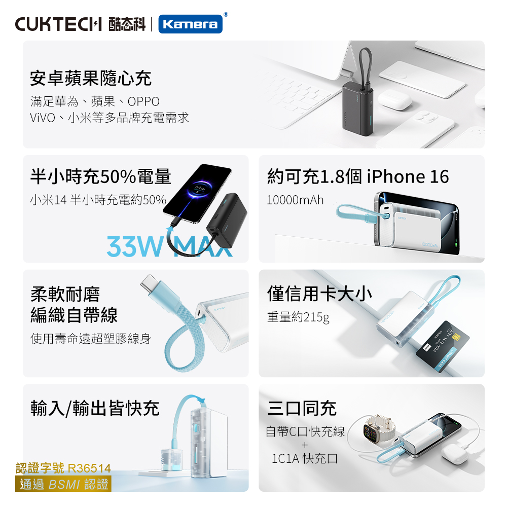 產品特點 ● 快充與多協議相容:單口最高可達 33W,支援平板與手機的高速充電,縮短等待時間,外出補電更有效率,相容主流快充協議(如 PD、QC 等),不同品牌與裝置皆能快速匹配,依不同裝置自動調整輸出,避免過充或供電不穩定,充得快也充得放心。● 三口同充+雙向快充:配置 1A1C+1C(自帶線),可同時為三台裝置充電,手機、平板、耳機一次搞定,省去輪流等待的麻煩,不僅能快速為裝置補電,行動電源也能快充補電,大幅縮短充電時間,出門前快速滿電更方便。● 單口輸出達 33W MAX:單一輸出最高可達33W,高功率輸出同時搭配智慧晶片,確保電壓電流穩定,短時間即可補足大量電壓。● 自帶編織線:編織材質抗拉抗磨,使用壽命更長,自帶線隨拿即用,臨時充電不用再找線。● 10000mAh實用續航:平板手機通吃,能滿足多數智慧型手機1-2次以上的完整充電,外出一天也夠用。