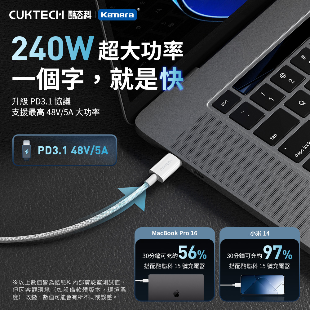 ● 240W超高功率快充,筆電、手機都能充!支援PD3.1協議,輸出最高可達240W(48V/5A),無論手機還是筆電,一線滿足你的高效快充需求。