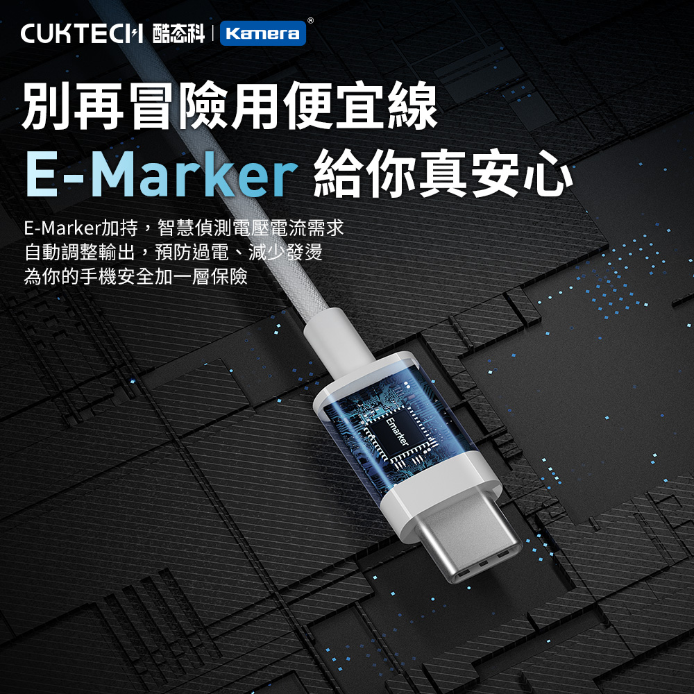 ● 內建E-Marker智慧晶片,充電更安心。能智慧辨識設備電壓與電流需求,穩定輸出、防止過充過熱,安全快充保護您的設備。