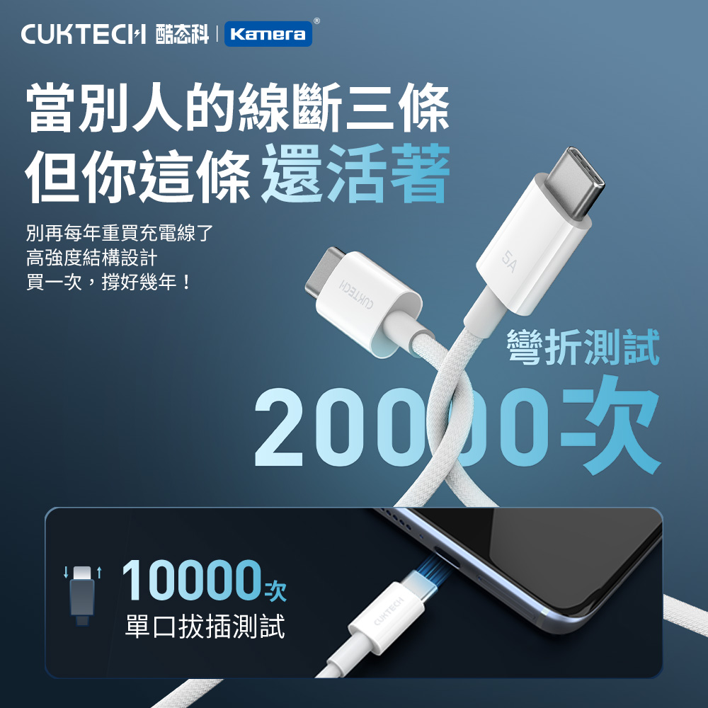● 用料實在,通過20,000次彎折+10,000次拔插壽命嚴苛測試,插拔彎折都不怕,用得久才是真的好。當別人的線斷三條,這條線還活著。