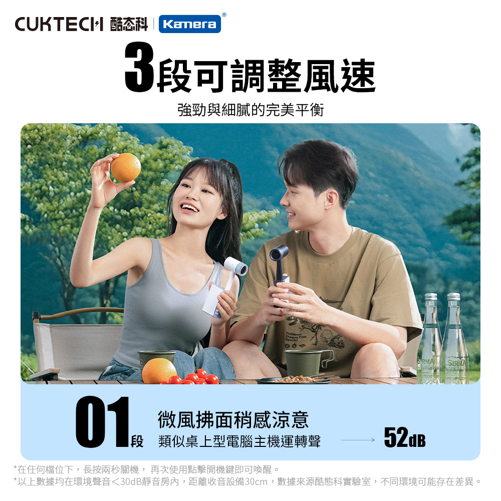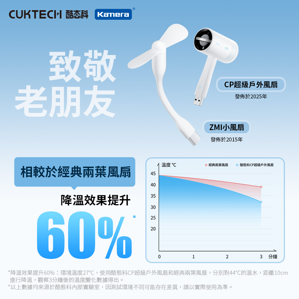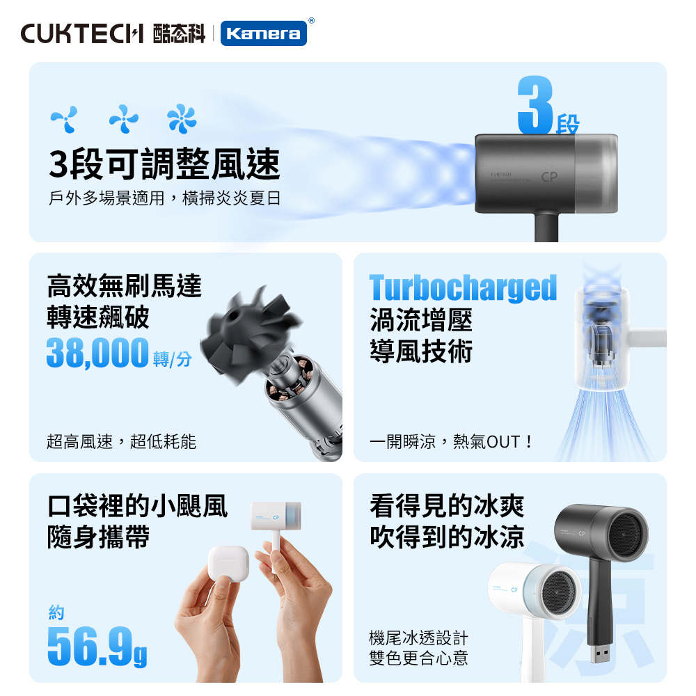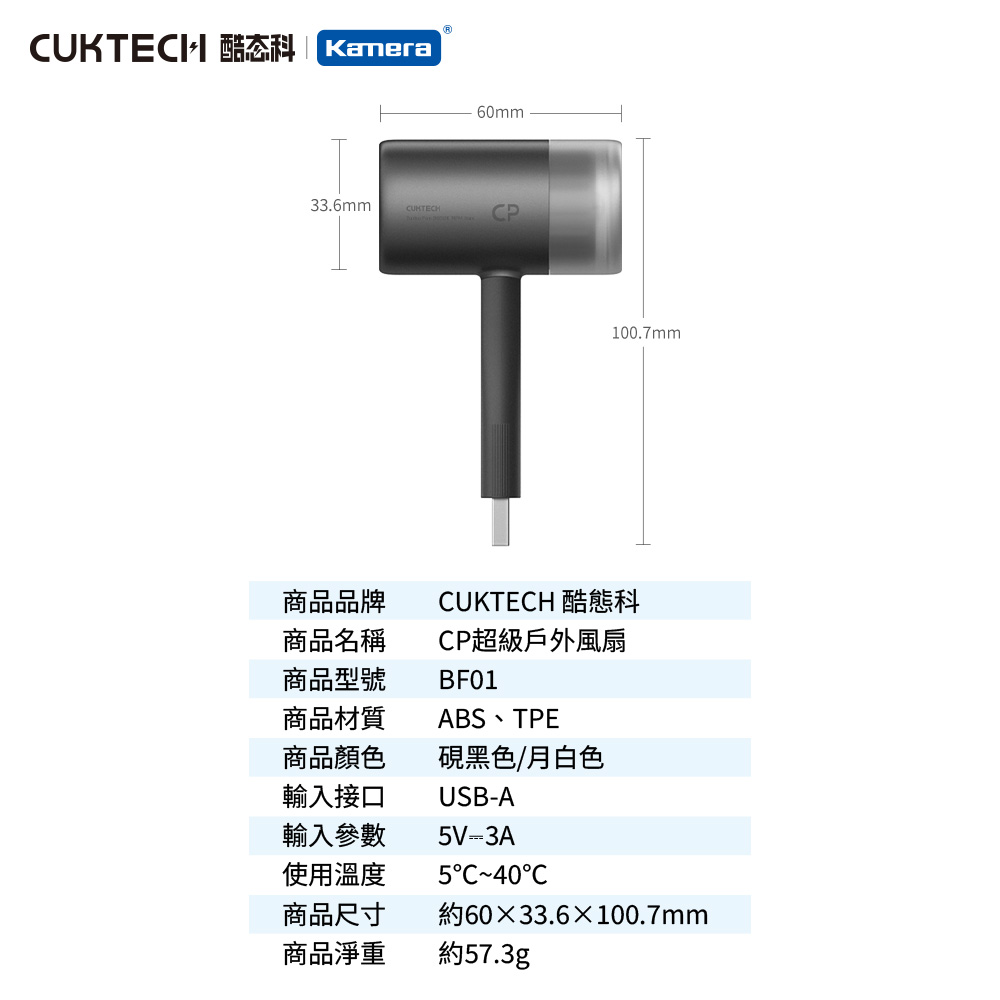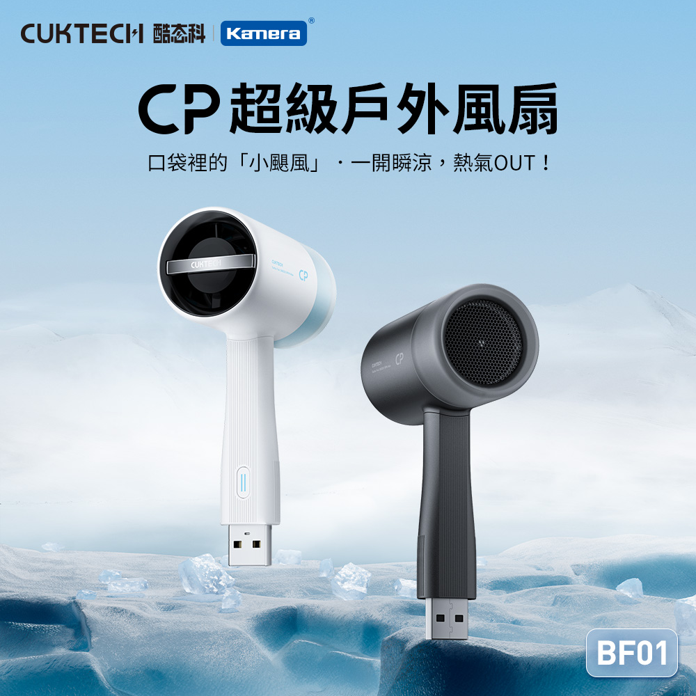💬 為什麼比別人貴?因為它真的不一樣。市面上便宜風扇很多,但吹不涼、電力虛、用幾次就壞的比比皆是。CUKTECH BF01 採用高階無刷電機、渦流增壓導風、智慧控溫芯片與冰透雙色質感設計,不只是享受涼風,而是每一個細節都做到「更好」。在體積上真正做到輕巧好攜帶,口袋就能收納攜帶,價格多一點,品質、性能、耐用度,卻高出一大截。真正重視使用體驗的人,一試就知道差異。產品特點● 一手掌握強風力,小機身也能掀起颶風級清涼!採用高速無刷電機,每分鐘高達38,000轉,風力強勁、風感集中,輕鬆對抗酷熱與汗水。● 想要真正涼,就不該只吹到一小塊。搭載9葉渦輪風扇,31415mm²超大風面,送風範圍更廣、力道更強,一吹就有感。● 渦流增壓導風技術,清涼直送。讓風更聚焦更穩定,即使走動或在戶外,也能穩穩吹出舒服的風感。● 體積小巧,無論是口袋、側背包、小包包都能輕鬆收納,逛街、露營、通勤超實用! ● 三段風速隨心選,適合多場景使用,橫掃炎炎夏日。無論您在忙、在動,都能選到最適合自己的風速。● 內建Flow Safety智慧芯片,風大也不燙手。自動控溫與過電流保護,長時間使用也安全不發熱,放口袋也不用擔心。● 無刷馬達+低噪音運轉,低調享受涼風不擾人。效能穩定,使用壽命長。● 冰透雙色設計,清涼感視覺化。極簡小巧的時尚外型,握在手上就是焦點,不只是降溫,更是夏日出門的潮流配件。這麼美的風扇,當然要吹給別人看!● 省電實測:搭配 CUKTECH PB100P 行動電源使用,連續開風30分鐘僅耗電4%,比你以為的還省電。● USB-A接口,不挑設備,就是這麼好用。相容各類充電設備,隨插即用。● 不只是吹風,更是你的夏日抗熱小幫手!不論是通勤、等車、戶外活動、停電備用,只要熱了,立刻拿出來涼起來!
