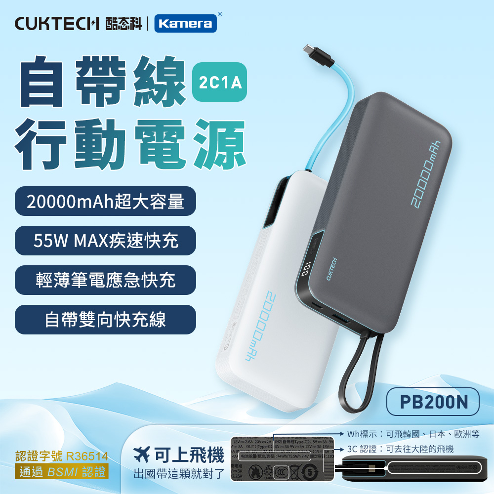 產品特點● 自帶Type-C雙向快充線:一條線搞定充放電,出門不怕忘記带線,隨手即用方便又省事。● 55W高效快充,筆電也能補電:支援最高55W PD快充,可為筆電丶iPad丶Switch等設備快速充電。相較常見20W/30W行動電源,效能大升級。● 超大容量20000mAh:可為手機充電3~5次以上,週末旅遊丶商務出差安心續航,滿足學生、上班族丶旅遊族不同場景的續航需求。● 智慧安全保護,使用更安心:多重安全防護設計,過充丶過放丶短路等完整防護,適用搭飛機(符合航空攜帶標準),符合旅遊族需求。● 精緻收納設計,輕鬆抽拉不卡卡:插槽式收線,拉出即用,收回俐落,適合追求美感與效率的用戶,設計簡約不花俏,更能符合對於科技感與實用性並重的審美。● Wh+CCC標示,可上飛機,搭乘中國航班沒問題。