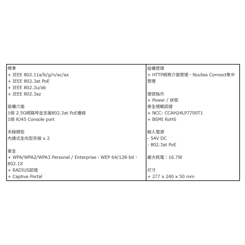 -1個2.5 Gigabit有線網路埠及1個2.5 Gigabit有線網路埠(PoE+)。