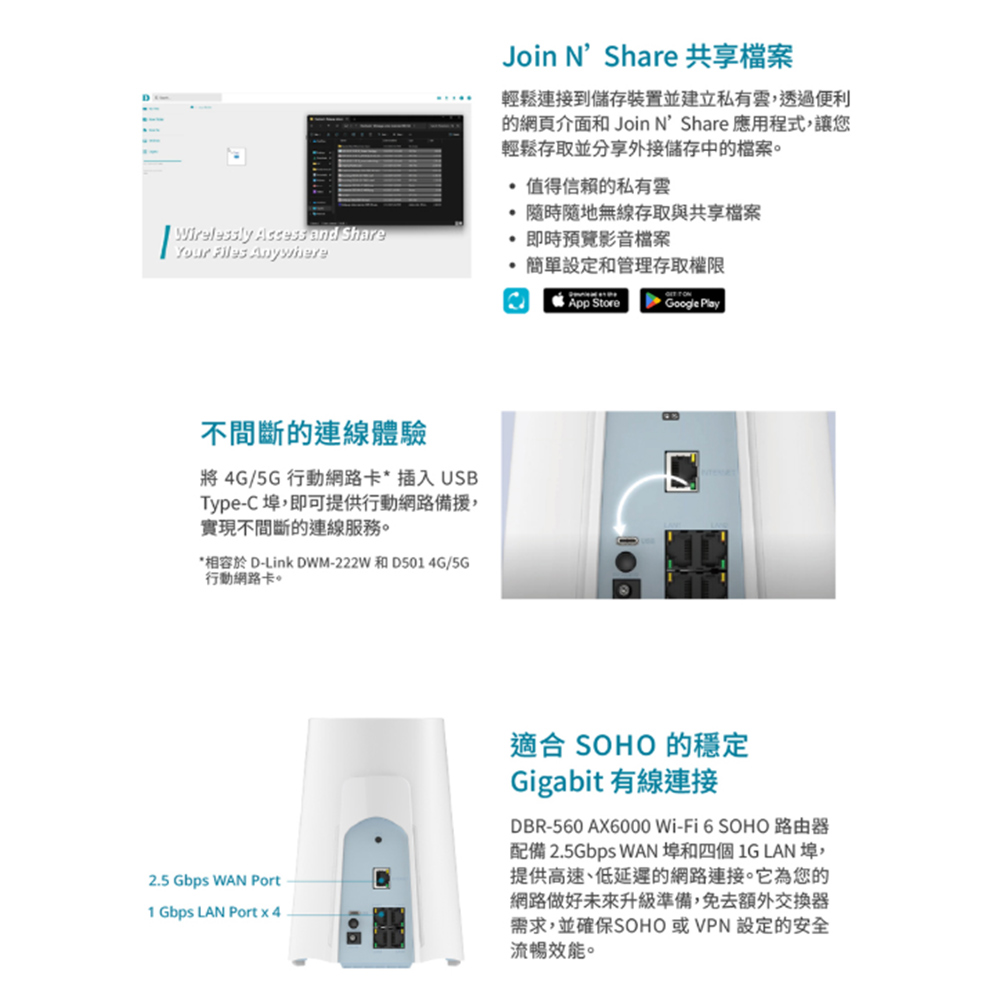 -多功能性,實現穩定連接 : 乙太網路WAN連接埠和用於4G/5G行動網路卡的USB連接埠提供備援的互聯網連接。