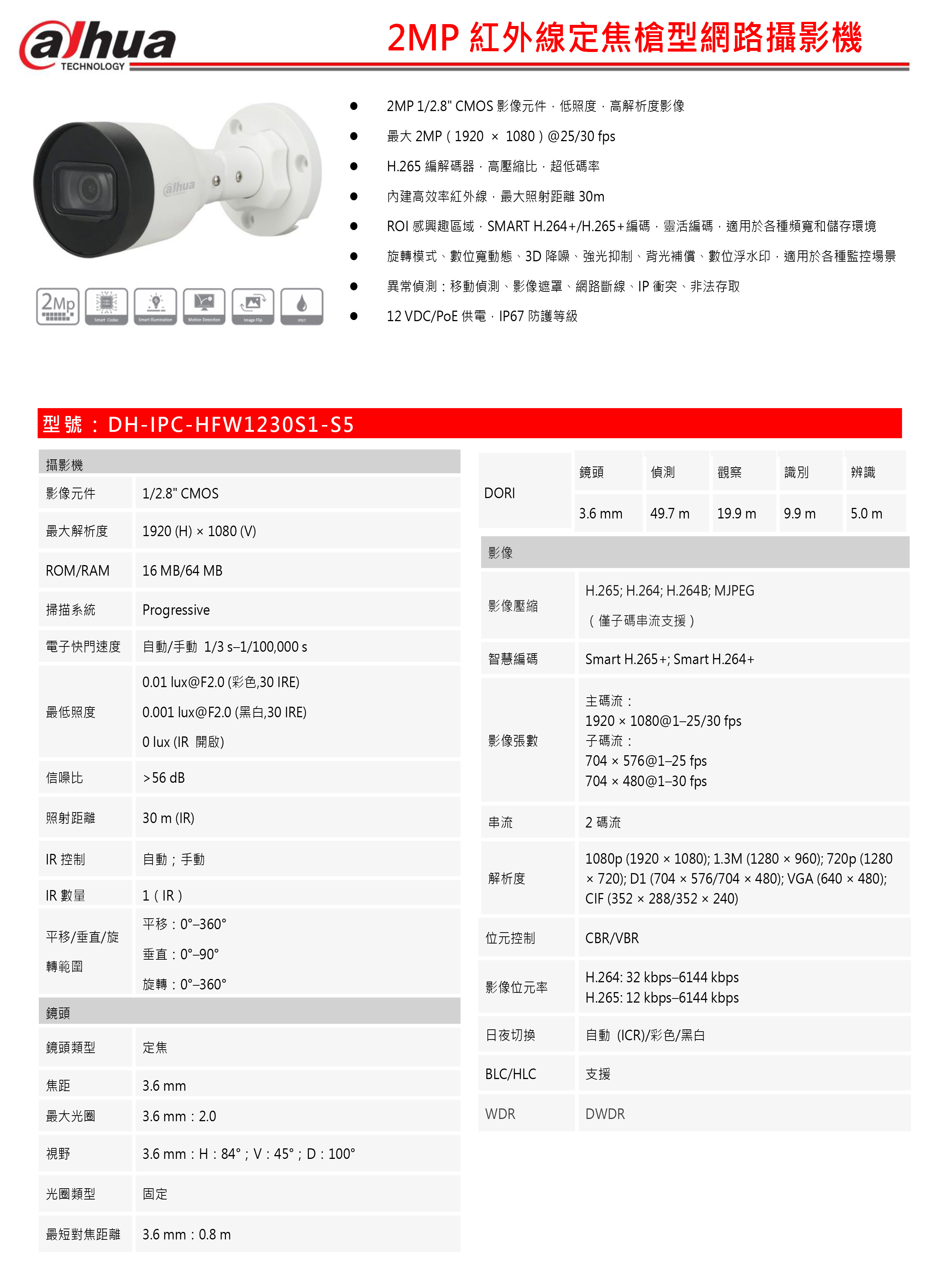 昌運監視器 大華 DH-IPC-HFW1230S1-S5 200萬紅外線槍型網路攝影機(以新款DH-IPC-HFW1230TC-A出貨)