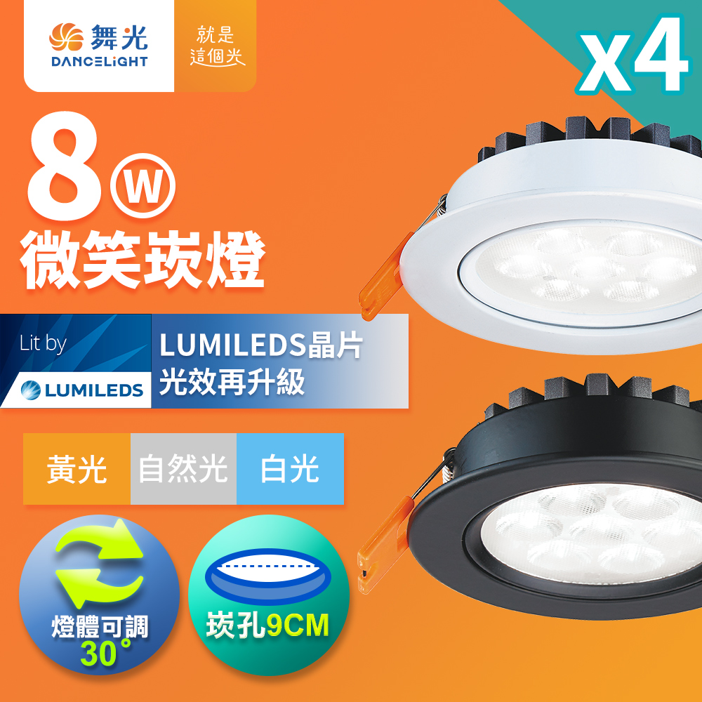 DanceLight舞光 4入組 可調角度LED微笑崁燈 8W坎燈 崁孔 9CM 時尚白/貴族黑(白光/自然光/黃光)