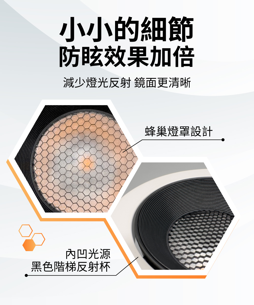 ⭐減少燈光反射的鏡面效果⭐蜂巢燈罩設計極佳防眩效果⭐黑色反射罩使光源投射更精準⭐讓落地窗外的夜景一覽無遺
