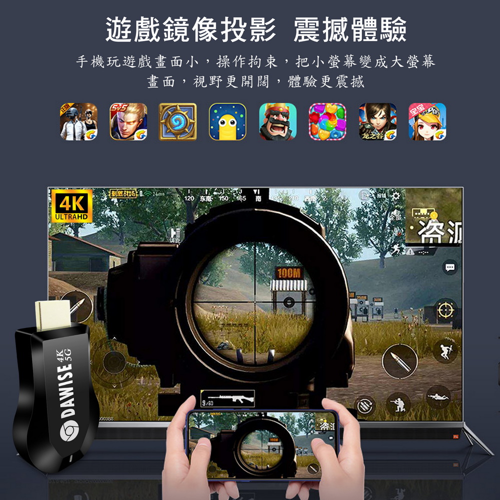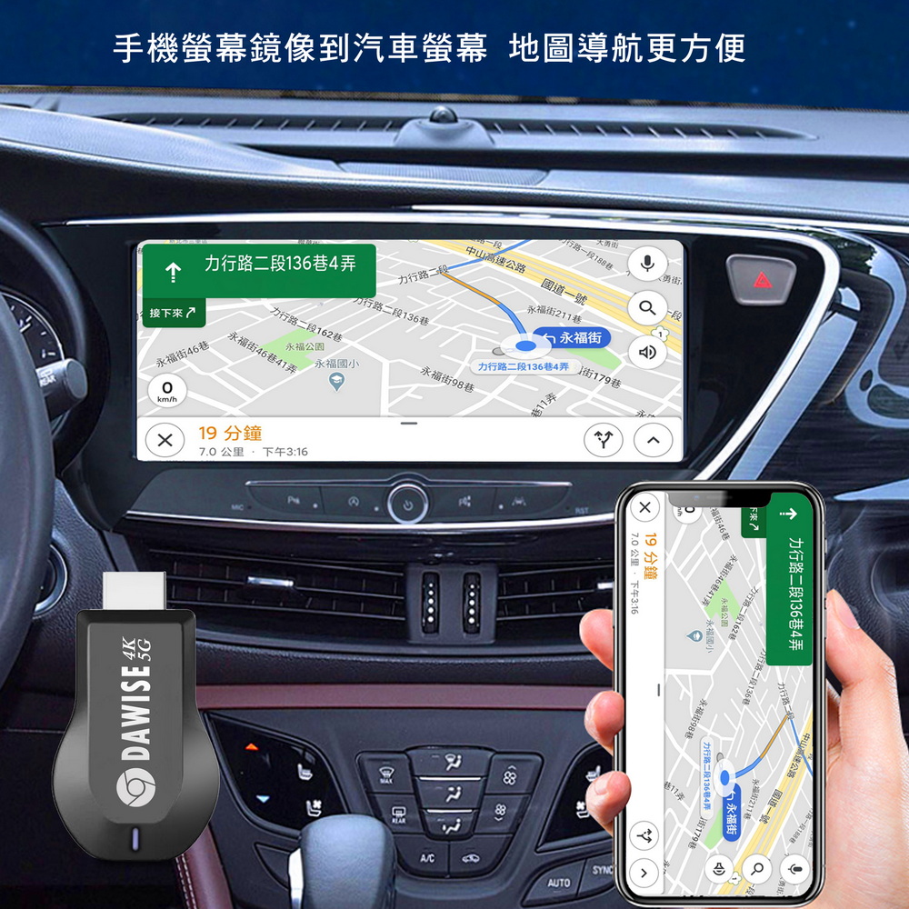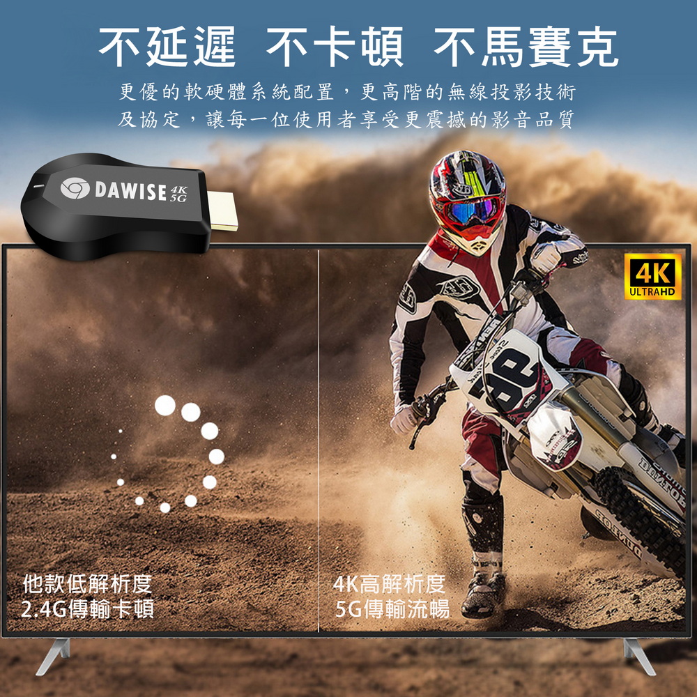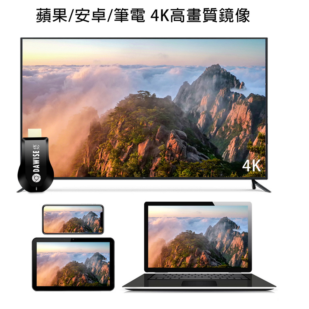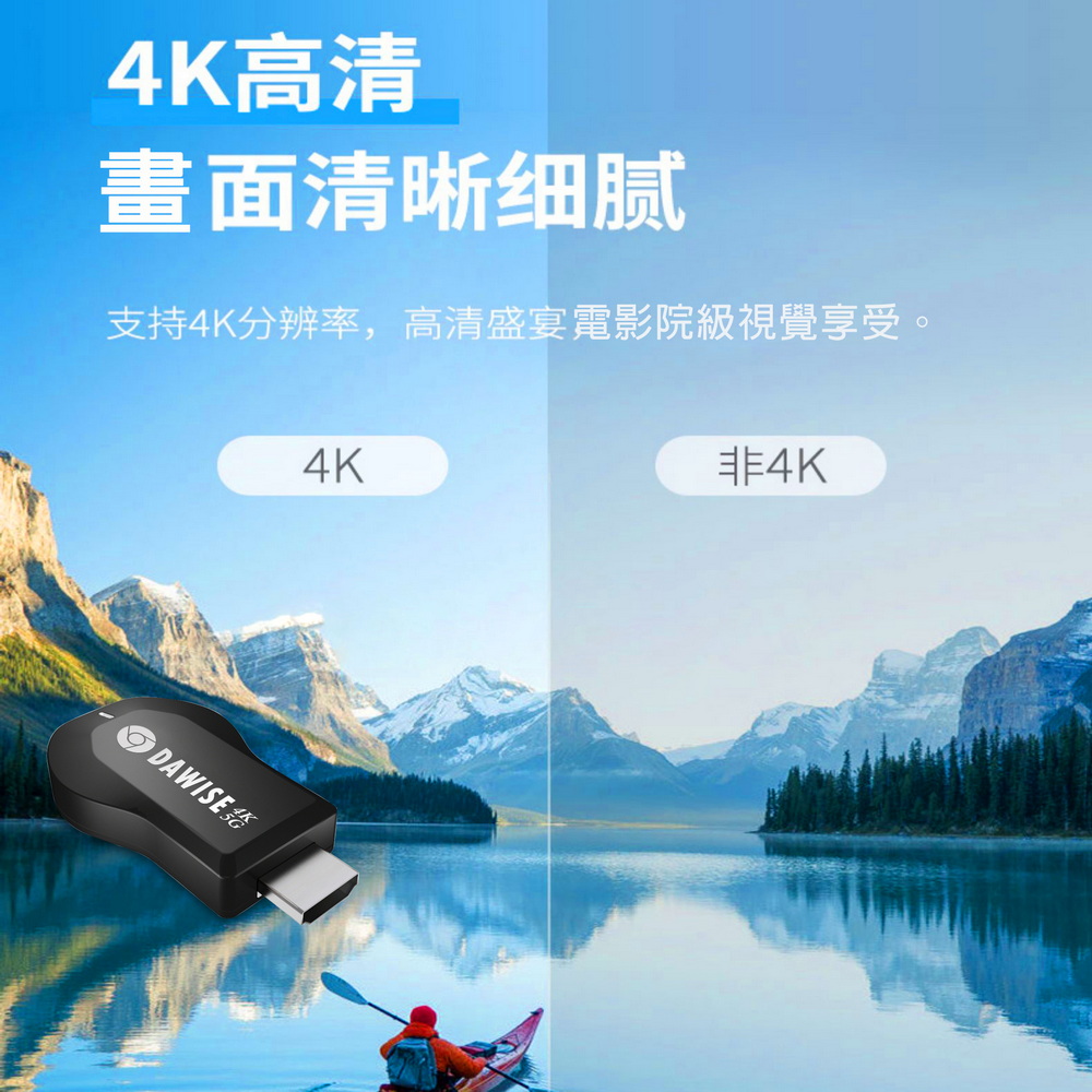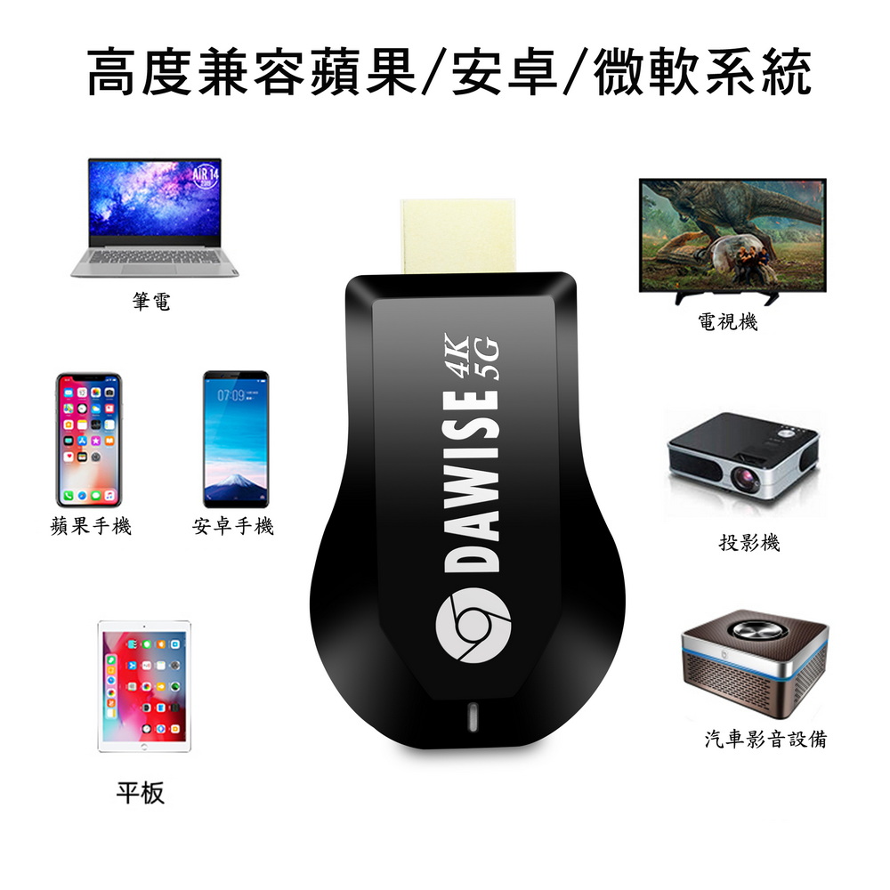 《商品特色》真正高畫質無線影音傳輸支持H.265高畫質無線投影操作簡單 影音投影■支援4K(3840×2160)超高清畫質■免安裝任何軟體■無線連結,影音同步分享■支援蘋果/安卓/電腦無線投影顯示■可電腦直接電視同步顯示■支持Airplay/Miracast/WIDI/DLNA影音同步傳輸模式《商品介紹》隨著智慧型裝置普及,手機、平板、電腦已成為日常不可或缺的工具。但螢幕太小往往影響學習與娛樂體驗。現在,只要一個 無線投影器,就能輕鬆將螢幕畫面同步到電視或投影機,大螢幕享受更清晰、更震撼!隨插即投:操作簡單,免驅動免APP。跨平台支援:支援 iOS / Android / Windows / Mac OS。高畫質輸出:清晰畫質 ,清晰不卡頓。穩定傳輸:低延遲設計,影音同步。輕巧便攜:出差、上課、居家,一機搞定。【應用場景】居家娛樂:追劇、看電影,大螢幕更沉浸。遊戲對戰:手機秒變遊戲主機,刺激加倍。教育教學:課堂同步投影,互動更生動。會議簡報:商務展示更專業,告別繁瑣連線。汽車導航:手機地圖投影到大螢幕,安全又直觀。《注意事項》1.如果要使用在汽車的螢幕投影,請先確認汽車是否有HDMI或AV影音輸入,請確認後再進行購買。2. 本商品是HDMI影音傳輸介面,如果是汽車是AV(黃白紅三色插孔)則需要另外自行準備HDMI轉AV的轉換器才可以使用。《商品配備》無線影音鏡像傳輸器 x1WiFi模組線x1說明書 x14大好禮: USB充電器x1 + HDMI傳輸線x1 + HDMI母對母轉接頭x1 + 手機支架x1《商品規格》廠牌: Dawise型號: WD66顏色: 黑支援的設備: 蘋果,安卓,微軟裝置支援影音同步傳輸模式: AirPlay/Miracast/DLNA/WIDIUSB供電(DC+5V)HDMI連接電視產地: 中國大陸產品保固: 主機保固3個月,配件/贈品保固1個月,保固範圍不包含人為損壞。《NCC認證字號》 CCAJ14LP398FT7
