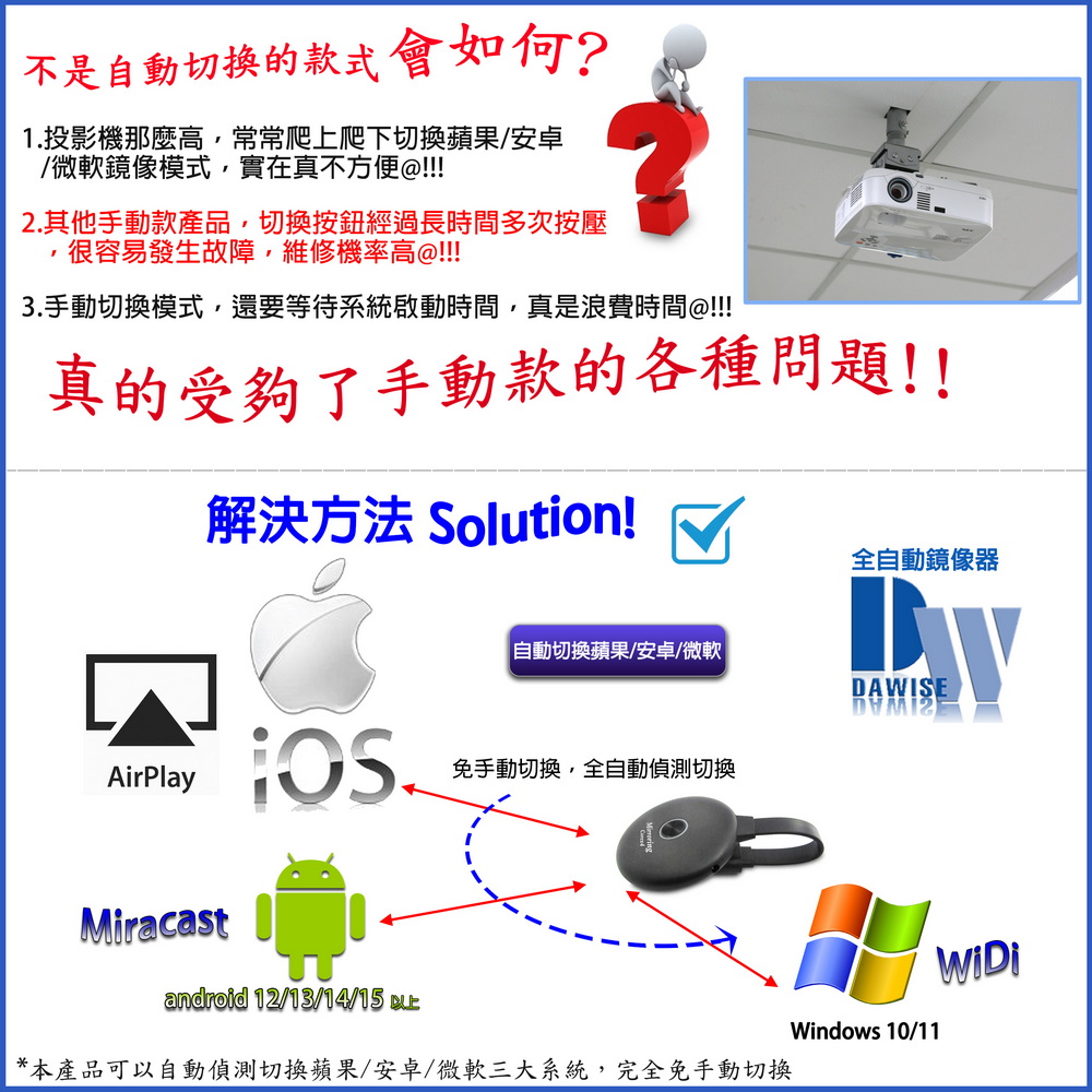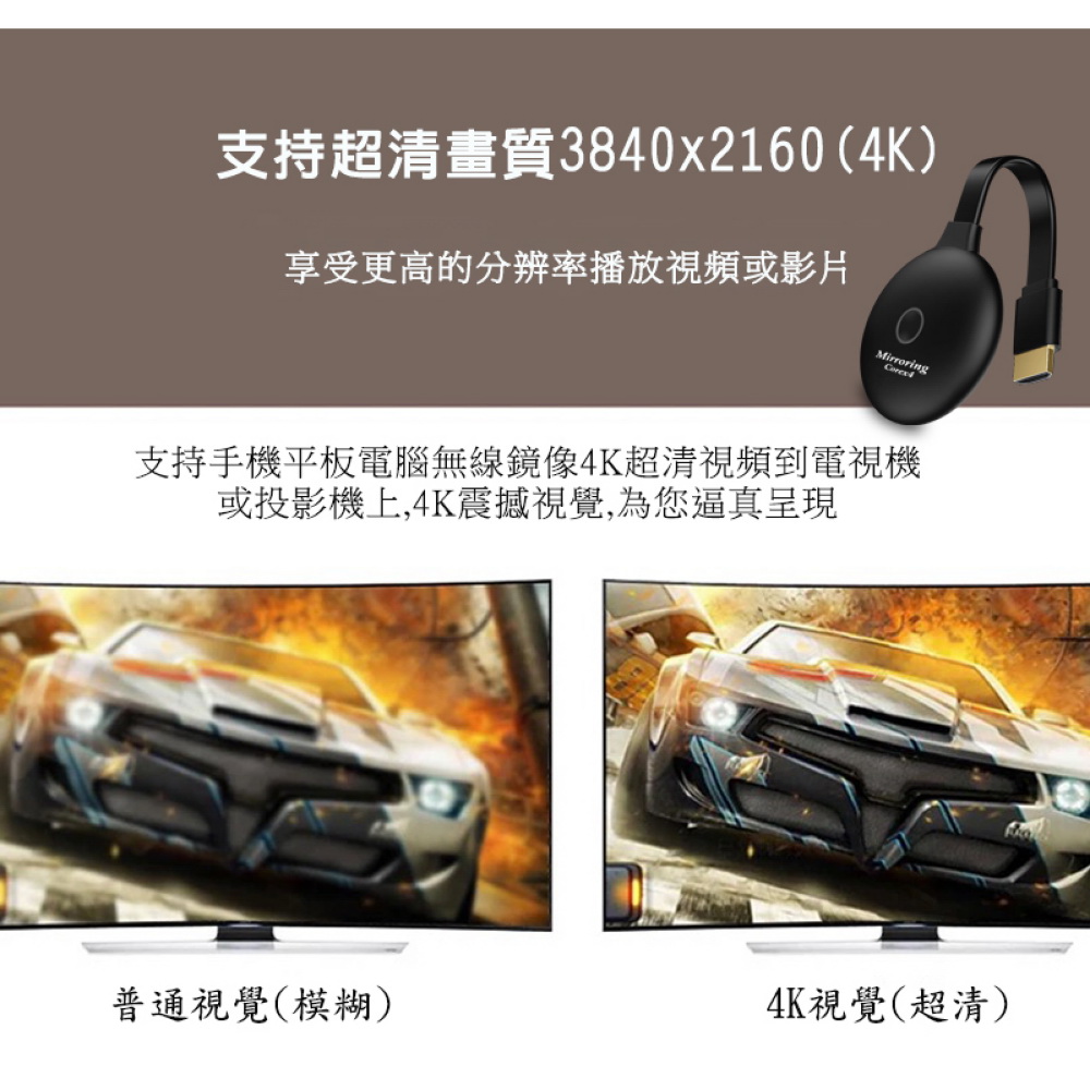 《商品特色》真正高畫質無線影音傳輸支持H.265高畫質無線投影操作簡單 影音投影■支援4K(3840×2160)超高清畫質■免安裝任何軟體■無線連結,影音同步分享■支援蘋果/安卓/電腦無線投影顯示■可電腦直接電視同步顯示■支持Airplay/Miracast/WIDI/DLNA影音同步傳輸模式《商品介紹》隨著智慧型裝置普及,手機、平板、電腦已成為日常不可或缺的工具。但螢幕太小往往影響學習與娛樂體驗。現在,只要一個 無線投影器,就能輕鬆將螢幕畫面同步到電視或投影機,大螢幕享受更清晰、更震撼!隨插即投:操作簡單,免驅動免APP。跨平台支援:支援 iOS / Android / Windows / Mac OS。高畫質輸出:清晰畫質 ,清晰不卡頓。穩定傳輸:低延遲設計,影音同步。輕巧便攜:出差、上課、居家,一機搞定。【應用場景】居家娛樂:追劇、看電影,大螢幕更沉浸。遊戲對戰:手機秒變遊戲主機,刺激加倍。教育教學:課堂同步投影,互動更生動。會議簡報:商務展示更專業,告別繁瑣連線。汽車導航:手機地圖投影到大螢幕,安全又直觀。《注意事項》1.如果要使用在汽車的螢幕投影,請先確認汽車是否有HDMI或AV影音輸入,請確認後再進行購買。2. 本商品是HDMI影音傳輸介面,如果是汽車是AV(黃白紅三色插孔)則需要另外自行準備HDMI轉AV的轉換器才可以使用。《商品配備》無線影音鏡像傳輸器 x1WiFi模組線x1說明書 x14大好禮: USB充電器x1 + HDMI傳輸線x1 + HDMI母對母轉接頭x1 + 手機支架x1《商品規格》廠牌: Dawise型號: 第十代PT59顏色: 黑支援的設備: 蘋果,安卓,微軟裝置支援影音同步傳輸模式: AirPlay/Miracast/DLNA/WIDIUSB供電(DC+5V)HDMI連接電視產地: 中國大陸產品保固: 主機保固3個月,配件/贈品保固1個月,保固範圍不包含人為損壞。《NCC認證字號》CCAJ18LP16B4T8