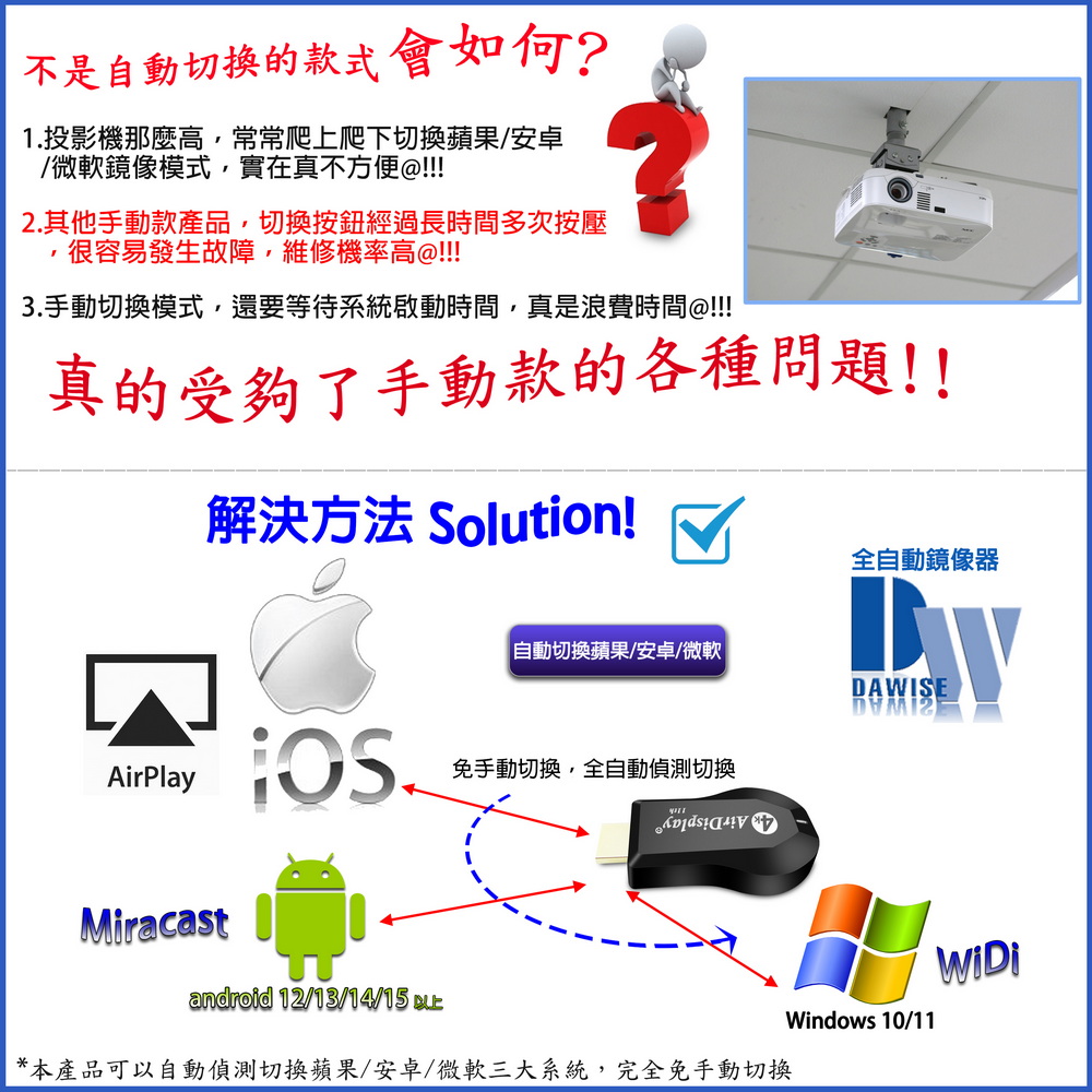《商品特色》真正高畫質無線影音傳輸支持H.265高畫質無線投影操作簡單 影音投影■支援4K(3840×2160)超高清畫質■免安裝任何軟體■無線連結,影音同步分享■支援蘋果/安卓/電腦無線投影顯示■可電腦直接電視同步顯示■支持Airplay/Miracast/WIDI/DLNA影音同步傳輸模式《商品介紹》隨著智慧型裝置普及,手機、平板、電腦已成為日常不可或缺的工具。但螢幕太小往往影響學習與娛樂體驗。現在,只要一個 無線投影器,就能輕鬆將螢幕畫面同步到電視或投影機,大螢幕享受更清晰、更震撼!隨插即投:操作簡單,免驅動免APP。跨平台支援:支援 iOS / Android / Windows / Mac OS。高畫質輸出:清晰畫質 ,清晰不卡頓。穩定傳輸:低延遲設計,影音同步。輕巧便攜:出差、上課、居家,一機搞定。【應用場景】居家娛樂:追劇、看電影,大螢幕更沉浸。遊戲對戰:手機秒變遊戲主機,刺激加倍。教育教學:課堂同步投影,互動更生動。會議簡報:商務展示更專業,告別繁瑣連線。汽車導航:手機地圖投影到大螢幕,安全又直觀。《注意事項》1.如果要使用在汽車的螢幕投影,請先確認汽車是否有HDMI或AV影音輸入,請確認後再進行購買。2. 本商品是HDMI影音傳輸介面,如果是汽車是AV(黃白紅三色插孔)則需要另外自行準備HDMI轉AV的轉換器才可以使用。《商品配備》無線影音鏡像傳輸器 x1WiFi模組線x1說明書 x14大好禮: USB充電器x1 + HDMI傳輸線x1 + HDMI母對母轉接頭x1 + 手機支架x1《商品規格》廠牌: Dawise型號: 第11代WD65顏色: 黑支援的設備: 蘋果,安卓,微軟裝置支援影音同步傳輸模式: AirPlay/Miracast/DLNA/WIDIUSB供電(DC+5V)HDMI連接電視產地: 中國大陸產品保固: 主機保固3個月,配件/贈品保固1個月,保固範圍不包含人為損壞。《NCC認證字號》CCAJ14LP398ET5